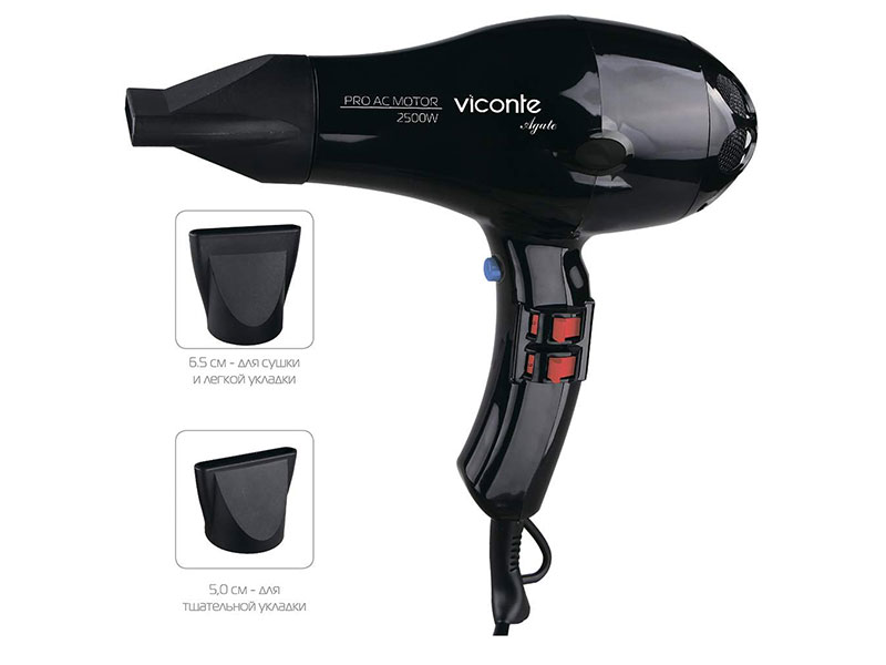 Фен vc-3726 2500вт.цв.в ассортим.. Материал пластик Бренд Viconte Страна КИТАЙ Мощность – 2500 Вт - 2 скорости воздушного потока - 3 температурных режима - Корпус из высококачественного пластика - Функция холодного воздуха - Петелька для подвешивания - 2 концентратора - Вращающийся шнур - Цвет: чёрный
