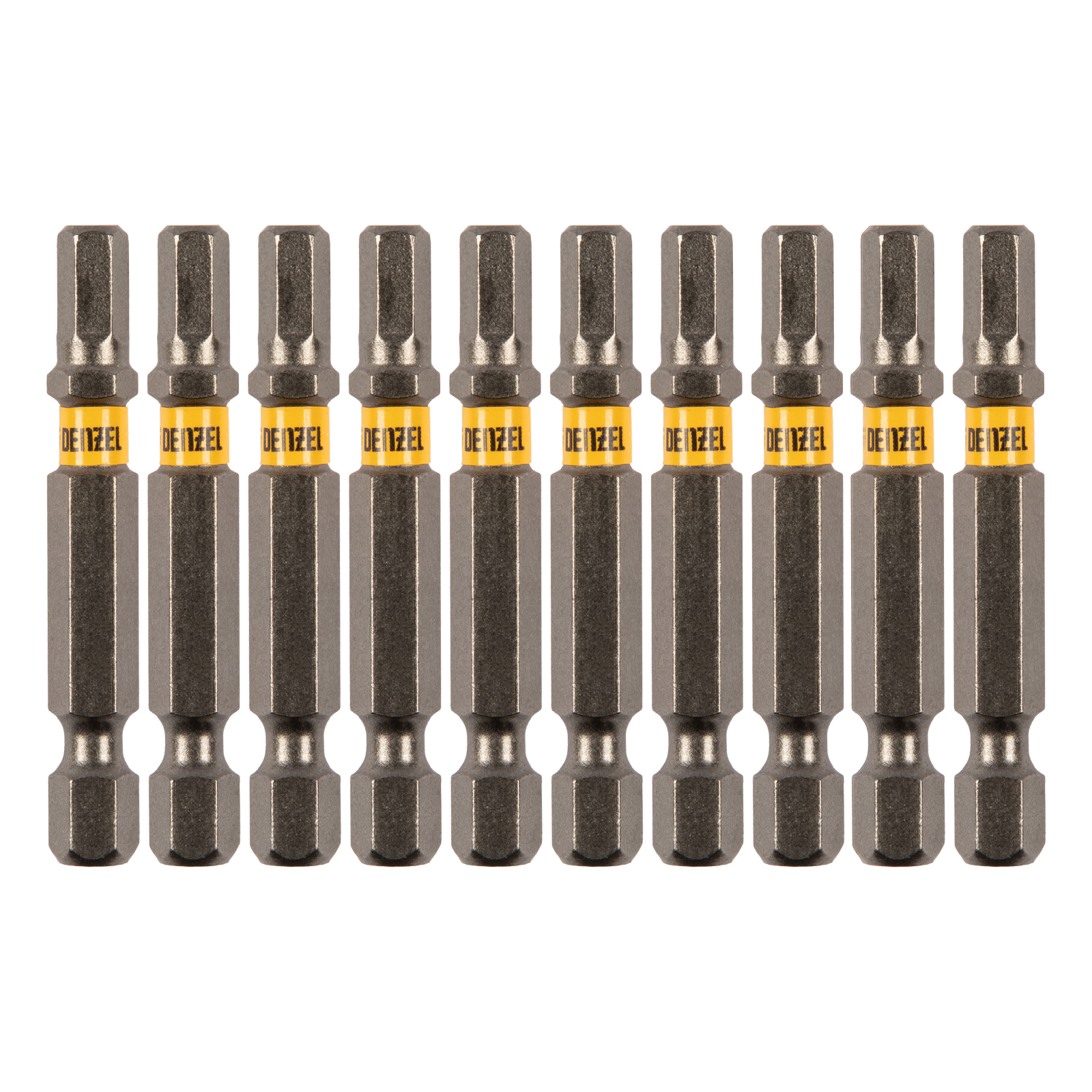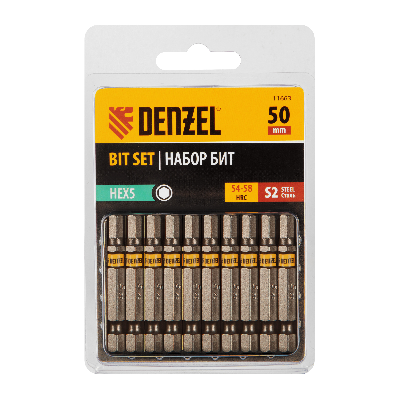 Бита hex 5х50, сталь s2, шестигранный профиль, 10 шт. е 6,3 denzel. Бренд: DENZEL Материал биты: легированная S2 Наконечник: HEX5 Особенности: магнитные свойства, профессиональные, шестигранные Размер хвостовика: 1u002F4 Тип хвостовика: шестигранный Страна производства: Тайвань Длина, мм: 50 Тип упаковки: двойной блистер Длина в упаковке, мм: 127 Ширина в упаковке, мм: 85 Вес (брутто), кг: 0.124 Биты HEX5x50 мм: 10 шт Набор бит HEX 5 х 50 мм Denzel 11663 включает в себя 10 сменных насадок из стали S2, с шестигранным хвостовиком 1/4, которые используются в качестве оснастки на шуруповертах. Биты типоразмера HEX5 предназначены для монтажа и демонтажа мебельных и велосипедных евровинтов. Шестигранный шлиц обеспечивает большую площадь соприкосновения с крепежом, что позволяет увеличить крутящий момент без риска повреждения биты. Длина насадок 50 мм позволяет с удобством работать в ограниченном пространстве и в труднодоступных местах. Преимущества Устойчивость к деформации при высоких нагрузках — биты изготовлены из японской легированной стали S2 и закалены до твердости 58 HRC. Высокоточное исполнение — оптимальная геометрия шлица и максимальный контроль на производстве в Тайване позволили добиться выверенности каждой биты и предотвратить проскальзывание рабочей части в головке крепежа. Удобная эксплуатация — намагниченный шлиц облегчает работу и позволяет направлять шуруповерт с насаженным крепежом одной рукой, а другой придерживать закрепляемую деталь. Антикоррозионные свойства — никелированное покрытие увеличивает срок службы насадок. Защита от подделок — цветное кольцо с логотипом ТМ Denzel на каждой бите подтверждает оригинальность товара. 10 бит в комплекте — набора хватит на целую бригаду. Удобная упаковка — оснастка поставляется в двойном блистере с европодвесом.  развернуть описание ▼