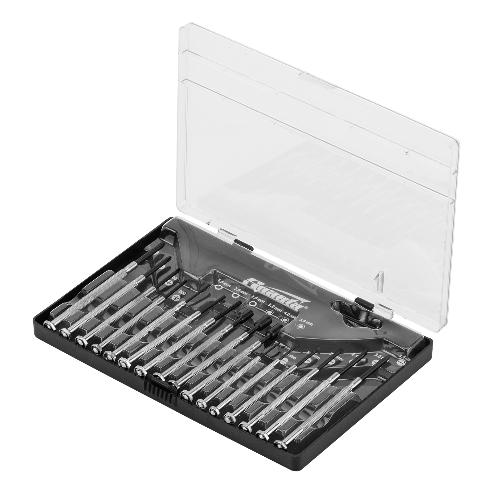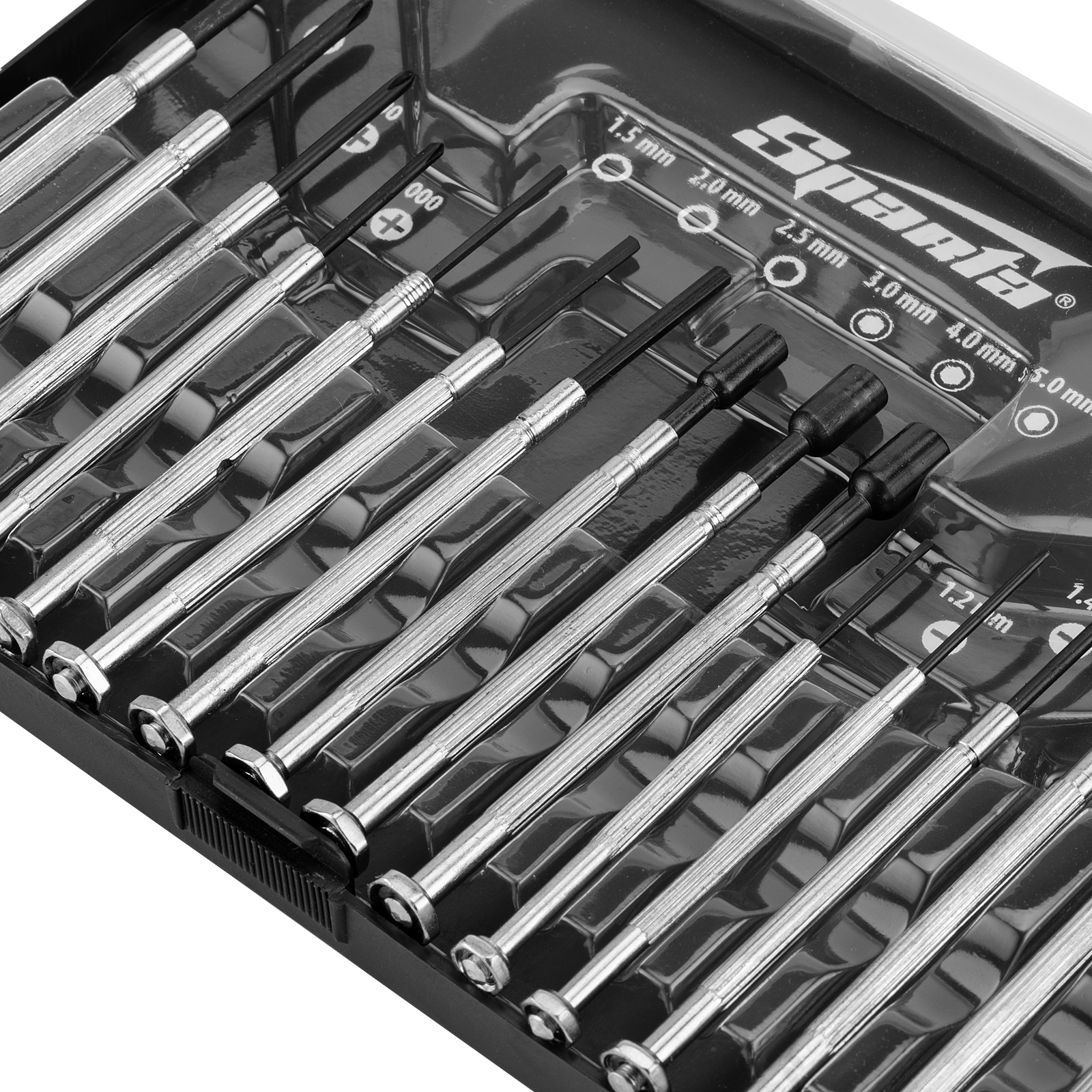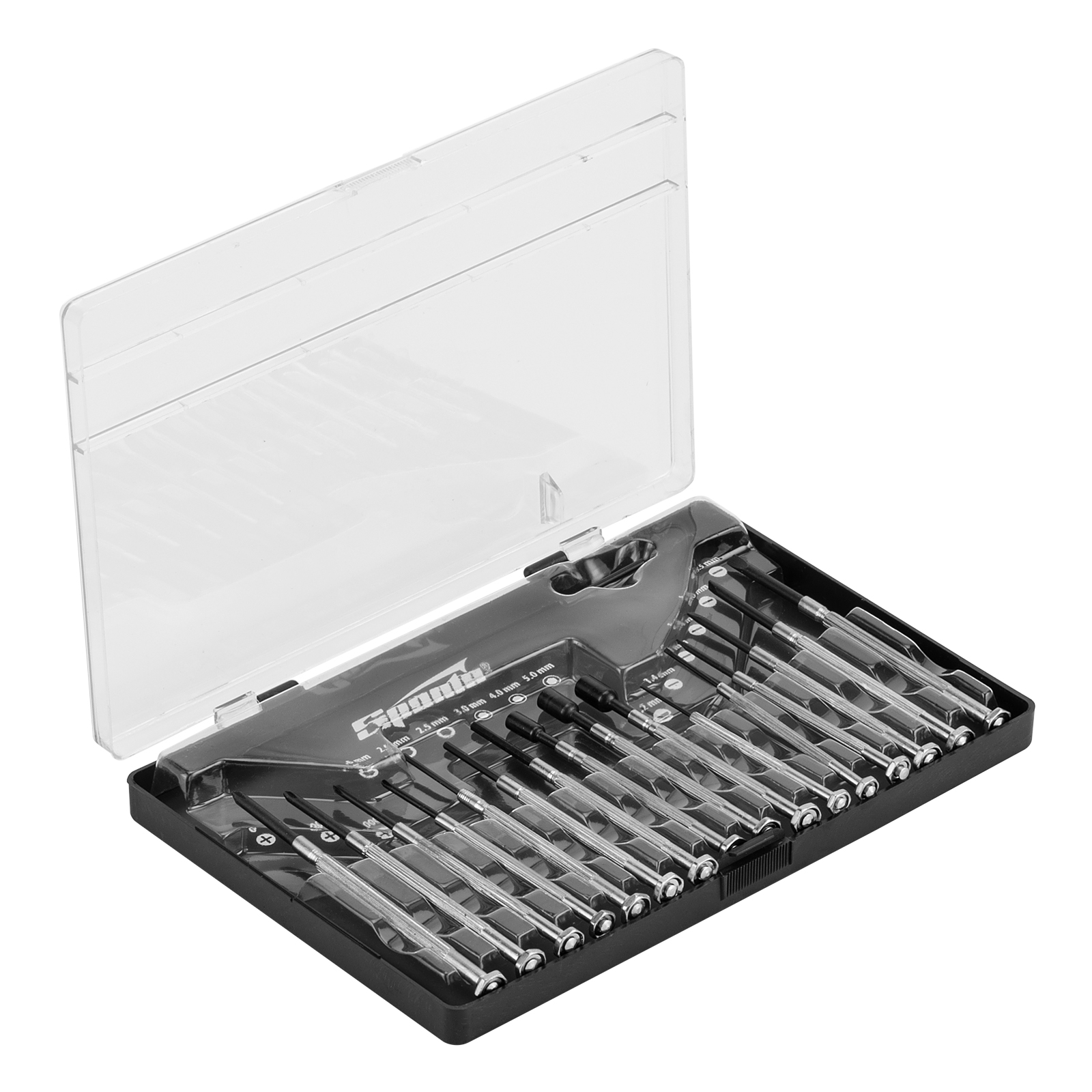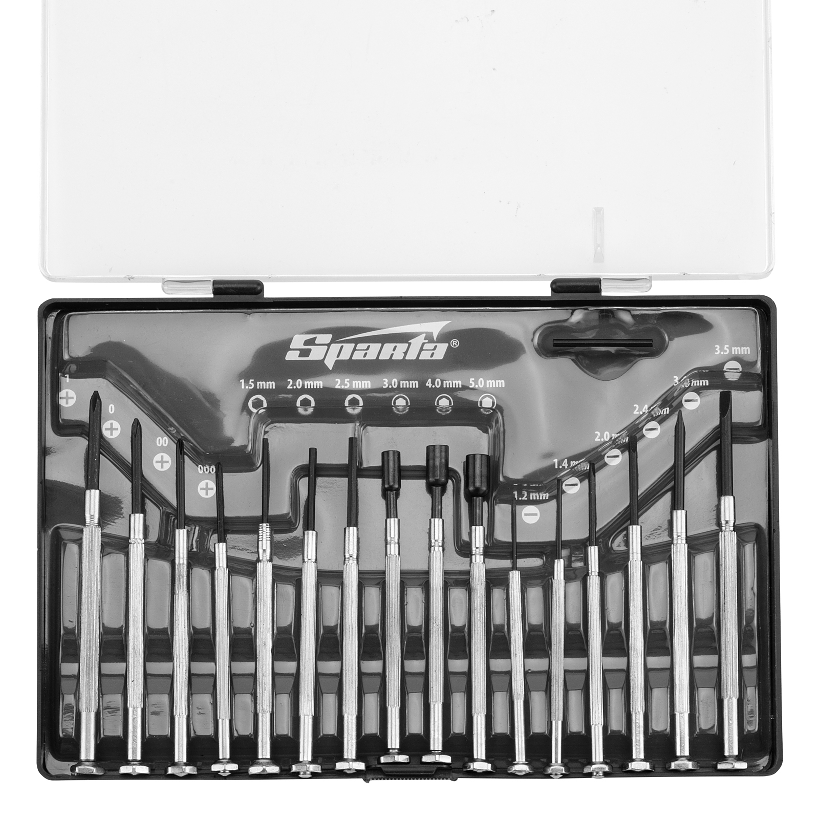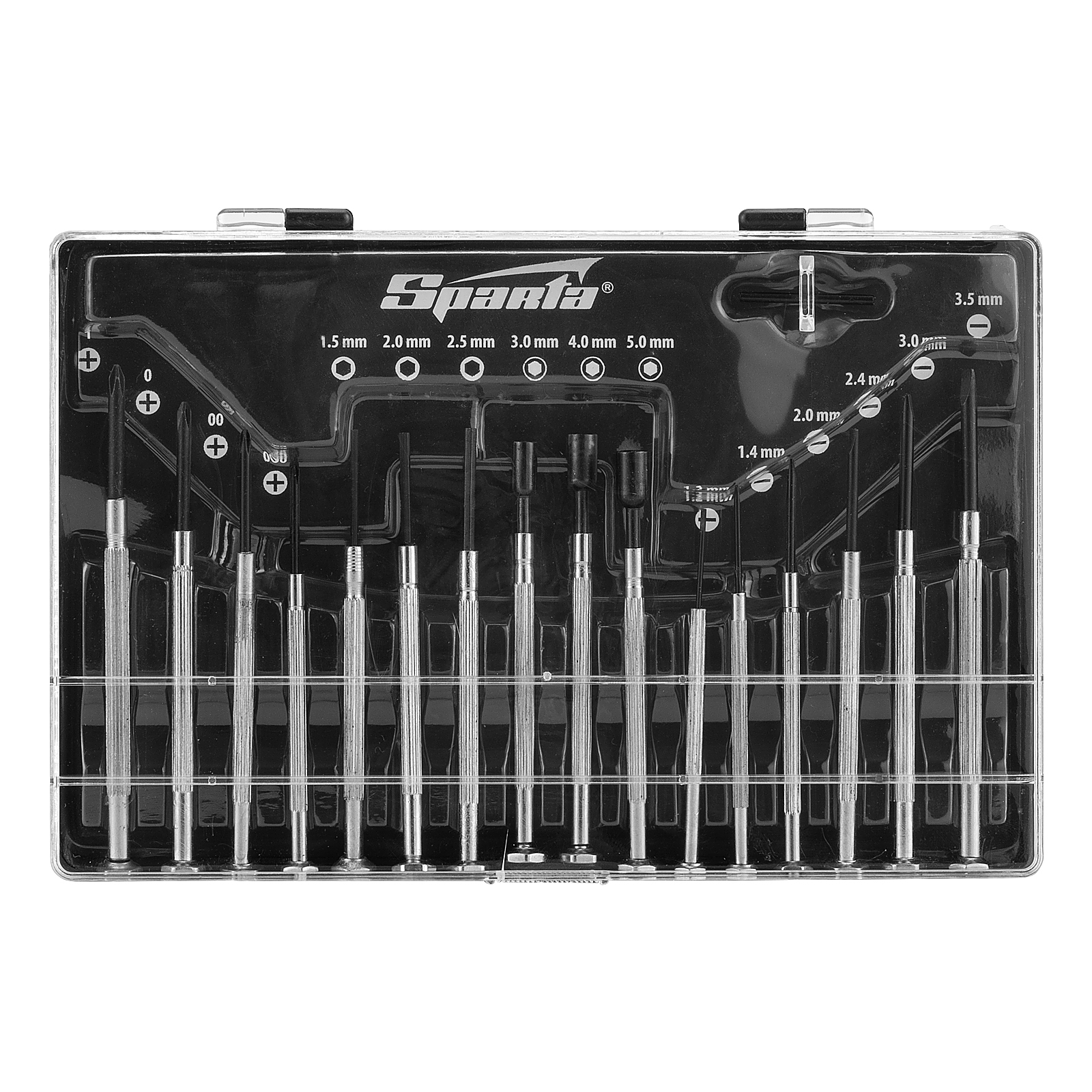 Набор отверток для точной механики, 16 шт, sparta. Бренд: Sparta Материал стержня: углеродистая сталь Типы шлицов в набор: SLu002FPHu002FHEX Страна производства: Китай Тип упаковки: пластиковый кейс Длина в упаковке, мм: 145 Высота в упаковке, мм: 210 Вес (брутто), кг: 0.3 Отвертки для точной механики: РН000, РН00, РН0, РН1, SL1.2, SL1.4, SL2, SL2.4, SL3, SL3.5, H1.5, H2, H2.5: 13 шт Торцевые головки: 3, 4, 5: 3 шт Пластиковый кейс: 1 шт Набор отверток для точной механики Sparta 11783, 16 предметов., пригодится при монтаже/демонтаже микровинтов с профилем SL, PH, HEX. Недорогой и качественный набор будет полезен дома и на даче. С его помощью можно починить мелкие бытовые приборы, часы, детские игрушки и т.д. Преимущества Стержни из углеродистой стали обеспечивают инструментам необходимые прочностные характеристики. Вращающиеся затыльники в верхней части рукояток повышают удобство и точность проводимых работ. Специальное рифление на рукоятках обеспечивает антискользящий эффект для комфортной работы. Детали набора размещены в пластиковом кейсе с индивидуальными держателями, что обеспечивает безопасное хранение и транспортировку. Маркировка типоразмеров в боксе позволяет быстро подобрать нужную отвертку.  развернуть описание ▼
