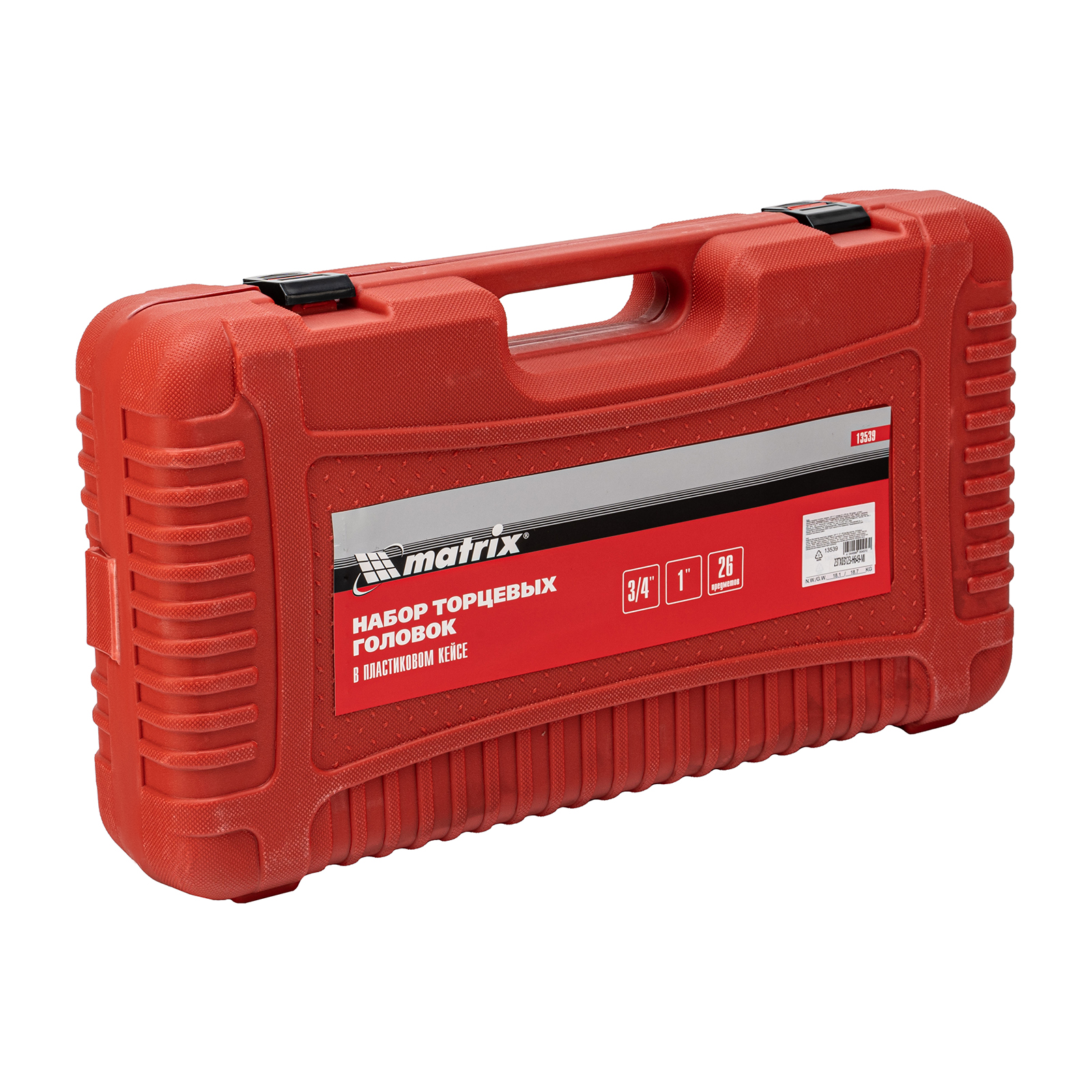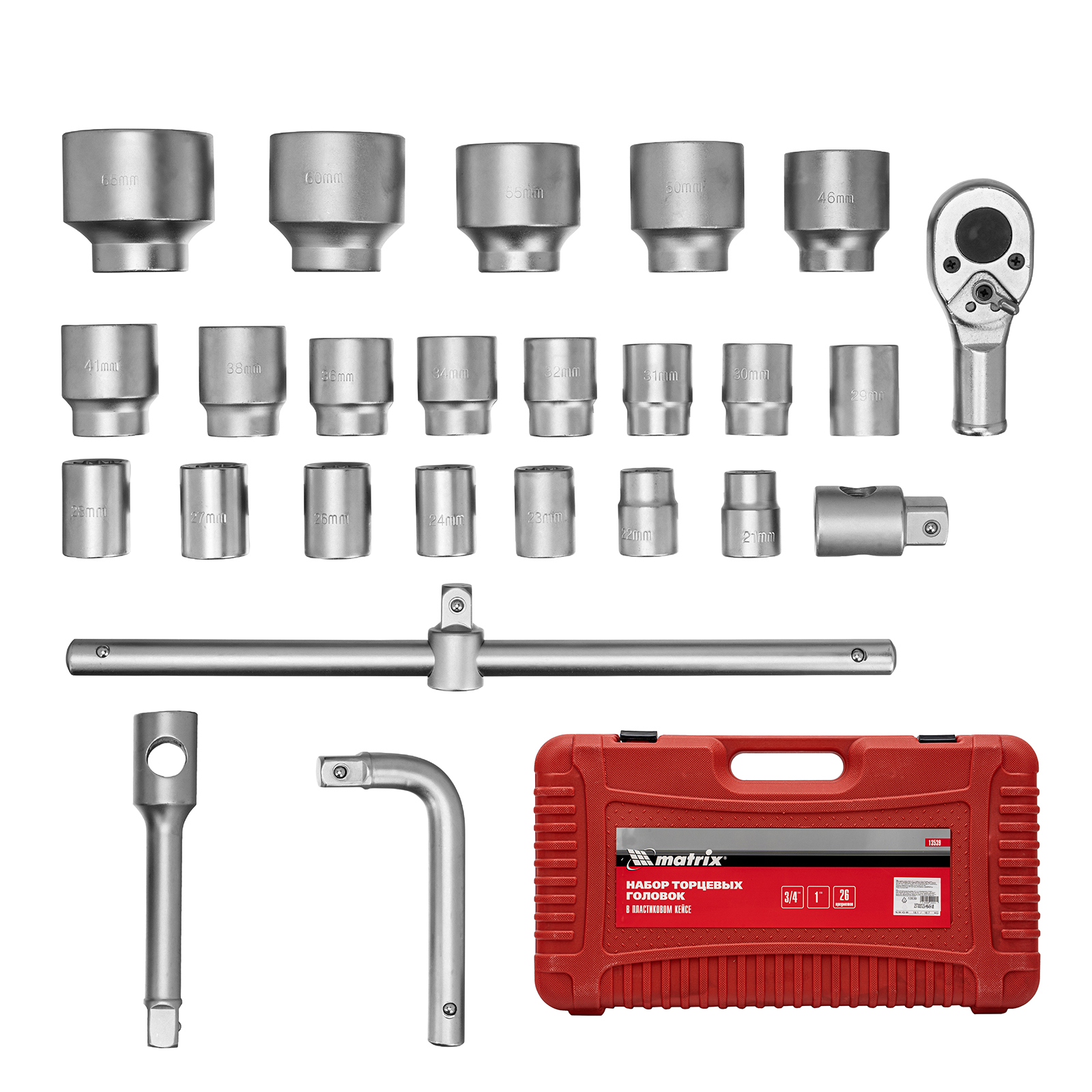 Набор торцевых головок 3/4–1, головки 21 х 65 мм, 26 предметов, в пласт. боксе matrix. Бренд: Matrix Тип замка: пластик Страна производства: Китай Длина в упаковке, мм: 560 Ширина в упаковке, мм: 330 Высота в упаковке, мм: 140 Вес (брутто), кг: 19.5 Удлинитель 190, 510: 2 шт Головки 21, 22, 23, 24, 26, 27, 28, 29, 30, 31, 32, 34, 36, 38, 41, 46, 50, 55, 60, 65: 20 шт Кейс: 1 шт Набор торцевых головок Matrix 13539 с присоединительным квадратом 3/4 и 12-гранным профилем, с переходником на 1, используется для работы с резьбовыми крепежными элементами размером от 21 до 65 мм. Переходник с 3/4 на 1 расширяет возможности применения набора. Торцевые головки применяются для ремонта и обслуживания автобусов и грузовых автомобилей. Преимущества Прочность и износостойкость — инструменты изготовлены из хромованадиевой стали с хромовым покрытием. Удобная работа в труднодоступных местах — в комплект поставки входит трещоточный ключ, вороток и удлинители (L-образный, 525 и 200 мм). Надежная упаковка — набор поставляется в пластиковом боксе с ручкой, удобном для хранения и транспортировки.  развернуть описание ▼
