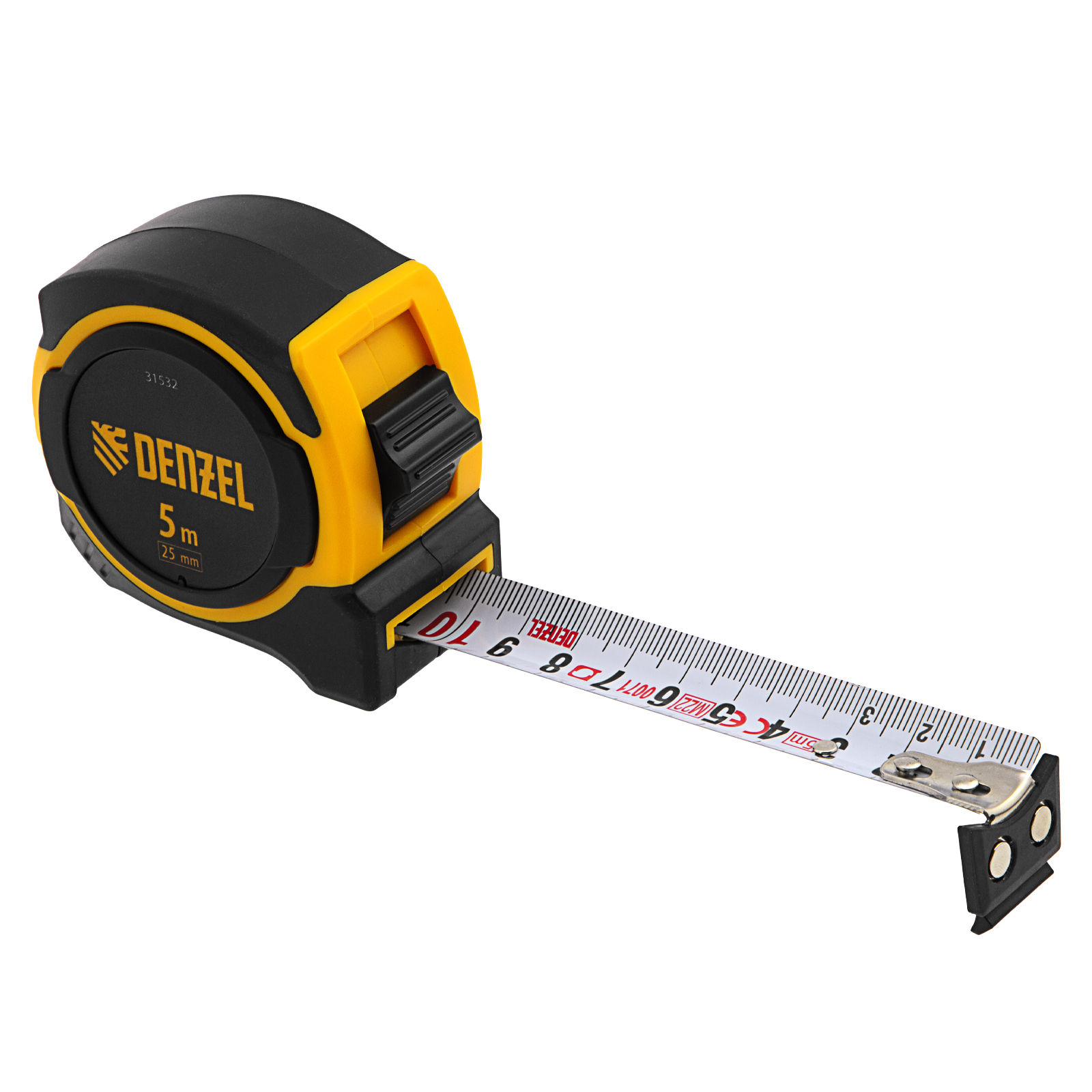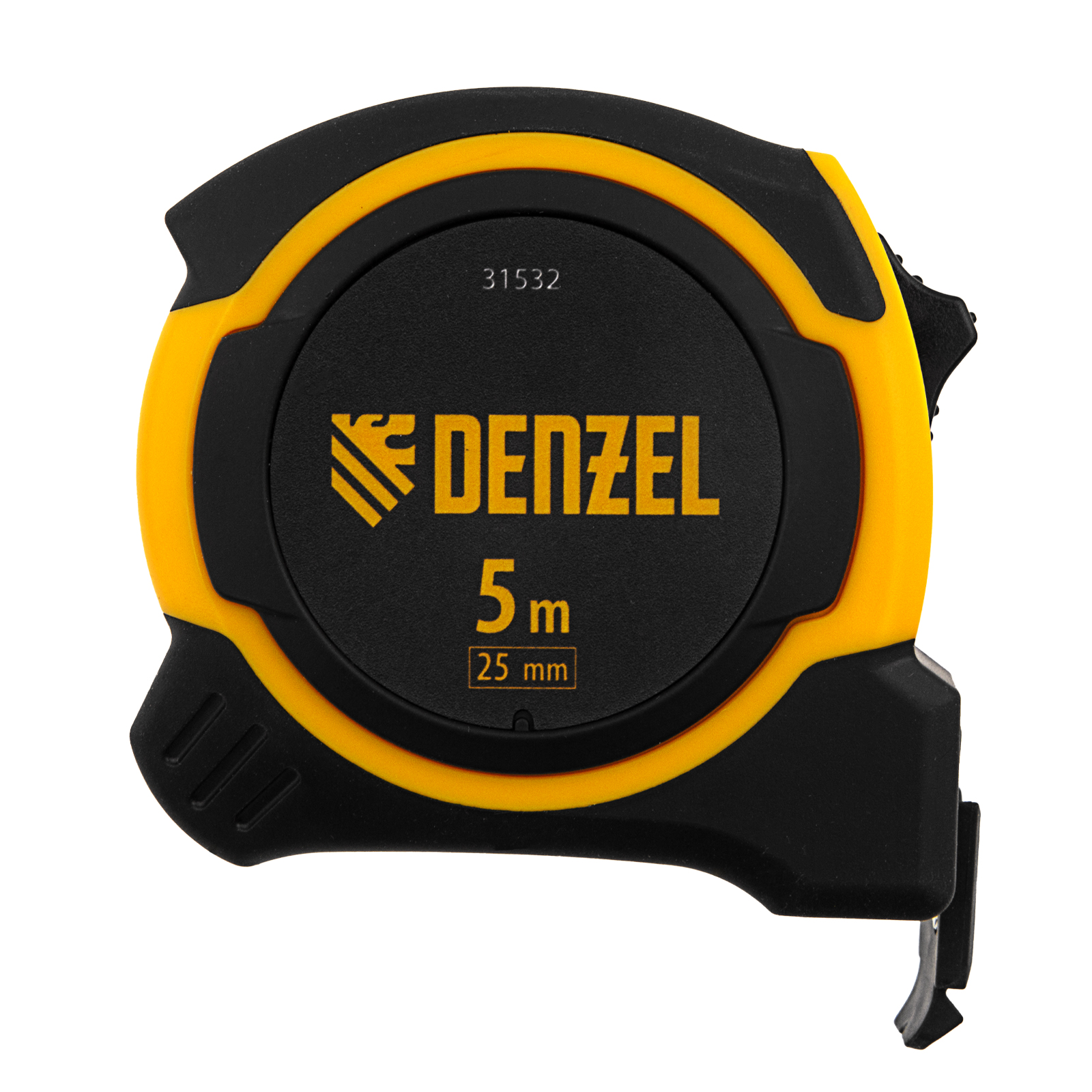 Рулетка 5м х 25мм, двухкомп. корпус, магнитный обрезиненный зацеп denzel. Бренд: DENZEL Особенности: двухкомпонентный корпус, магнитный зацеп Страна производства: Китай Длина в упаковке, мм: 155 Ширина в упаковке, мм: 120 Высота в упаковке, мм: 50 Вес (брутто), кг: 0.2965 Рулетка: 1 шт Рулетка Denzel 31532 в двухкомпонентном корпусе, с измерительной лентой шириной 25 мм и магнитным обрезиненным зацепом, позволяет определять размеры предметов и расстояния до 5 м. Широкая упругая лента упрощает проведение измерений в труднодоступных местах. Рулетка будет полезна при проведении строительных, ремонтных и различных бытовых работ. Преимущества Прочность — двухкомпонентный корпус из ABS-пластика с вставками из термопластичной резины устойчив к поломкам в результате случайных падений или ударов. Функциональность — обрезиненный зацеп с 2 неодимовыми магнитами надежно фиксируется на округлых и металлических предметах. Высокая точность выполняемых работ — подвижный зацеп «true zero» позволяет измерять внутренние и наружные поверхности с учетом его толщины. Удобная фиксация на ремне — рулетка дополнена поясным зажимом. Гарантированное качество — инструмент прошел сертификацию CE (LNE), ему присвоен 2 класс точности. Надежность — стальная лента с эмалевым покрытием и защитной пластиной в месте крепления зацепа выдерживает интенсивное использование. Долговечность — возвратная пружина из стали 65Mn устойчива к многократным нагрузкам. Продуманная упаковка — инструмент поставляется в открытом двойном блистере, позволяющем осмотреть его перед покупкой.  развернуть описание ▼