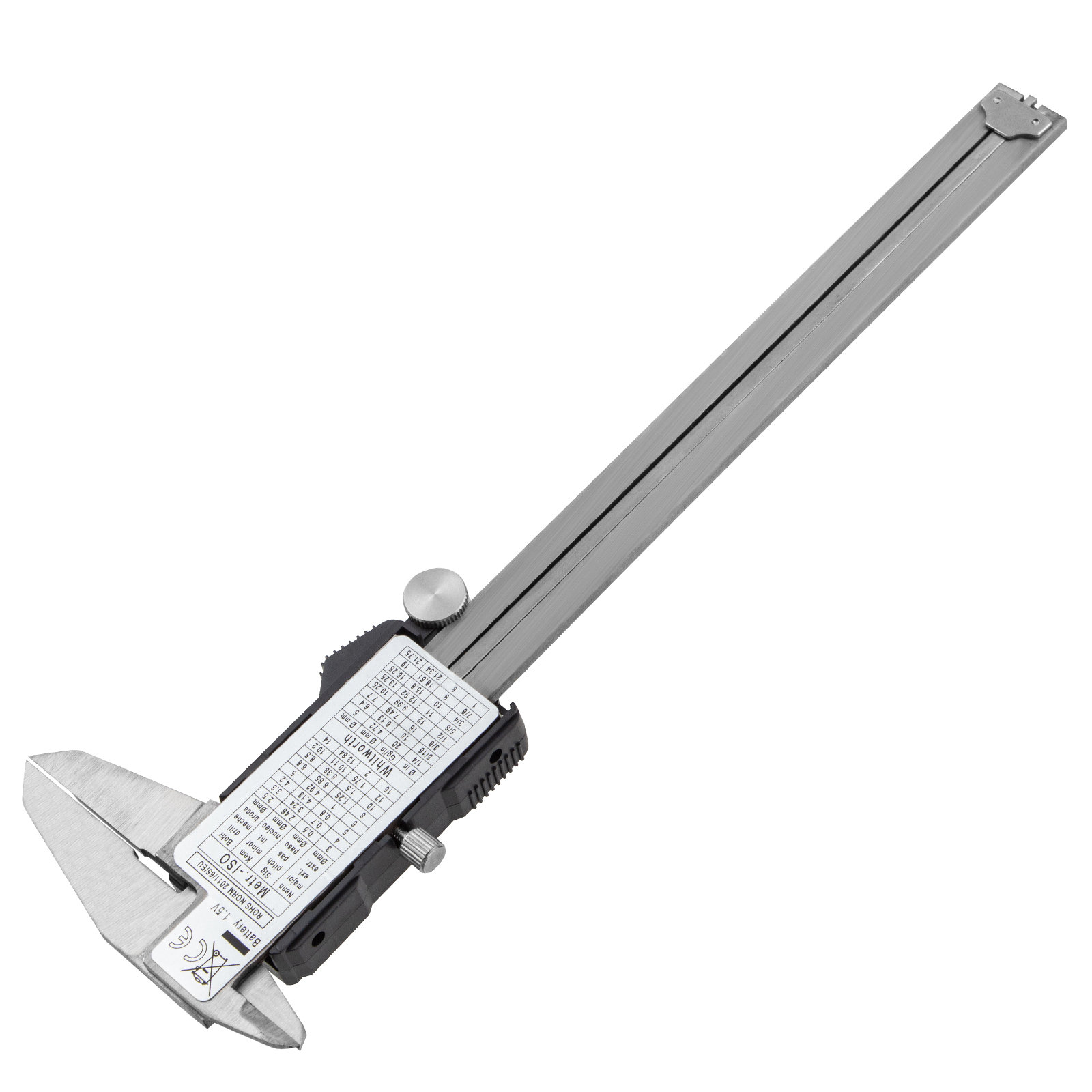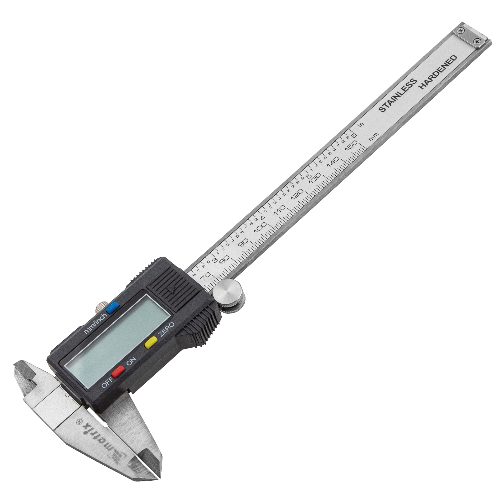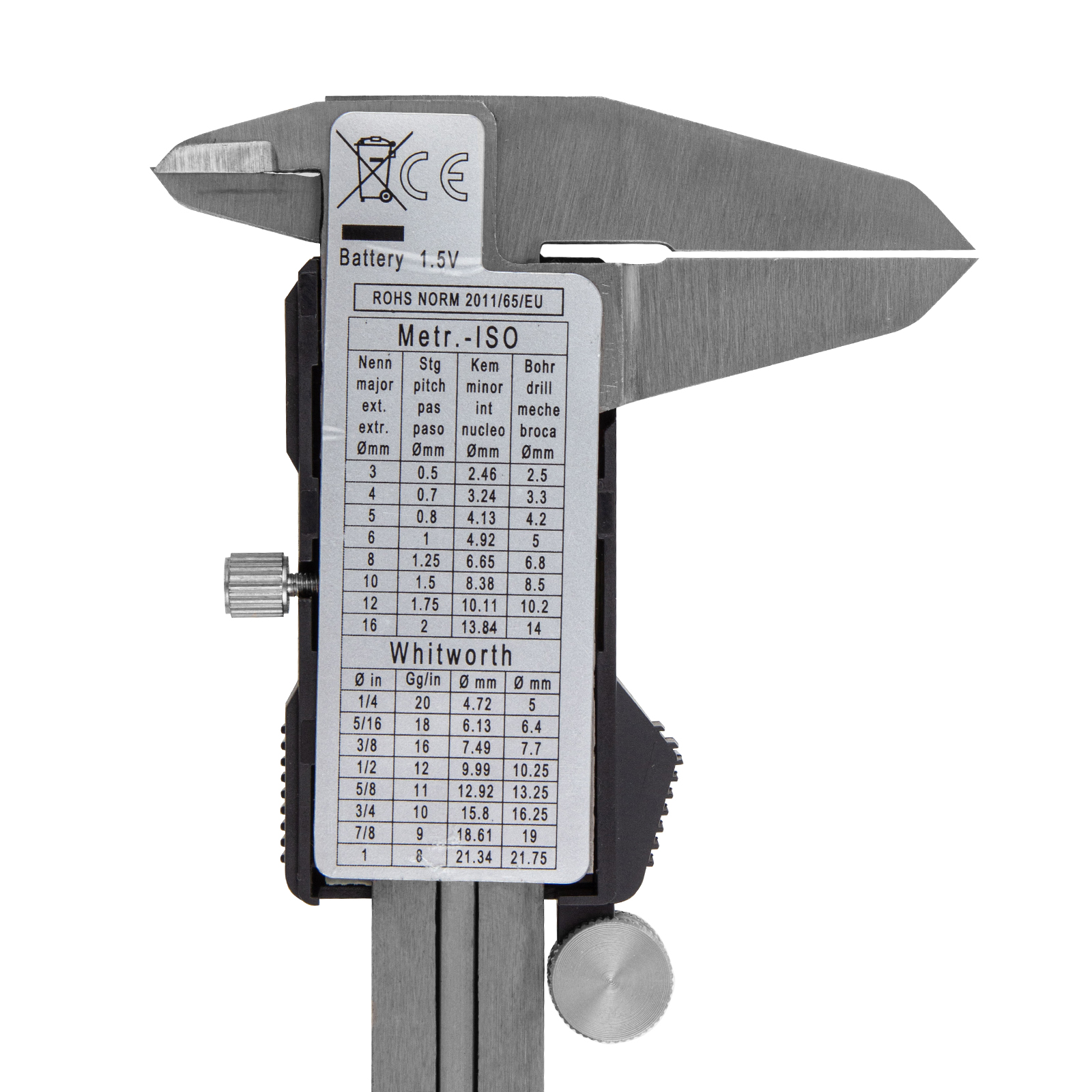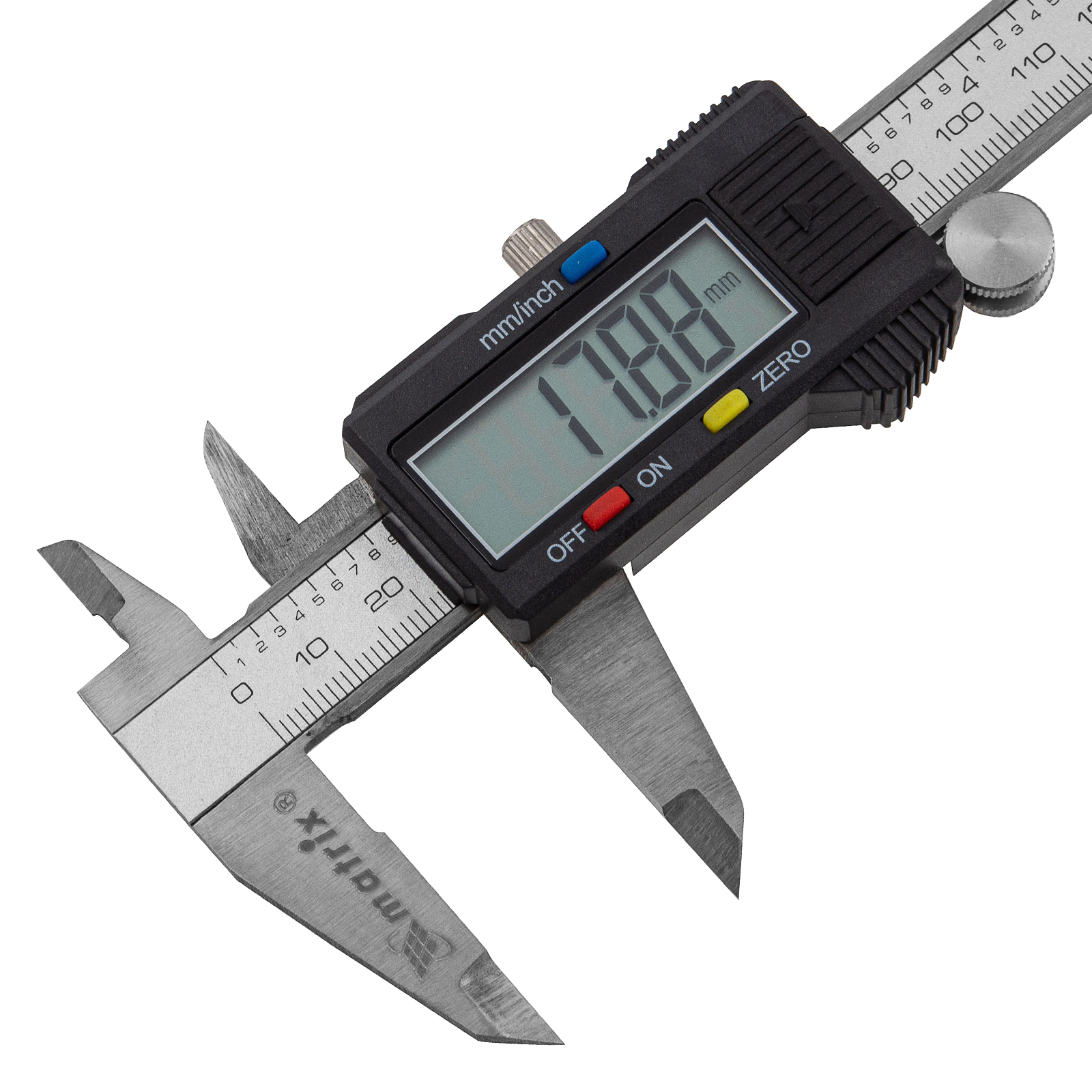 Штангенциркуль, 150 мм, электронный matrix. Бренд: Matrix Страна производства: Китай Длина, мм: 150 Тип упаковки: пластиковый футляр Длина в упаковке, мм: 245 Вес (брутто), кг: 0.33 Штангенциркуль: 1 шт Пластиковый футляр: 1 шт Электронный штангенциркуль Matrix 31611 со шкалой 150 мм предназначен для определения внутренних и наружных размеров различных предметов, а также глубин отверстий и канавок — для этого предусмотрен глубиномер. Цифровой инструмент позволяет проводить точные замеры, т.к. его погрешность составляет ±0,02 мм при измерении размеров до 100 мм, и ±0,03 мм — свыше 100 мм. Результаты отображаются на жидкокристаллическом дисплее, поэтому считывание показаний происходит легко и быстро. Штангенциркуль пригодится на производстве, в слесарной и столярной мастерской, а также дома или в гараже. Преимущества Прочность и устойчивость к коррозии — штангенциркуль изготовлен из инструментальной нержавеющей стали. Быстрое восстановление работоспособности — батарею типа SR44 1,5 В, от которой питается инструмент, легко заменить. Надежная упаковка — плотно закрывающийся пластмассовый футляр с мягкой подложкой предотвращает поломку инструмента в результате случайного падения или удара.  развернуть описание ▼
