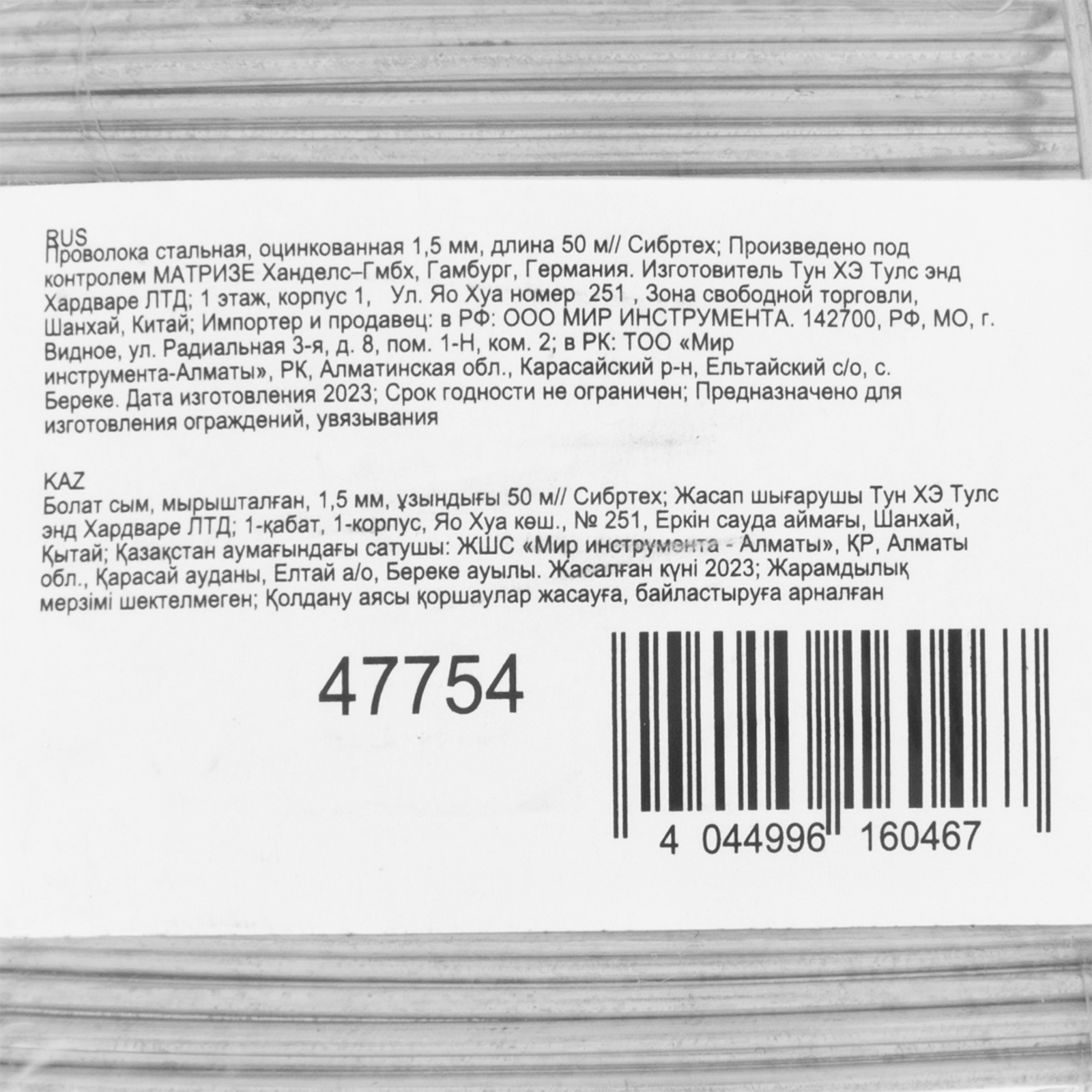Проволока стальная, оцинкованная 1.5 мм, длина 50 м сибртех