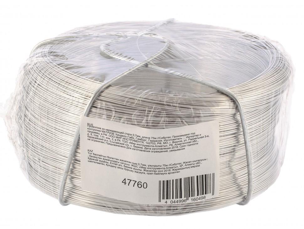 Проволока из нержавеющей стали 0.5 мм, длина 200м сибртех. Бренд: Сибртех Марка стали: нержавеющая 304 Материал: сталь Цвет: стальной Страна производства: Китай Диаметр, мм: 0.5 Длина, м: 200 Тип упаковки: моток со стикером Высота в упаковке, мм: 50 Вес (брутто), кг: 0.32 Комплектация товара: 1 моток Проволока из нержавеющей стали Сибртех 47760 диаметром 0,5 мм и длиной 200 м имеет гладкую и блестящую текстуру, поэтому оптимально подходит для рукоделия. Также пригодится в быту для увязывания и фиксации предметов, изготовления сеток и рамок и т.д. Преимущества Изготовлена из нержавеющей стали, не окисляется, не боится перепадов влаги и температуры. Характеризуется жесткостью, за счет чего хорошо натягивается и не теряет форму. Поставляется в мотках по 200 м, запаса хватит на большой объем работ.  развернуть описание ▼