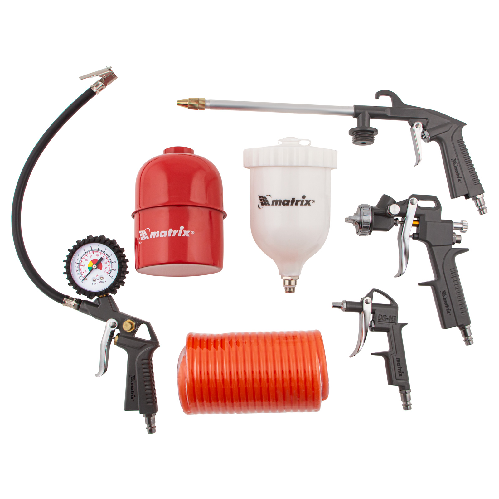 Набор пневмоинструмента Matrix 57304 включает 5 предметов: промывочный пистолет, продувочный пистолет, пневмопистолет для накачки шин, краскораспылитель с верхним бачком и шланг с быстросъемным соединением. Пневмоинструменты совместимы со всеми типами компрессоров. Набор пригодится в автомастерской, на мебельном производстве, в гараже или при проведении ремонта.;С помощью краскораспылителя можно покрасить поверхности или покрыть их защитными составами. Промывочный пистолет предназначен для очистки и смазки различных поверхностей. Пистолет для подкачки шин позволяет измерить давление в шине и накачать ее. Продувочный пистолет очищает поверхности и детали струей сжатого воздуха, а спиральный шланг служит для подключения пневмоинструмента к компрессору.
