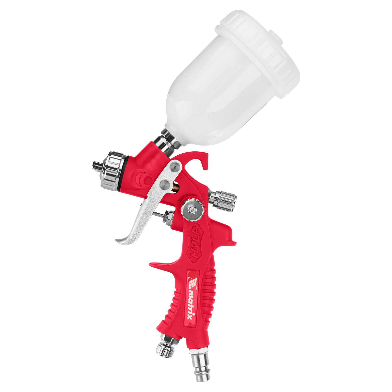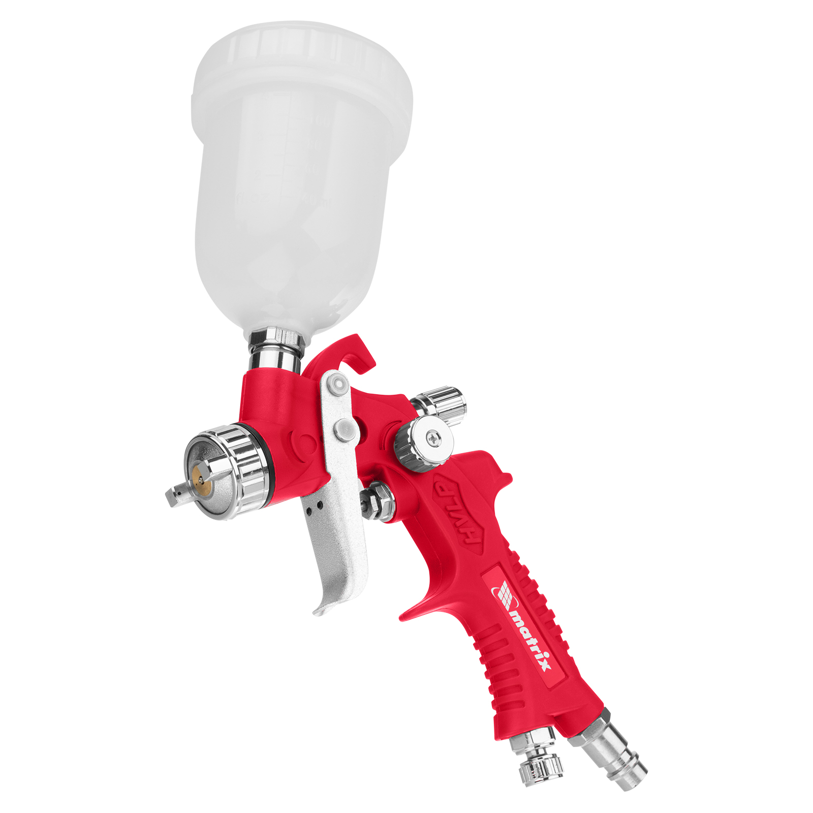 Краскораспылитель hvlp пневмат. с верхним бачком v= 0,1 л, сопло диаметром 0.8 мм matrix. Бренд: Matrix Гарантия: 1 год Страна производства: Китай Объем бачка, л: 0.1 Тип упаковки: картонная коробка Длина в упаковке, мм: 170 Ширина в упаковке, мм: 95 Вес (брутто), кг: 0.44 Руководство по эксплуатации и гарантийный талон: 1 шт Пневматический краскораспылитель HVLP Matrix 57325 с верхним бачком объемом 0,1 л и соплом диаметром 0,8 мм расходует 50-140 литров в минуту и используется для равномерного нанесения лакокрасочных материалов, пропиток, грунтовок и других растворов. Подходит для обработки небольших участков. Распыление по технологии HVLP (High Volume Low Pressure, высокий объем, низкое давление) обеспечивает качественное нанесение покрытия. Краскораспылитель пригодится во время отделочных, ремонтных работ, а также обслуживания автомобилей. Преимущества Эффективное решение различных задач — регулировка расхода воздуха, подачи краски и формы факела позволяют установить оптимальный режим работы. Верхнее расположение бака — краскопульт удобно заправлять, лакокрасочный материал расходуется полностью. Прочность — полиамидный корпус пистолета устойчив к механическим повреждениям. Коррозионная стойкость — элементы, контактирующие с краской, изготовлены из латуни и высококачественной стали. Эргономичность — облегченная конструкция со сбалансированным центром тяжести удобна для продолжительной работы.  развернуть описание ▼