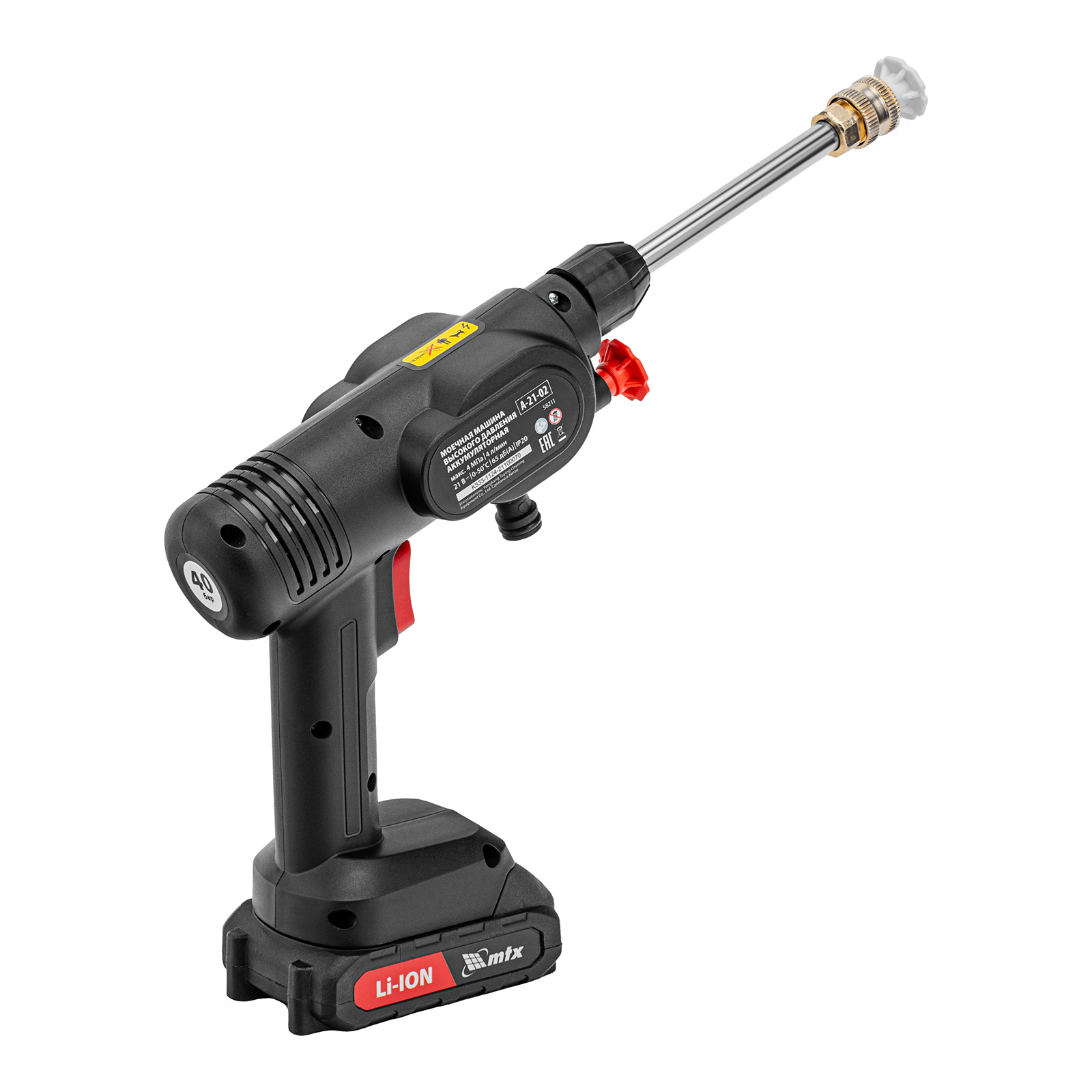 Моечная машина высокого давления аккумуляторная а-21-02, 40 бар, 4 л/мин, Li-ion 21 в, 2 акк.// Mtx