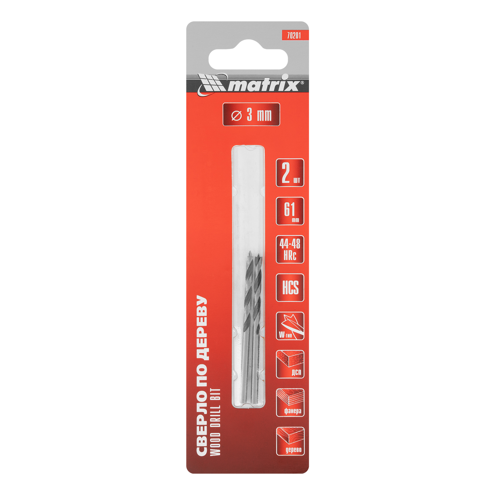 Сверло по дереву, 3 X 61 мм, 2 шт, цилиндрический хвостовик Matrix