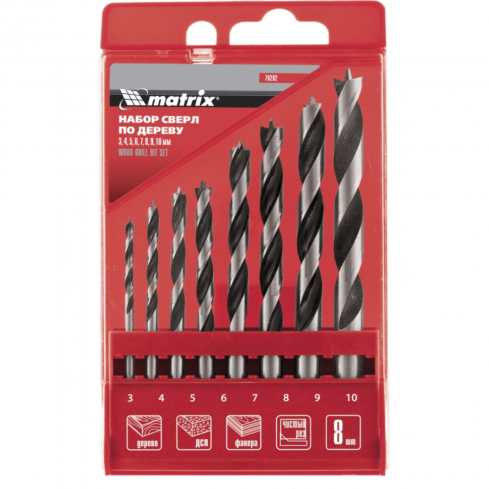 Набор сверл по дереву, 3-4-5-6-7-8-9-10 мм, 8 шт, цилиндрический хвостовик