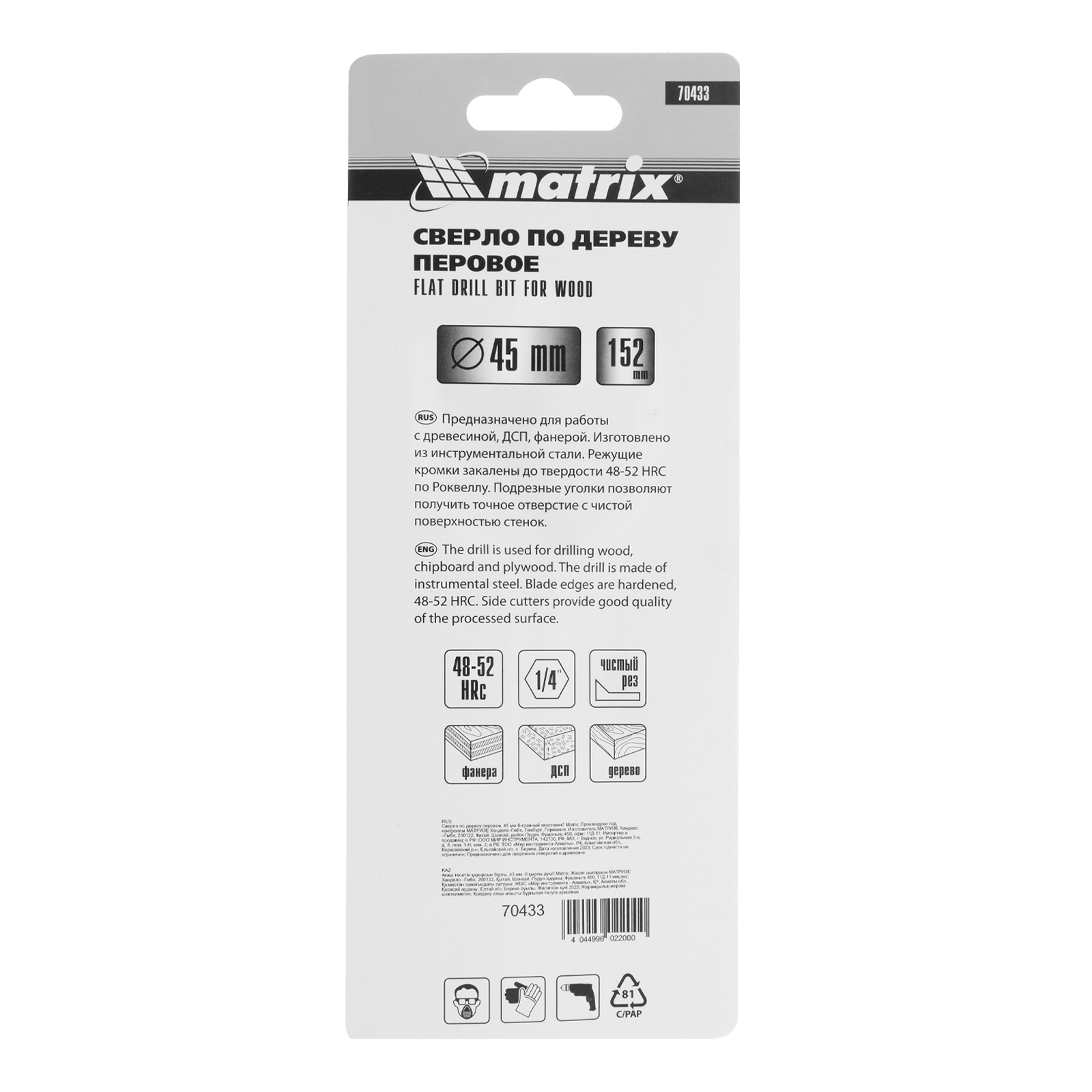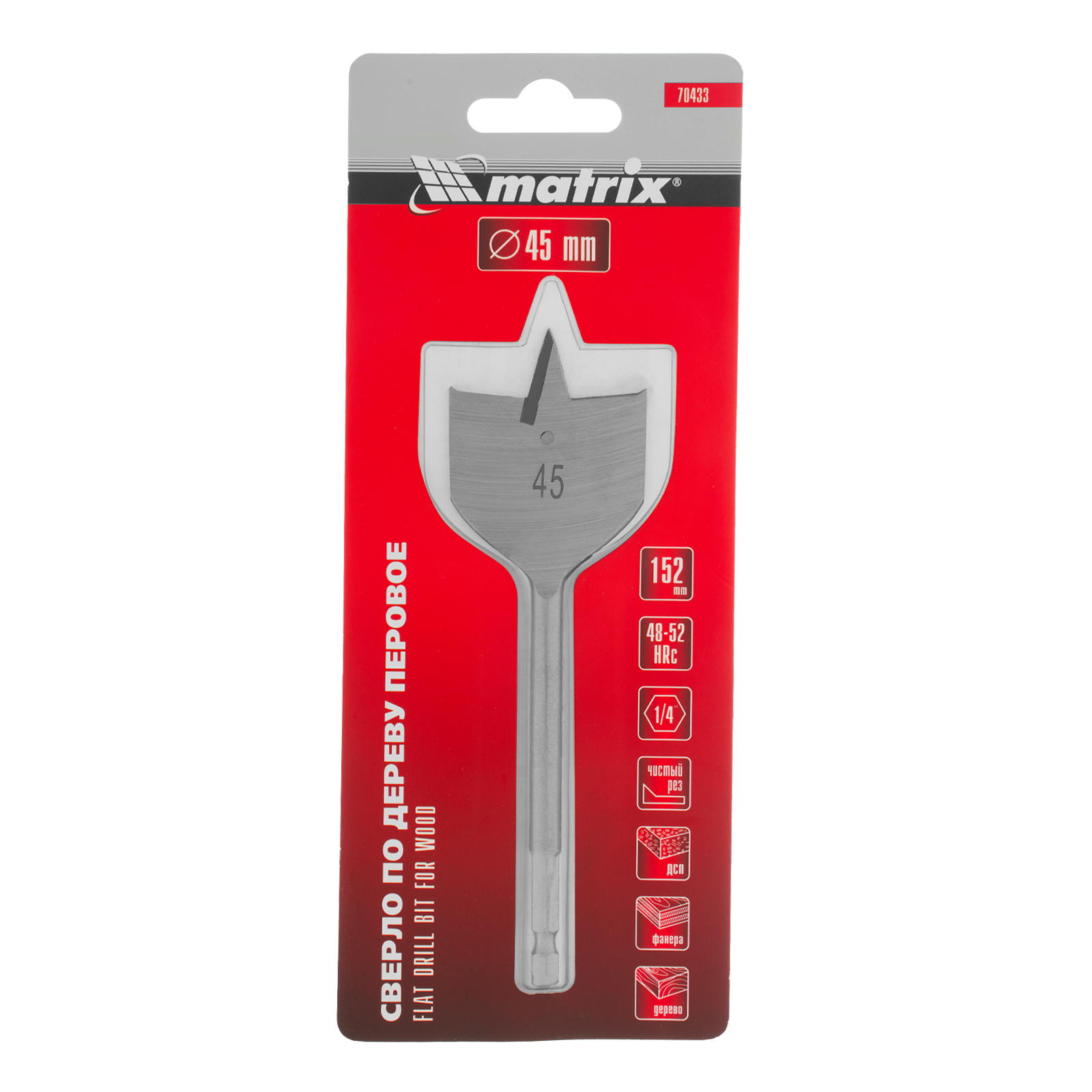 Сверло по дереву перовое, 45 мм, шестигранный хвостовик Matrix