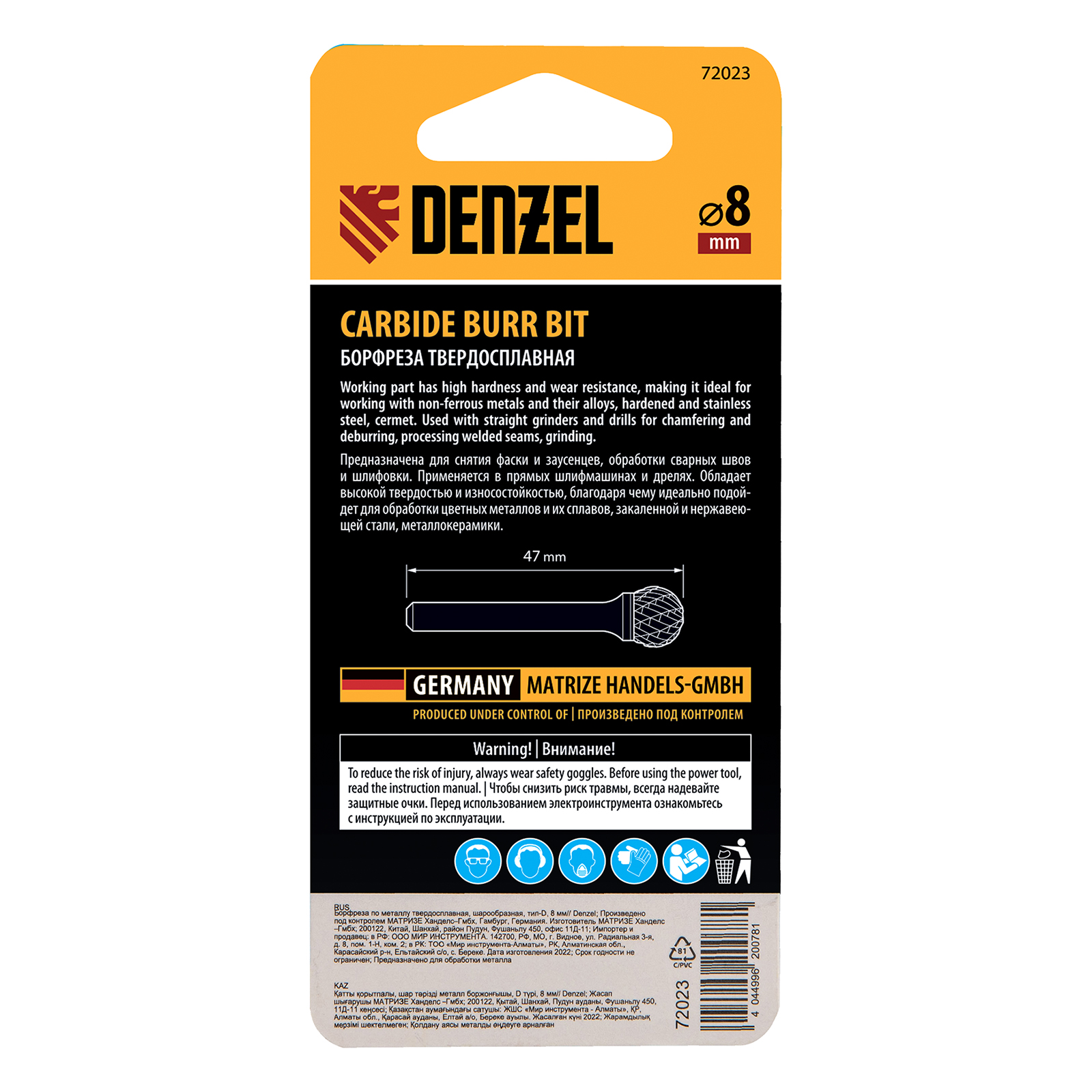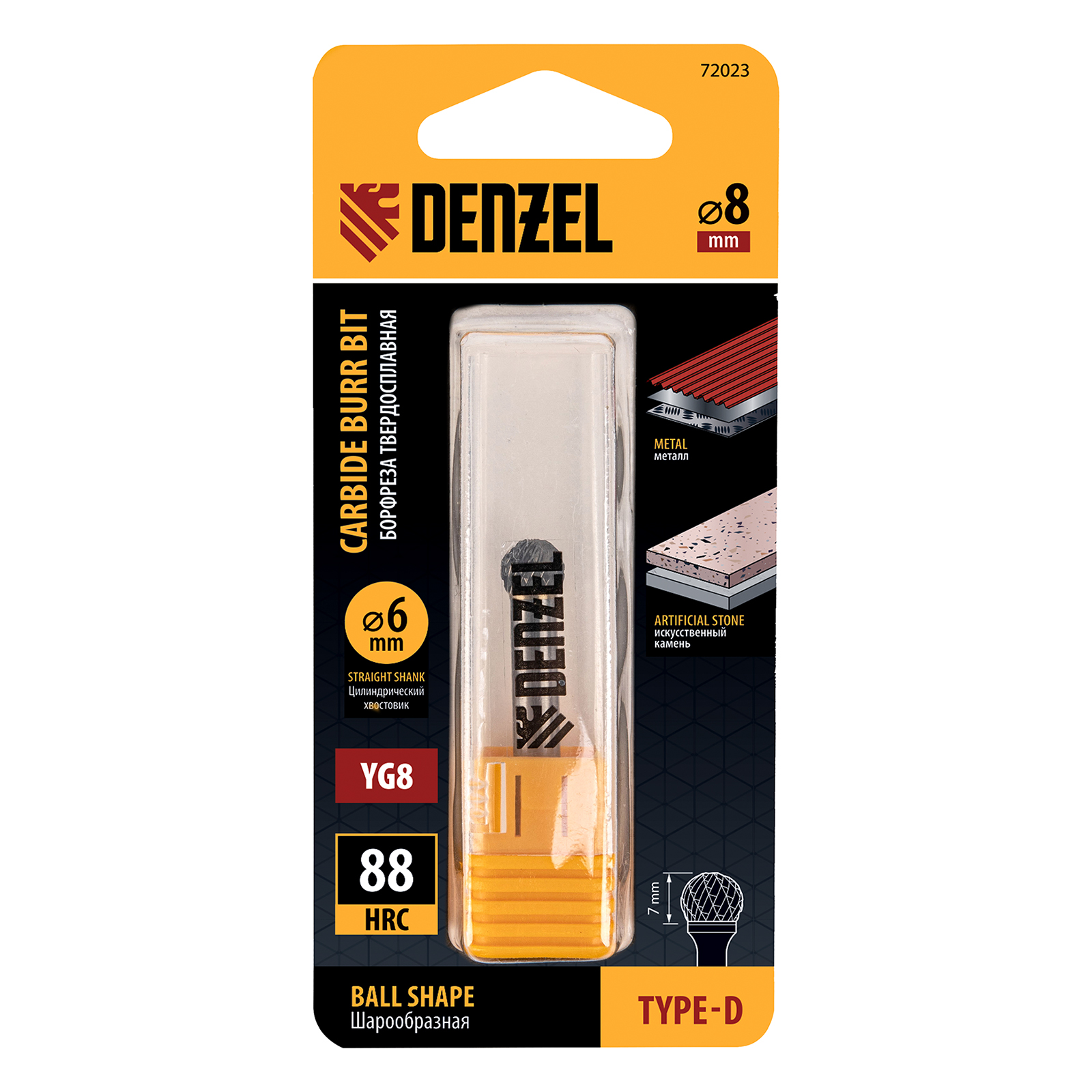 Борфреза по металлу твердосплавная, шарообразная, тип-d, 8 мм Denzel