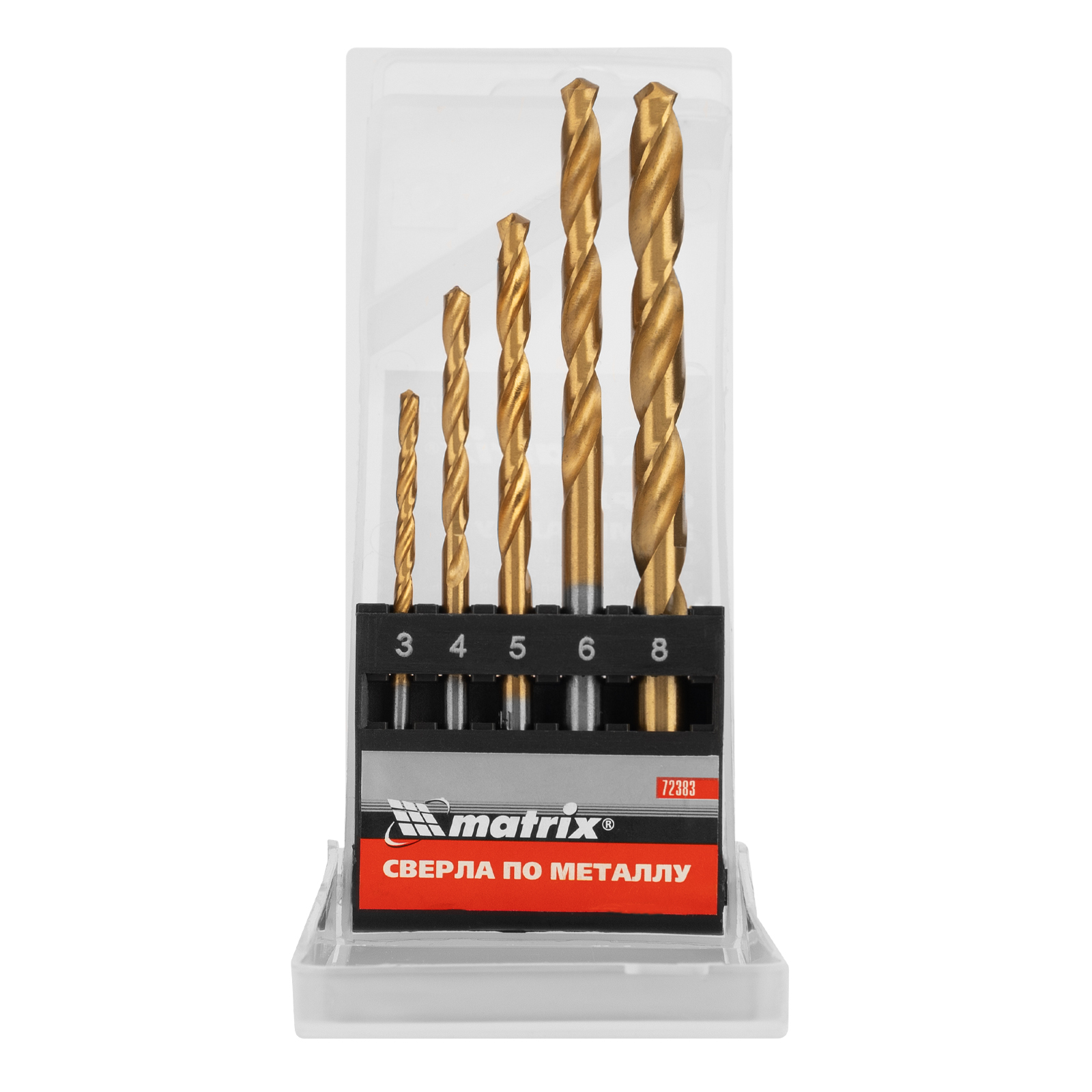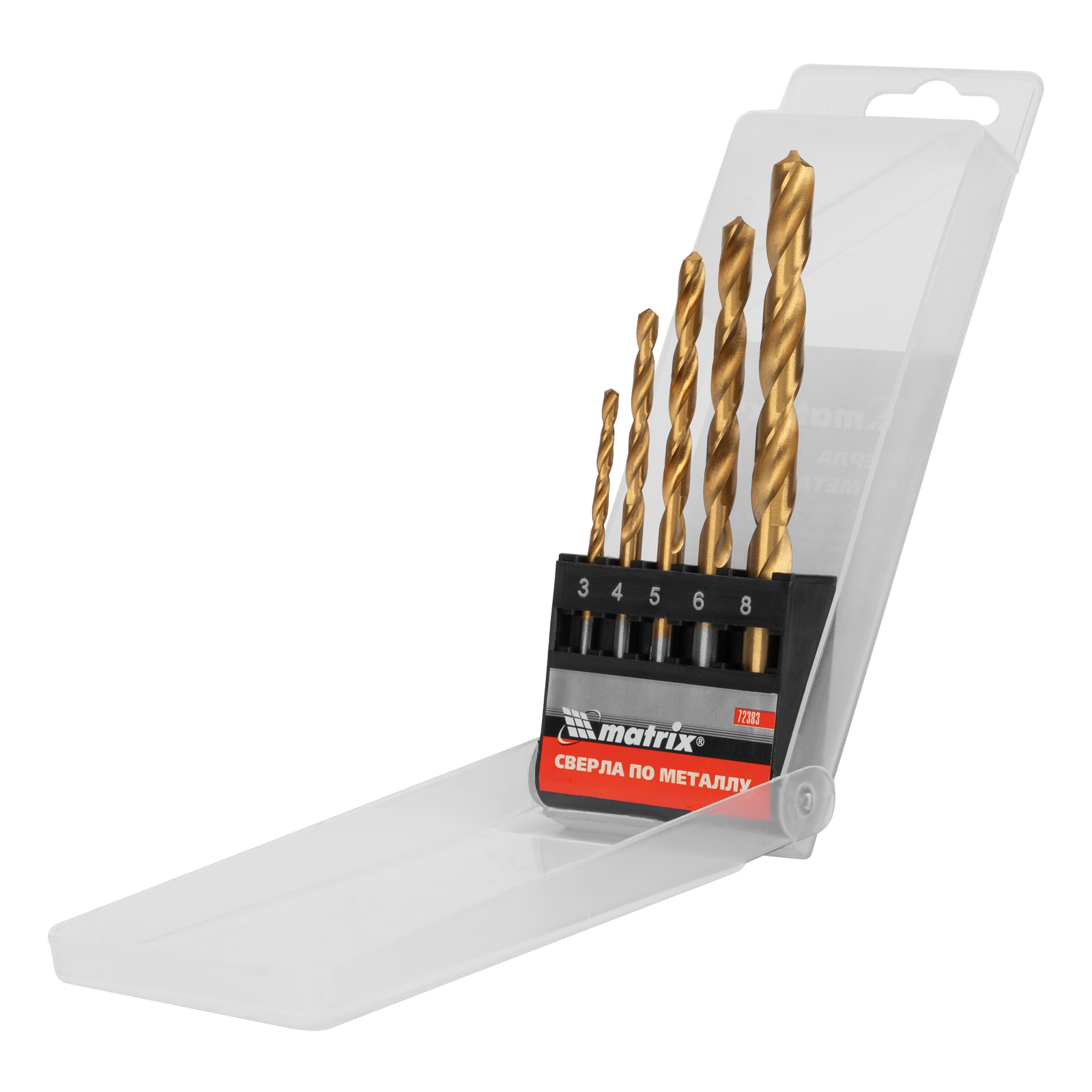 Набор нитридтитановых сверл по металлу, 3-4-5-6-8 мм, Hss, 5 шт, пластиковая коробка, цилиндрический хвостовик Matrix