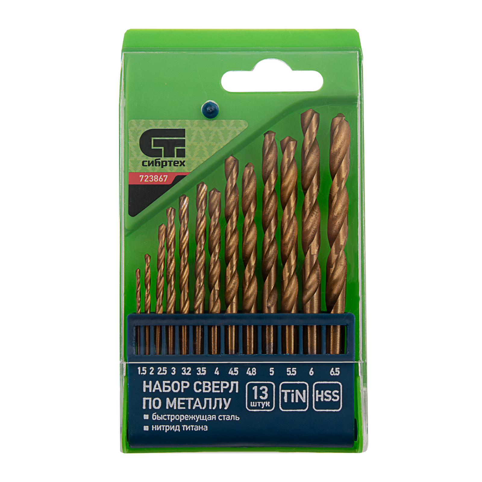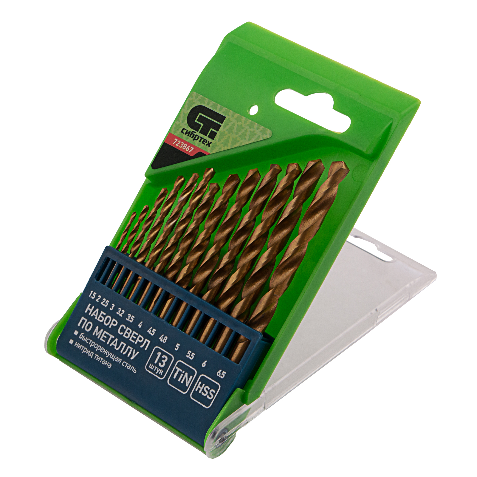 Набор нитридтитановых сверл по металлу, 1.5-6.5 мм. (через 0.5 мм.+3.2 мм, 4.8 мм.) нss 13 шт сибртех. Бренд: Сибртех Материал обработки: металл Тип хвостовика: цилиндрический Страна производства: Китай Максимальный диаметр, мм: 6.5 Длина в упаковке, мм: 135 Ширина в упаковке, мм: 77 Вес (брутто), кг: 0.18 Сверло по металлу 1,5, 2,0, 2,5, 3,0, 3,2, 3,5, 4,0, 4,5, 4,8, 5,0, 5,5, 6,0, 6,5: 13 шт Пластиковый кейс: 1 шт Набор сверл по металлу Сибртех 723867 с нитридтитановым покрытием, диаметром 1,5-6,5 мм (через 0,5 мм, +3,2 мм, 4,8 мм), из стали HSS, состоит из 13 шт. и предназначен для получения отверстий в заготовках из черных металлов — стали, чугуна. Включает оснастку самых востребованных размеров, будет полезен во время проведения ремонтных работ, а также дома, на даче или в гараже. Преимущества Стабильная работа на высокой скорости — оснастка изготовлена из быстрорежущей стали, полированная поверхность уменьшает трение о стенки отверстий и улучшает отвод стружки. Долговечность — твердость режущих кромок составляет 62-65 HRC, нитридтитановое покрытие повышает стойкость сверл к перегреву и защищает от коррозии. Продуманная конструкция — диаметр сверл уменьшается по направлению к хвостовику для предотвращения заклинивания в отверстии. Универсальность — цилиндрические хвостовики совместимы со всеми типами патронов. Удобное хранение и транспортировка — набор поставляется в пластиковом боксе.  развернуть описание ▼