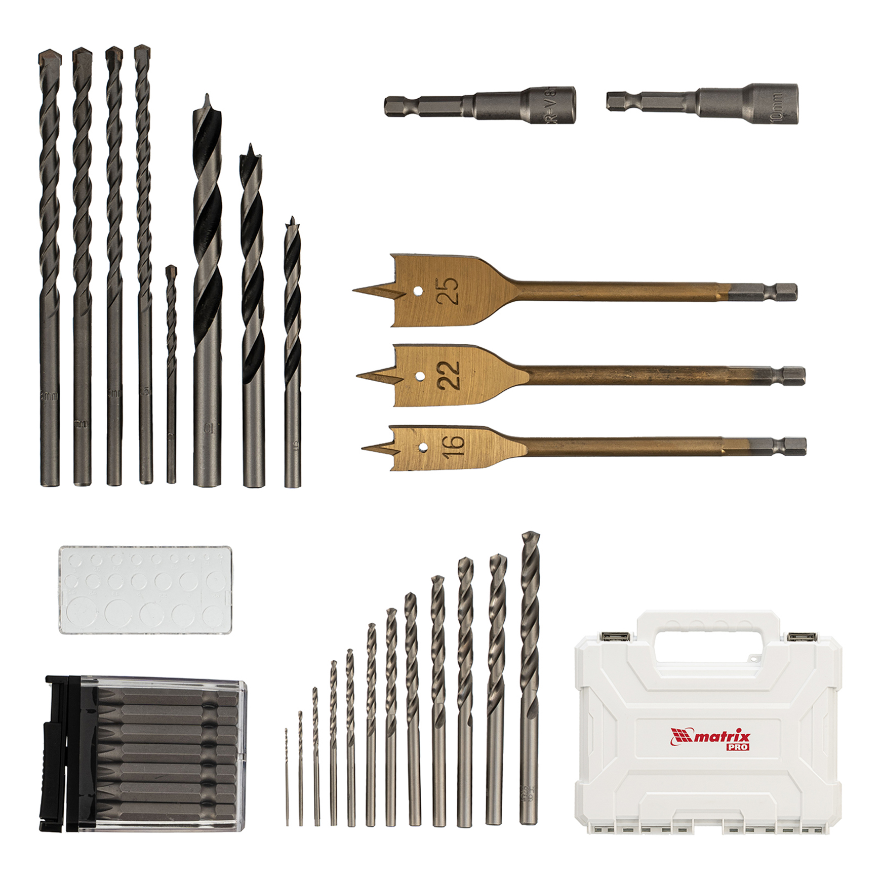 Набор сверл комбинированный, сверла по металлу 1-6.5 мм, бетону 4-8 мм, дереву 4-10 мм, перовые 16,22,25 мм, биты 20 шт, адаптер. Бренд: Matrix Материал обработки: бетон, дерево, металл Материал перовых сверл: нитридтитановое покрытие Материал сверл по бетону: 40Х, ВК8 Материал сверл по дереву: сталь 45 Материал сверл по металлу: Р6М5 Размер сверл по бетону: 4 x 75 мм, 5,5 x 150 мм, 6 x 150 мм, 7 x 150 мм, 8 x 150 мм Размер сверл по дереву: 10 х 117 мм, 4 х 75 мм, 5 х 86 мм, 6 х 93 мм, 8 х 112 мм Размер сверл по металлу: 1 x 34 мм, 1,5 x 43 мм, 2 x 49 мм, 2,5 x 57 мм, 3 x 61 мм, 3,5 x 70 мм, 4 x 75 мм, 4,5 x 80 мм, 5 x 86 мм, 5,5 x 93 мм, 6 x 93 мм, 6,5 х 93 мм Размеры торцевых головок, адаптеров: 1u002F4 Тип хвостовика: цилиндрический, шестигранный Страна производства: Китай Длина в упаковке, мм: 487 Ширина в упаковке, мм: 347 Вес (брутто), кг: 1.76 Сверло по металлу 1, 1,5, 2, 2,5, 3, 3,5, 4, 4,5, 5, 5,5, 6, 6,5: 12 шт Бита PH2: 20 шт Головка торцева 8, 10: 2 шт Сверло по дереву перовое 16, 22, 25: 3 шт Пластиковый кейс: 1 шт Комбинированный набор Matrix 725650 — универсальное решение для мастеров, т. к. он содержит 50 предметов: отверточные биты (20 шт.) и адаптер к ним, зенковку, 2 торцевые головки, калибровочную шкалу, сверла по дереву 4-10 мм, сверла перовые 16-25 мм, сверла по бетону 4-8 мм и сверла по металлу 1-6,5 мм. Оснастка подходит как для бытового использования, так и решения профессиональных задач. Преимущества Прочность и долговечность — биты, торцевые головки и адаптер выполнены из хромованадиевой стали, сверла по металлу из стали Р6М5, а сверла по дереву — из стали 45. Высокий ресурс — сверла по бетону изготовлены из стали 40Х и имеют твердосплавную пластину ВК8. Решение широкого спектра задач — в набор входит оснастка наиболее распространенных размеров. Быстрое переключение между задачами — магнитный адаптер упрощает замену бит. Универсальность — цилиндрические хвостовики сверл совместимы со всеми типами патронов. Удобное хранение и транспортировка — набор поставляется в пластиковом кейсе с защелками и ручкой.  развернуть описание ▼
