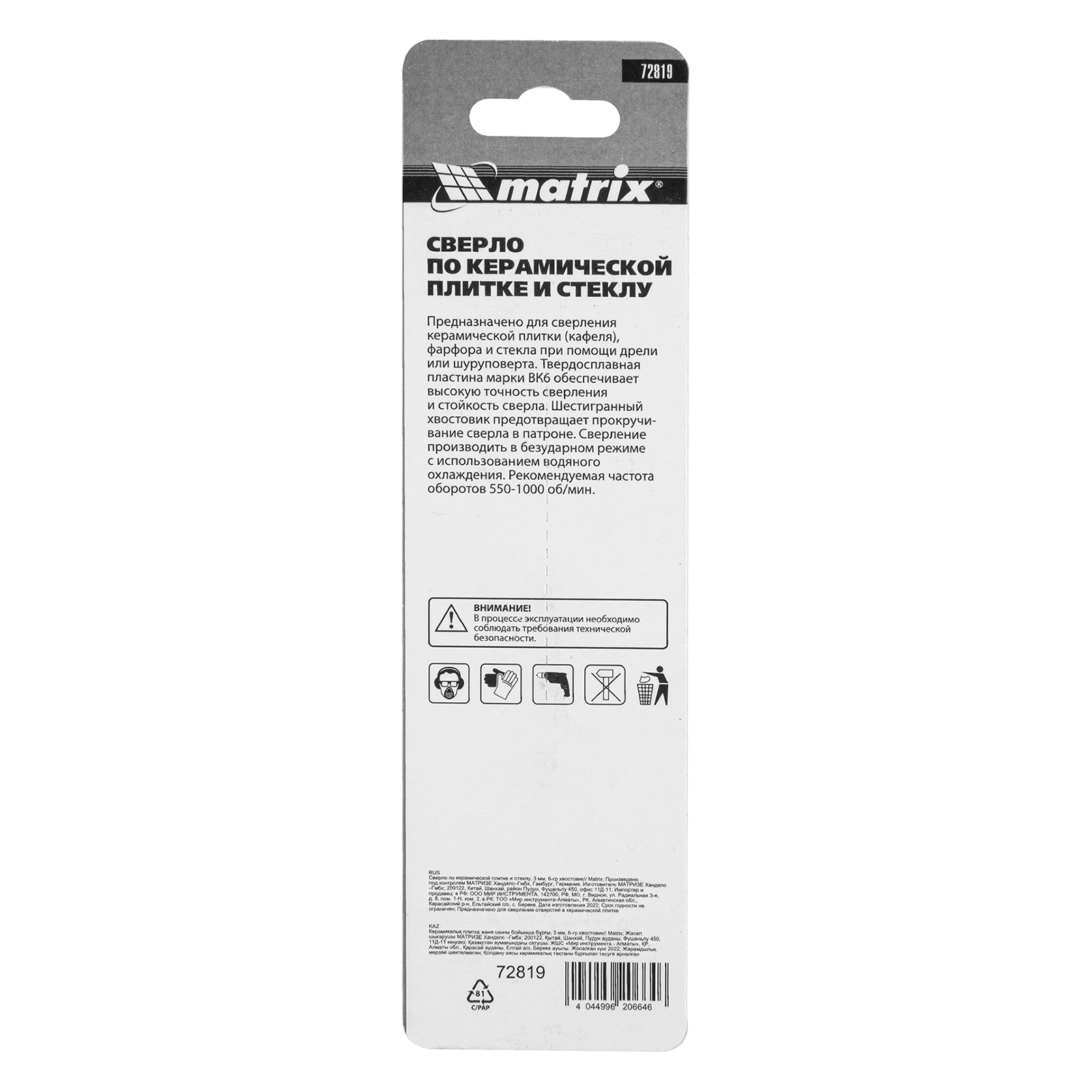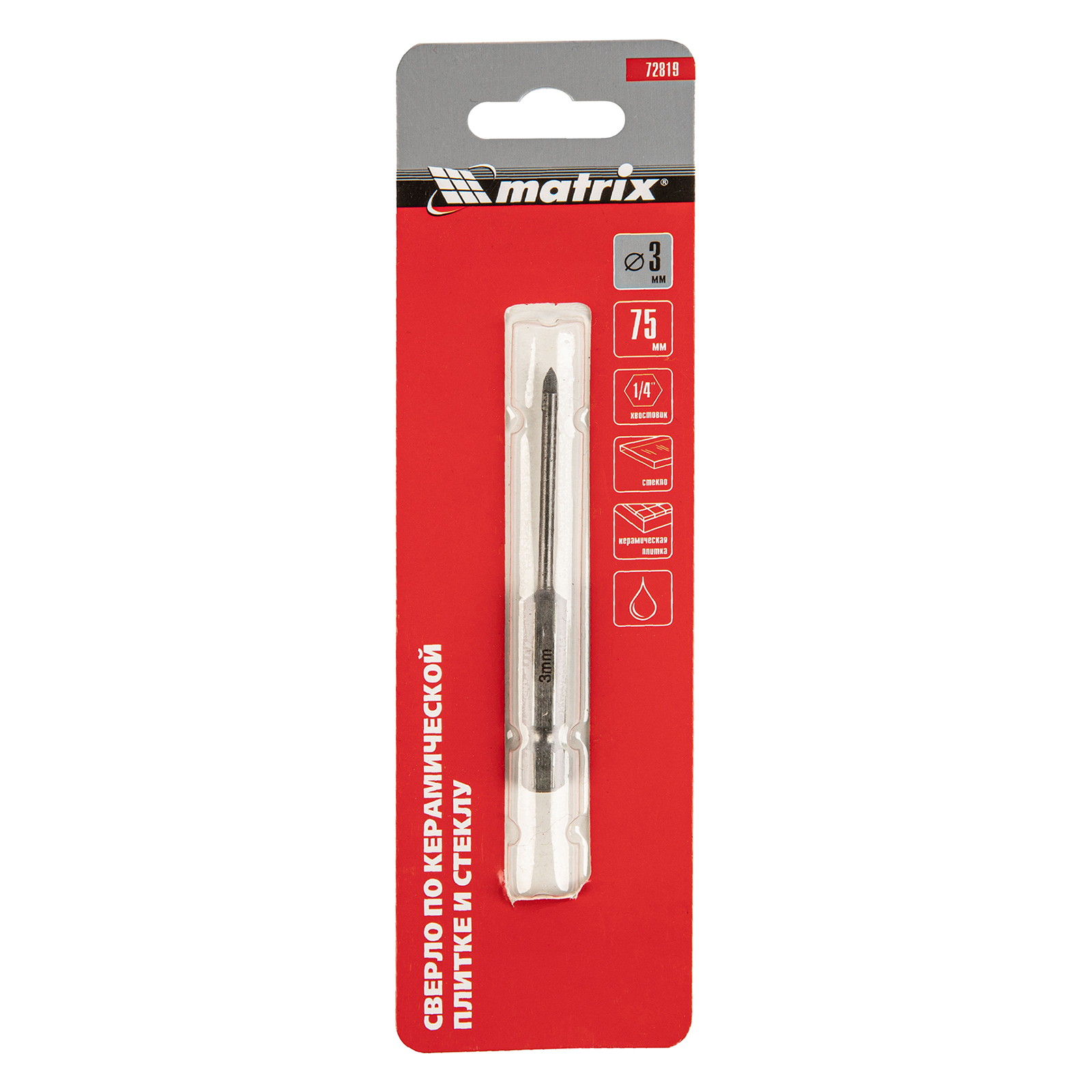 Сверло по керамической плитке и стеклу, 3 мм, шестигранный хвостовик Matrix
