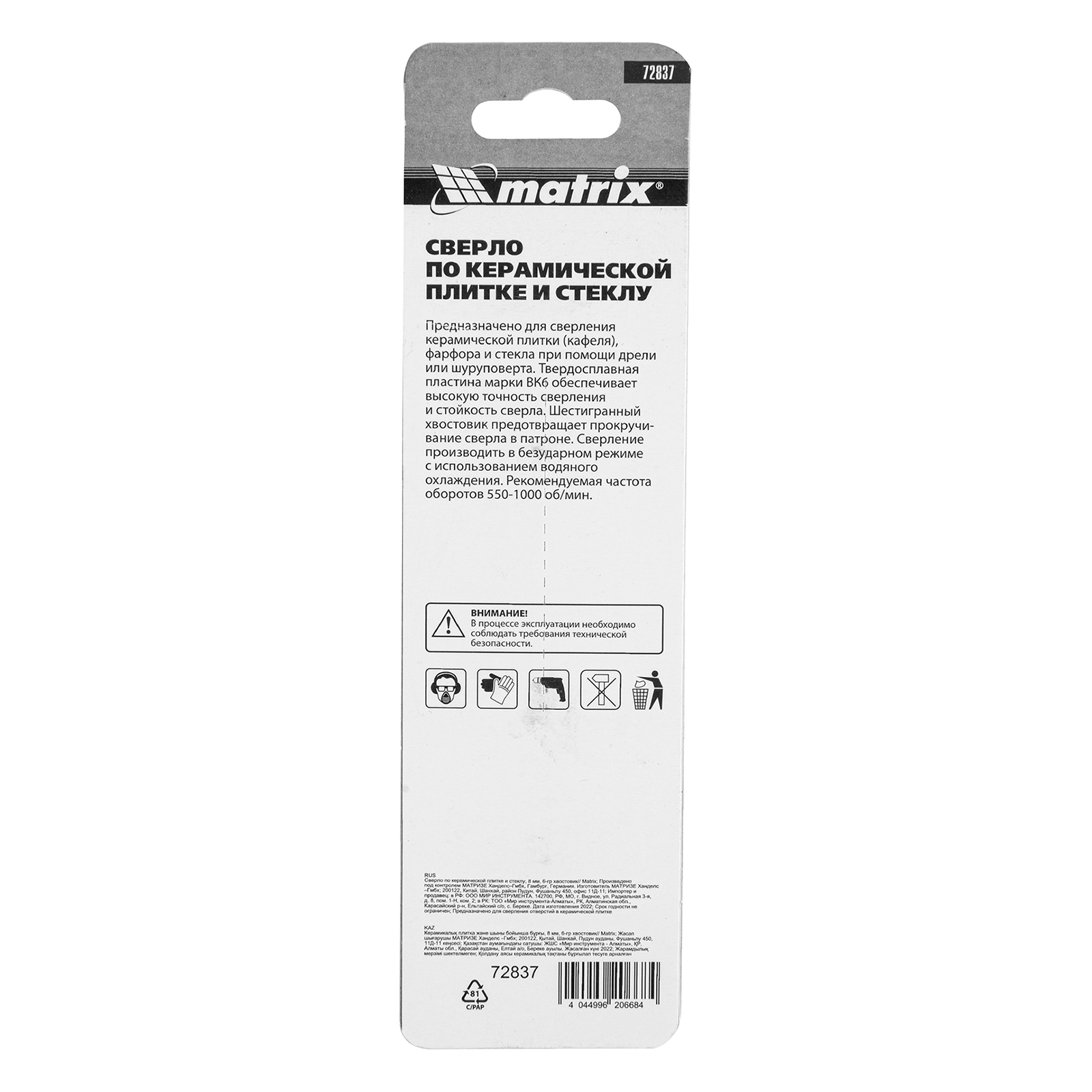 Сверло по керамической плитке и стеклу, 8 мм, шестигранный хвостовик Matrix