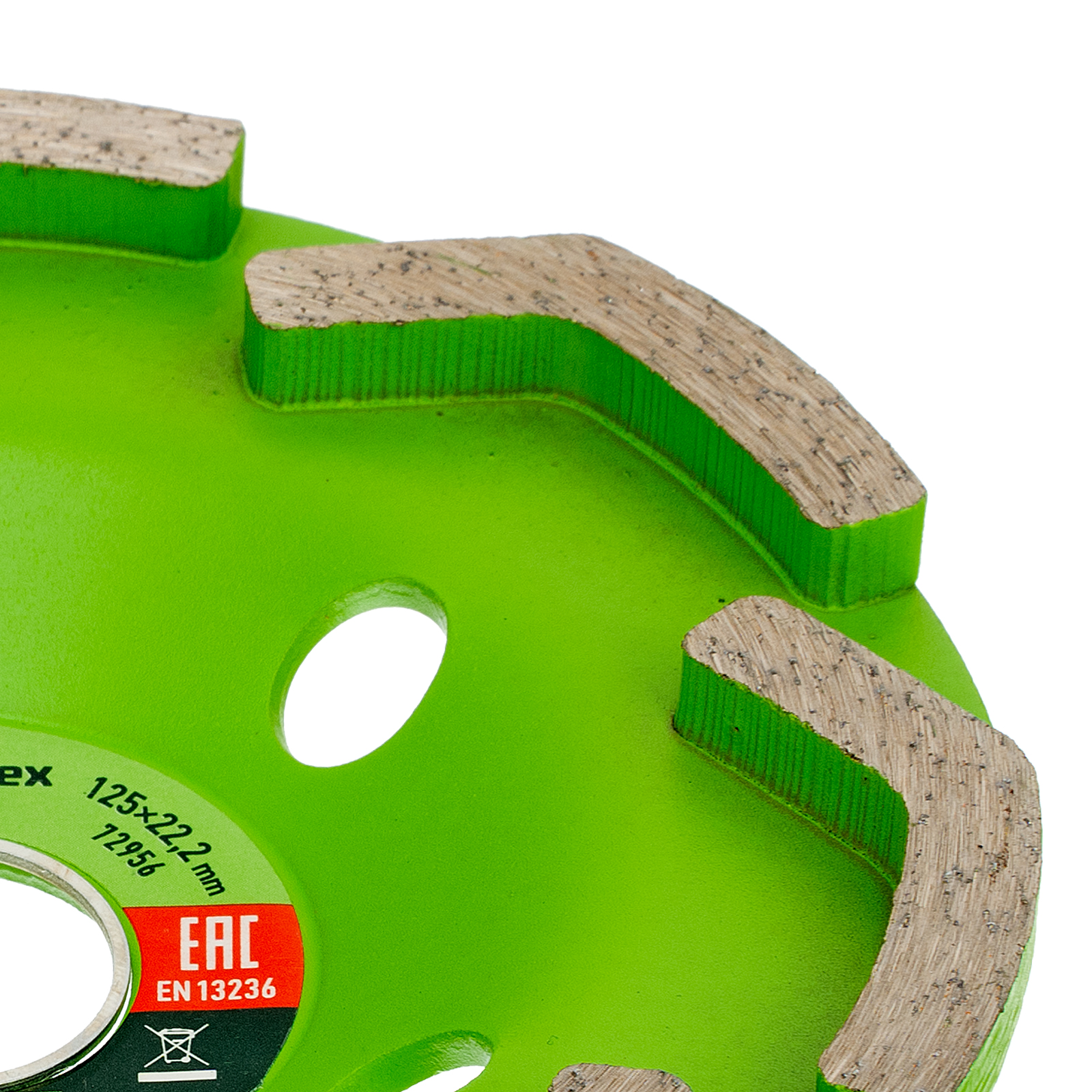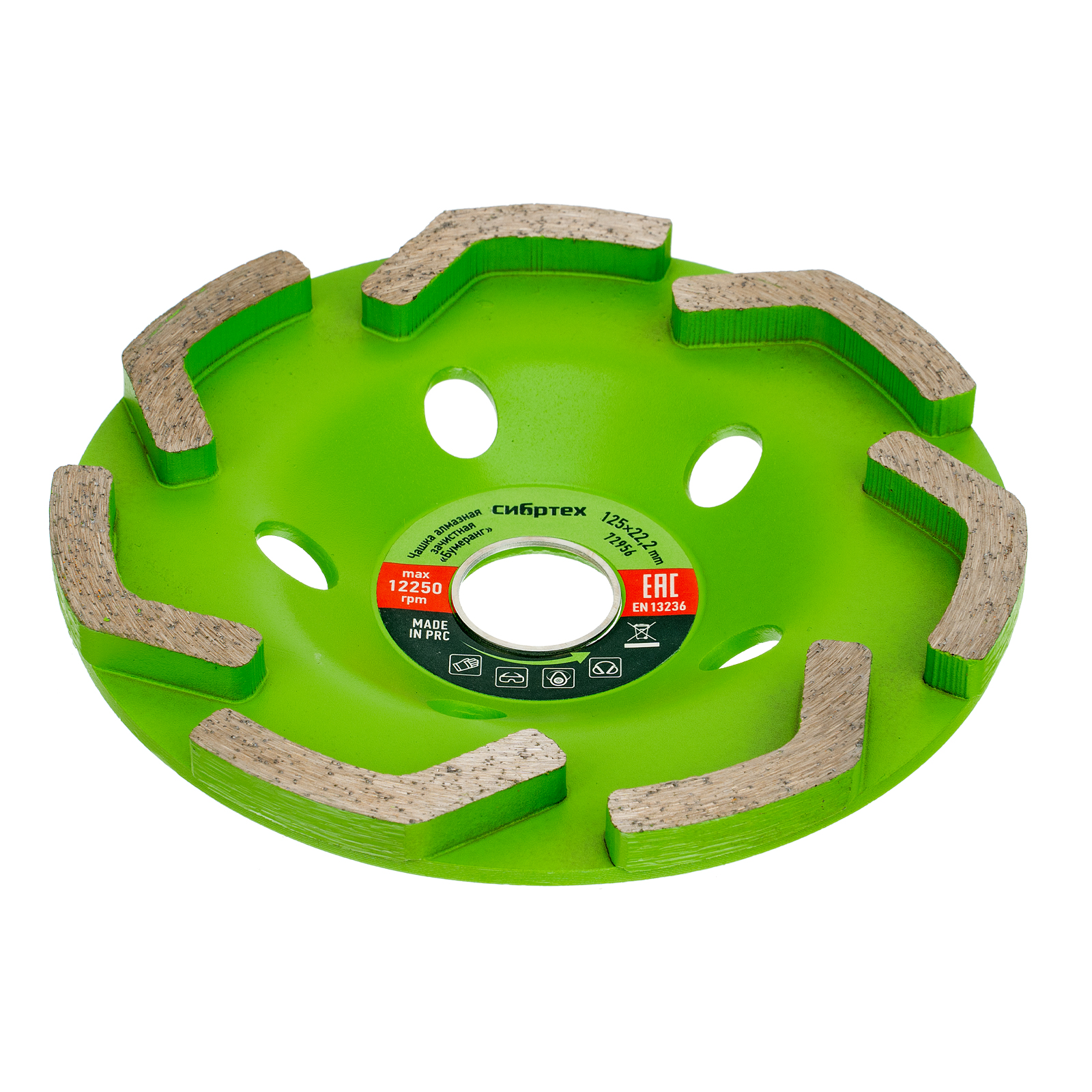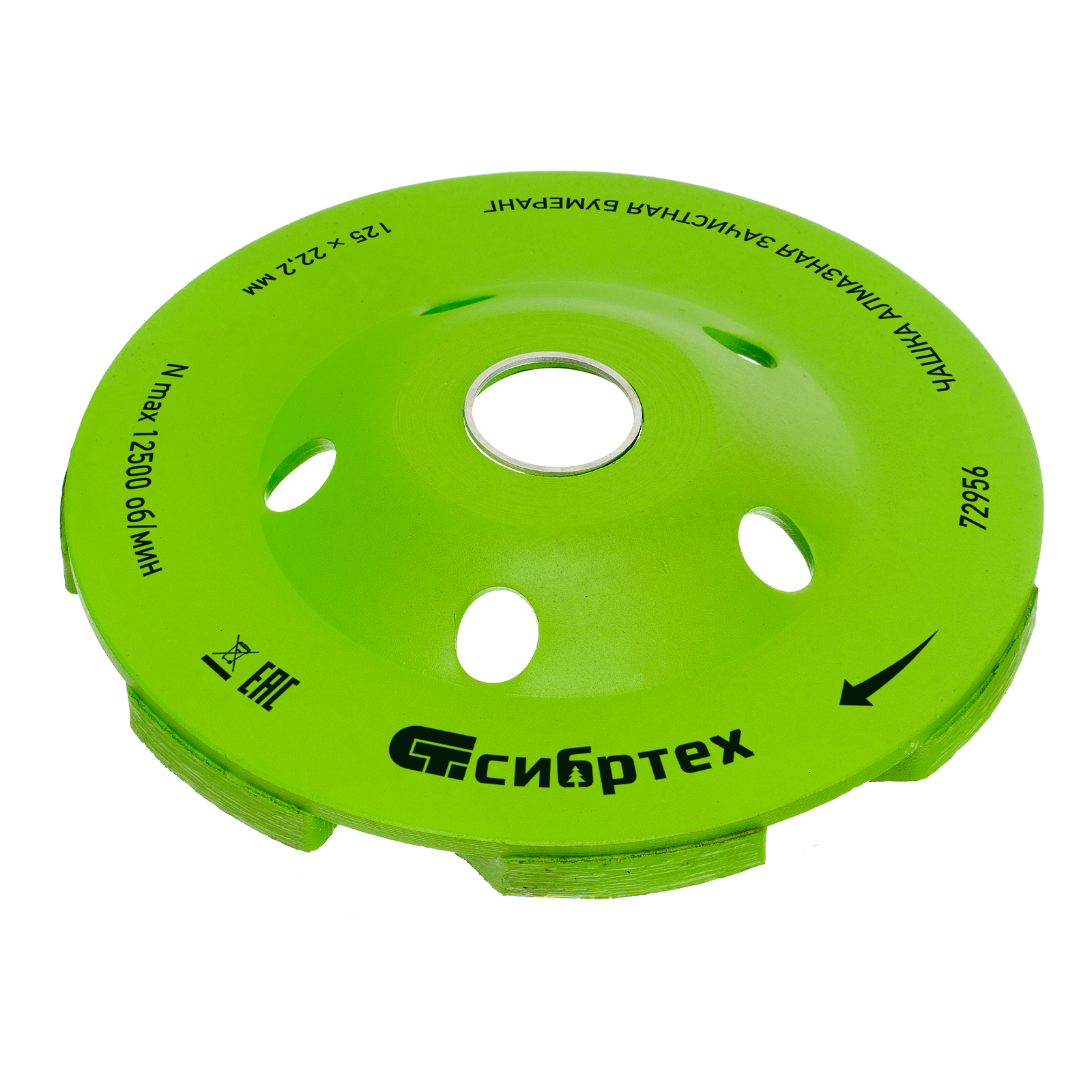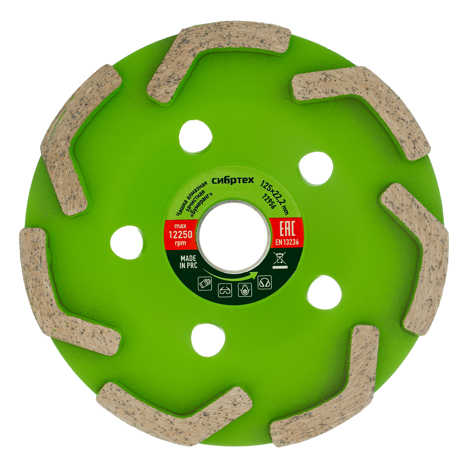Чашка алмазная зачистная 125 мм, бумеранг сибртех. Бренд: Сибртех Материал обработки: бетон, гранит, камень, кирпич, мрамор Основание: штампованное Посадочный диаметр: 22,20 мм Страна производства: Китай Диаметр, мм: 125 Тип упаковки: картонная коробка Длина в упаковке, мм: 170 Ширина в упаковке, мм: 130 Вес (брутто), кг: 0.47 Чашка алмазная: 1 шт Зачистная алмазная чашка Сибртех «Бумеранг» 72956 диаметром 125 мм предназначена для обработки мраморных, гранитных, бетонных, кирпичных и каменных поверхностей. Универсальную чашку можно использовать для черновой обработки (снятия небольших неровностей) и для выравнивания, получения гладких поверхностей. Чашка используется в качестве оснастки для УШМ с посадочным диаметром 22,2 мм, рассчитана на бытовое применение. Преимущества Плавная и эффективная работа — алмазные сегменты имеют форму бумерангов, перфорированный корпус обеспечивает эффективный отвод пыли. Надежность и долговечность — корпус выполнен из стали, рабочий слой состоит из высокопрочных синтетических алмазов, его высота составляет 5 мм. Защита от разрушения — эмалевое покрытие предотвращает появление коррозии.  развернуть описание ▼