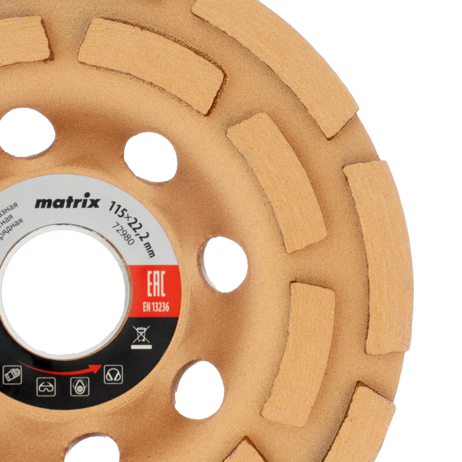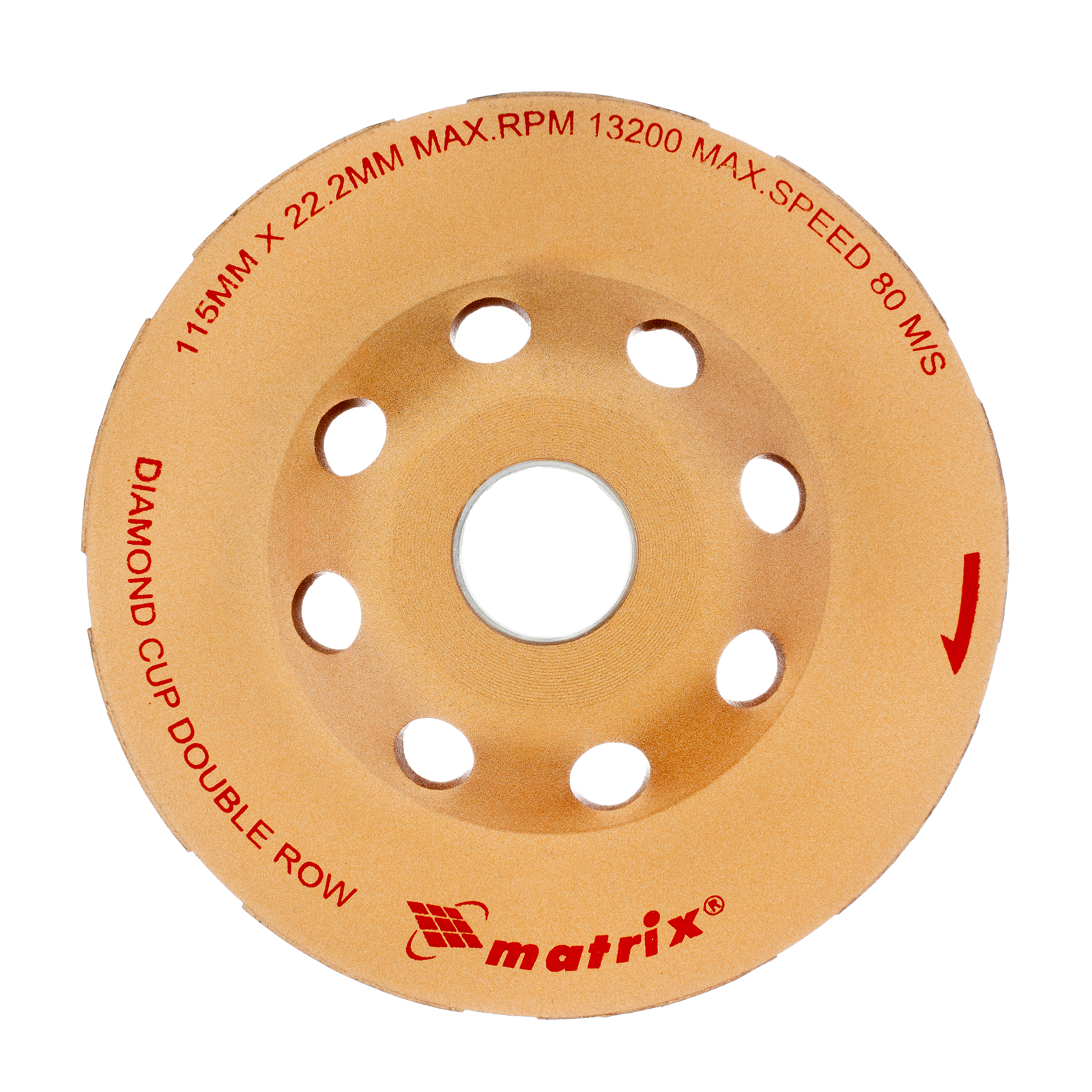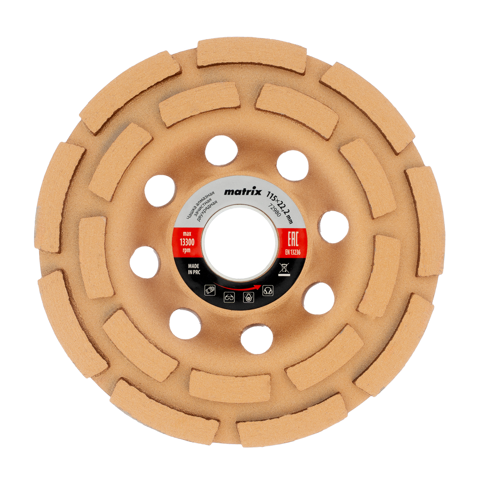 Чашка алмазная зачистная, 115 мм, двухрядная matrix. Бренд: Matrix Материал обработки: бетон, гранит, камень, кирпич, мрамор Основание: штампованное Посадочный диаметр: 22,20 мм Страна производства: Китай Диаметр, мм: 115 Тип упаковки: картонная коробка Длина в упаковке, мм: 160 Ширина в упаковке, мм: 120 Вес (брутто), кг: 0.44 Чашка алмазная: 1 шт Двухрядная алмазная зачистная чашка Matrix 72980 диаметром 115 мм, с посадочным отверстием 22,2 мм, — оснастка для углошлифовальных машин, предназначенная для грубой обработки бетонных, каменных, кирпичных, мраморных и гранитных поверхностей. Позволяет проводить зачистку швов, стыков, неровностей, удаление наплывов. Придает поверхности шероховатость для улучшения ее адгезивной способности перед нанесением строительных растворов. Чашка предназначена для профессионального применения. Преимущества Высокий ресурс — рабочий слой толщиной 5 мм характеризуется увеличенной плотностью алмазов и сбалансированной связкой. Производительность — сегменты рабочей части расположены в 2 ряда, поэтому насадка снимает толстый слой материала. Эффективность и долгий срок службы — в корпусе предусмотрены отверстия для отвода шлама и тепла. Устойчивость к воздействию влаги — стальной корпус покрыт эмалью для защиты от коррозии. Гарантированное качество — чашка произведена на специализированном заводе с соблюдением всех технологический требований.  развернуть описание ▼
