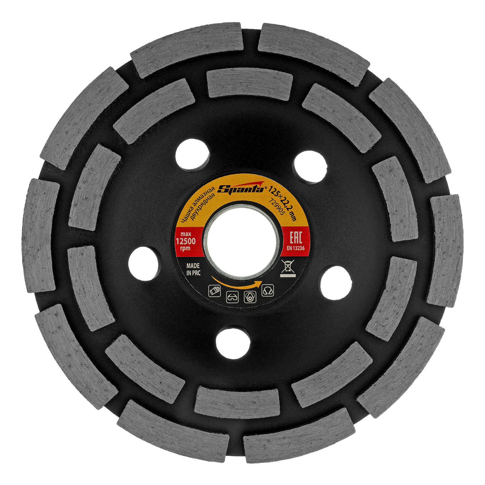 Чашка алмазная зачистная, 125 мм, двухрядная sparta. Бренд: Sparta Материал обработки: бетон, гранит, камень, кирпич, мрамор Основание: штампованное Посадочный диаметр: 22,20 мм Страна производства: Китай Высота сегмента, мм: 4.5 Диаметр, мм: 125 Тип упаковки: картонная коробка Длина в упаковке, мм: 165 Вес (брутто), кг: 0.44 Чашка алмазная: 1 шт Двухрядная алмазная зачистная чашка Sparta 729905 с посадочным отверстием 22,2 мм используется с углошлифовальными машинами, совместимыми с оснасткой диаметром 125 мм. Применяется для грубой обработки бетонных, мраморных, гранитных, каменных и кирпичных поверхностей. Эффективно зачищает стыки и швы, устраняет крупные дефекты, удаляет наплывы, снимая толстый слой материала. Алмазные сегменты расположены в 2 ряда, что в сочетании с толщиной рабочего слоя 4,5 мм обеспечивает высокую производительность. Преимущества Эффективный отвод шлама — в корпусе чаши предусмотрены специальные отверстия. Защита от разрушения — эмалированный стальной корпус не подвержен коррозии. Подтвержденное качество — зачистная чашка произведена на фирменном заводе и прошла контроль качества.  развернуть описание ▼