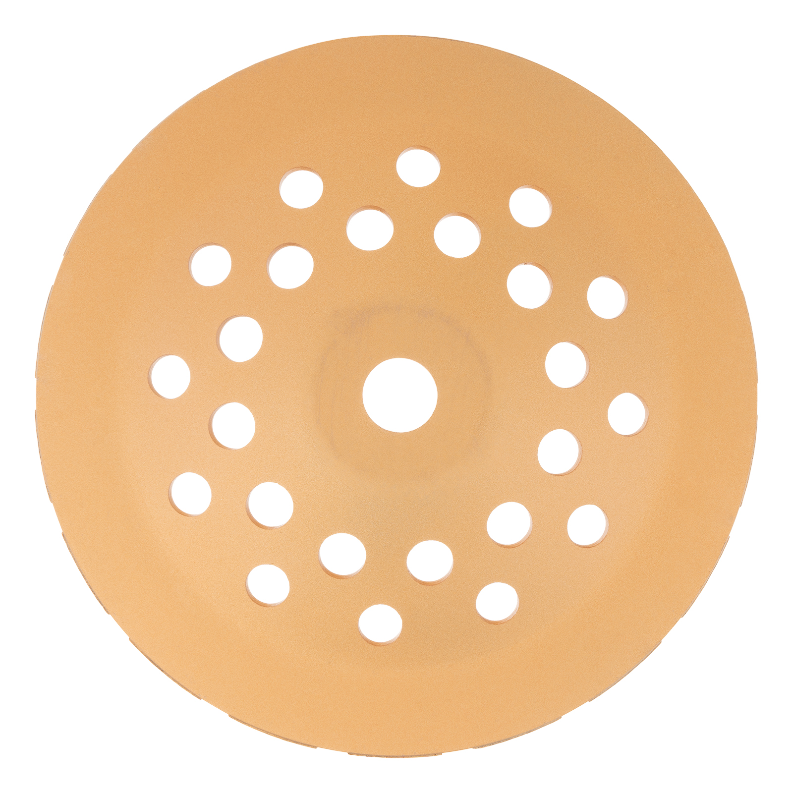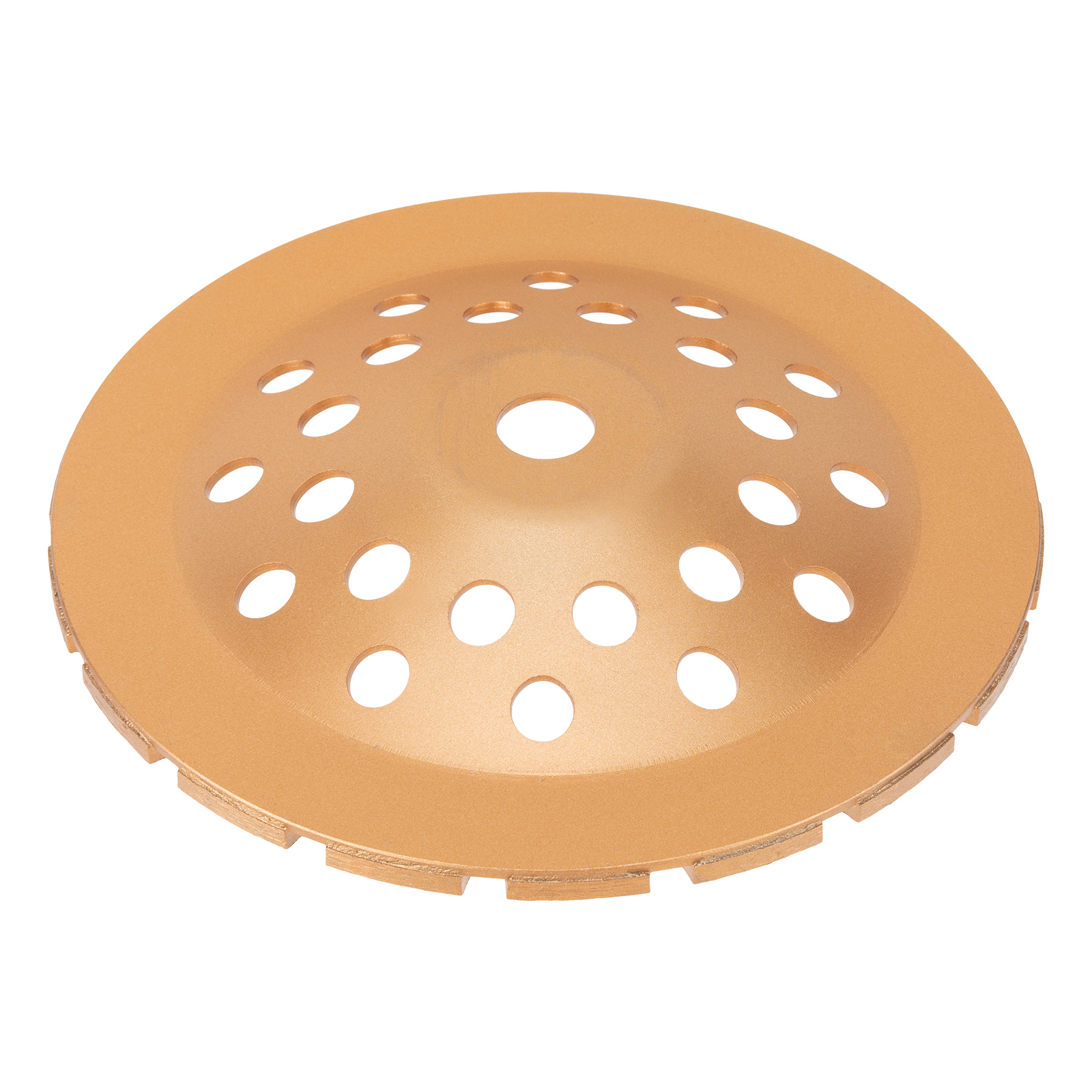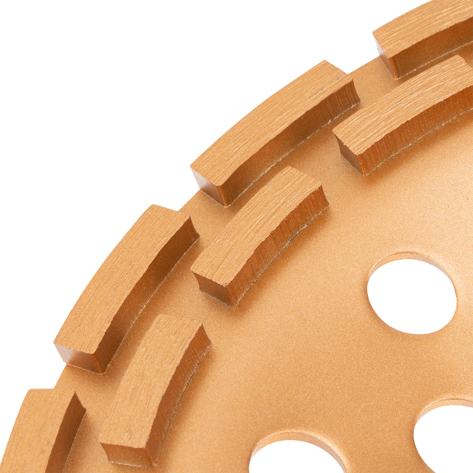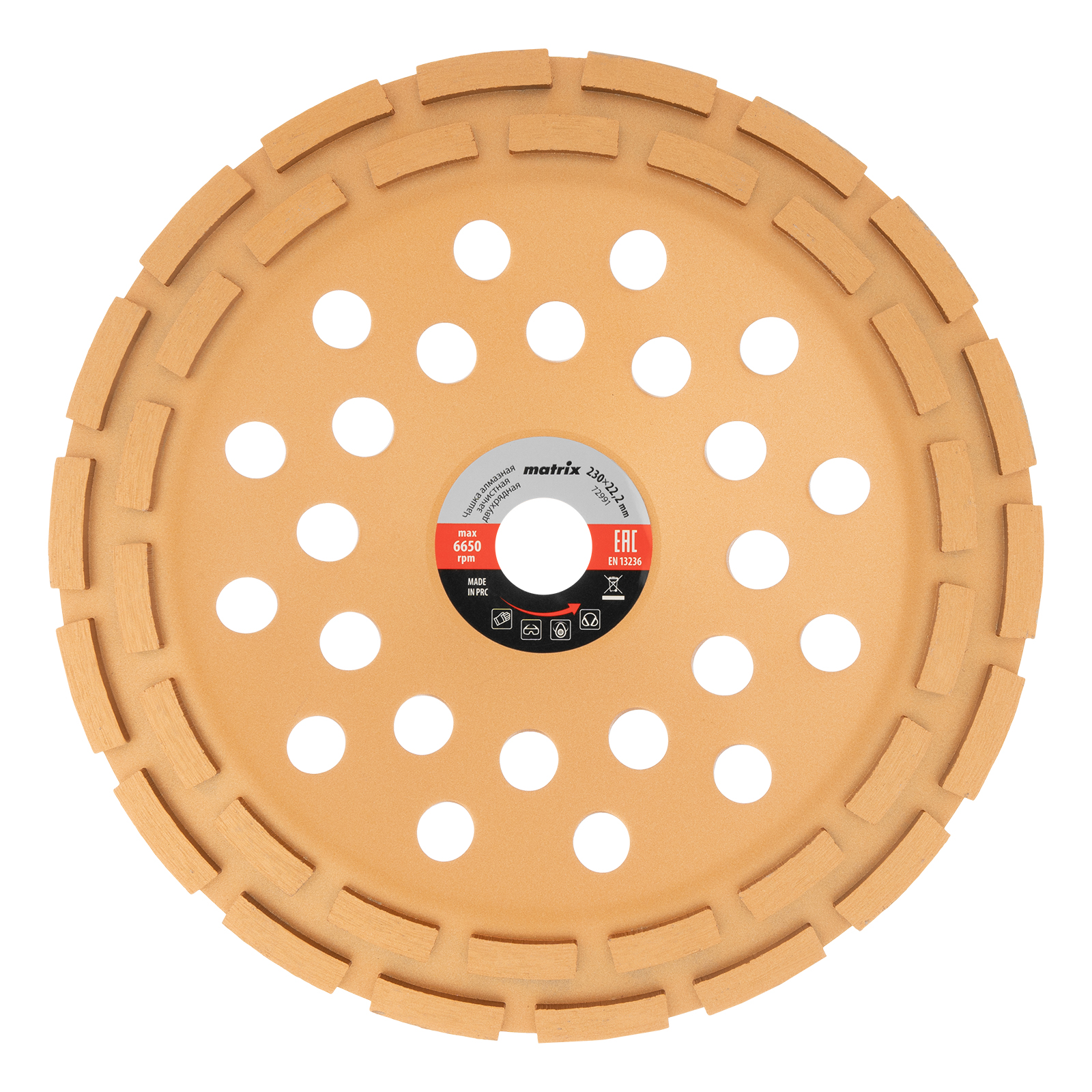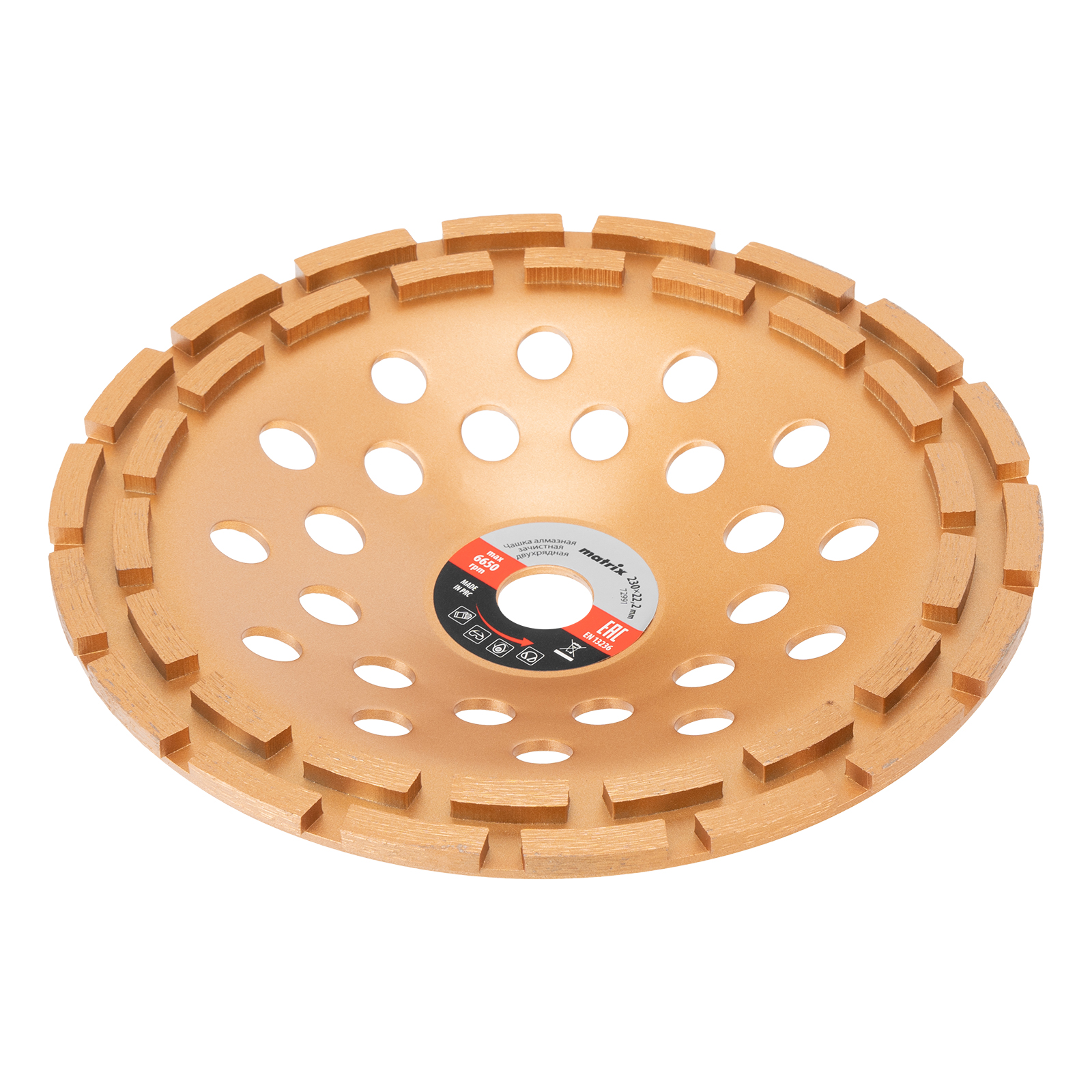 Чашка алмазная зачистная, 230 мм, двухрядная matrix. Бренд: Matrix Материал обработки: бетон, гранит, камень, кирпич, мрамор Основание: штампованное Посадочный диаметр: 22,20 мм Страна производства: Китай Диаметр, мм: 230 Тип упаковки: картонная коробка Вес (брутто), кг: 1.8 Чашка алмазная: 1 шт Двухрядная алмазная зачистная чашка Matrix 72991 диаметром 230 мм, с посадочным отверстием 22,2 мм, — оснастка для углошлифовальных машин, предназначенная для грубой обработки бетонных, каменных, кирпичных, мраморных и гранитных поверхностей. Позволяет проводить зачистку швов, стыков, неровностей, удаление наплывов. Придает поверхности шероховатость для улучшения ее адгезивной способности перед нанесением строительных растворов. Чашка предназначена для профессионального применения. Преимущества Высокий ресурс — рабочий слой толщиной 6 мм характеризуется увеличенной плотностью алмазов и сбалансированной связкой. Производительность — сегменты рабочей части расположены в 2 ряда, поэтому насадка снимает толстый слой материала. Эффективность и долгий срок службы — в корпусе предусмотрены отверстия для отвода шлама и тепла. Устойчивость к воздействию влаги — стальной корпус покрыт эмалью для защиты от коррозии. Гарантированное качество — чашка произведена на специализированном заводе с соблюдением всех технологический требований.  развернуть описание ▼