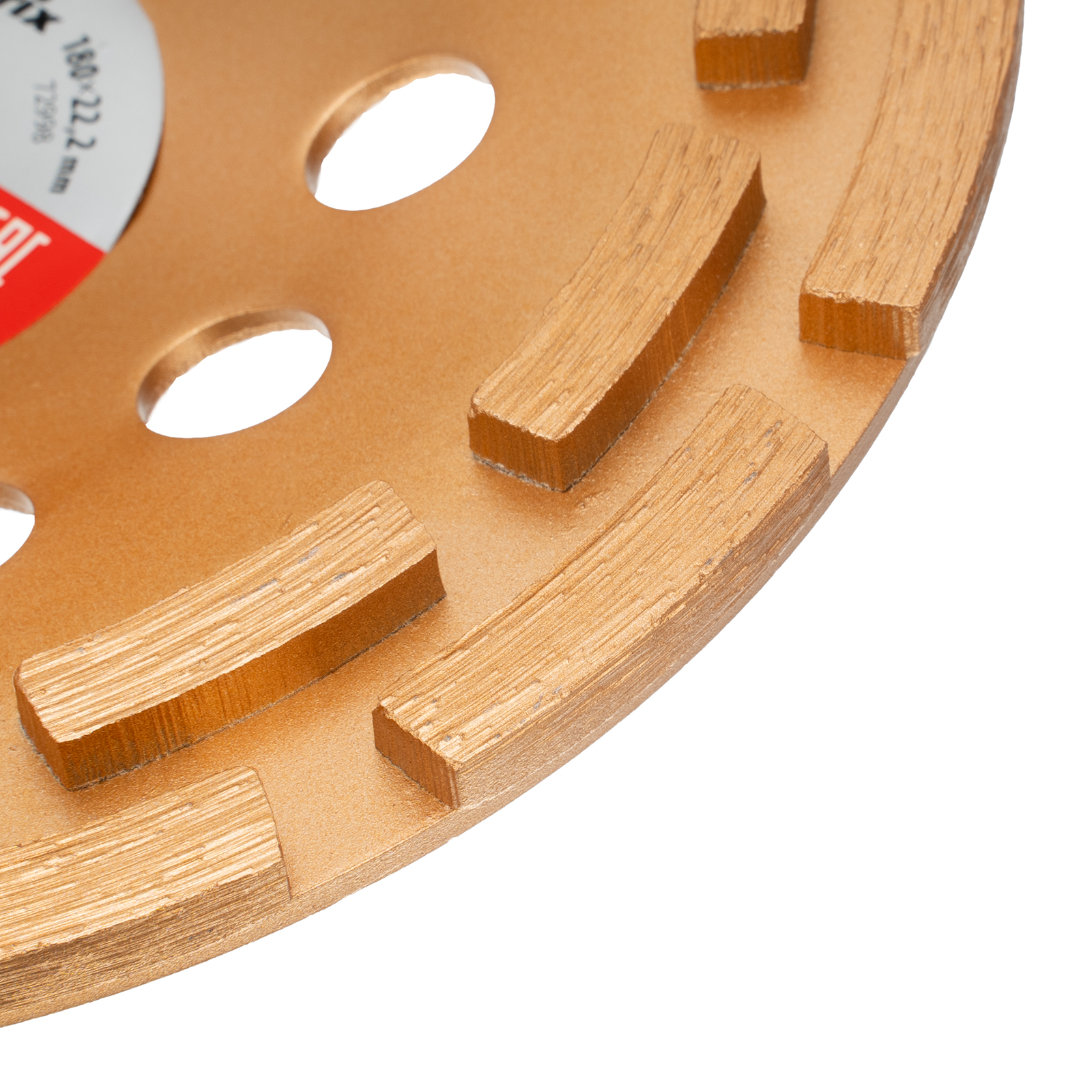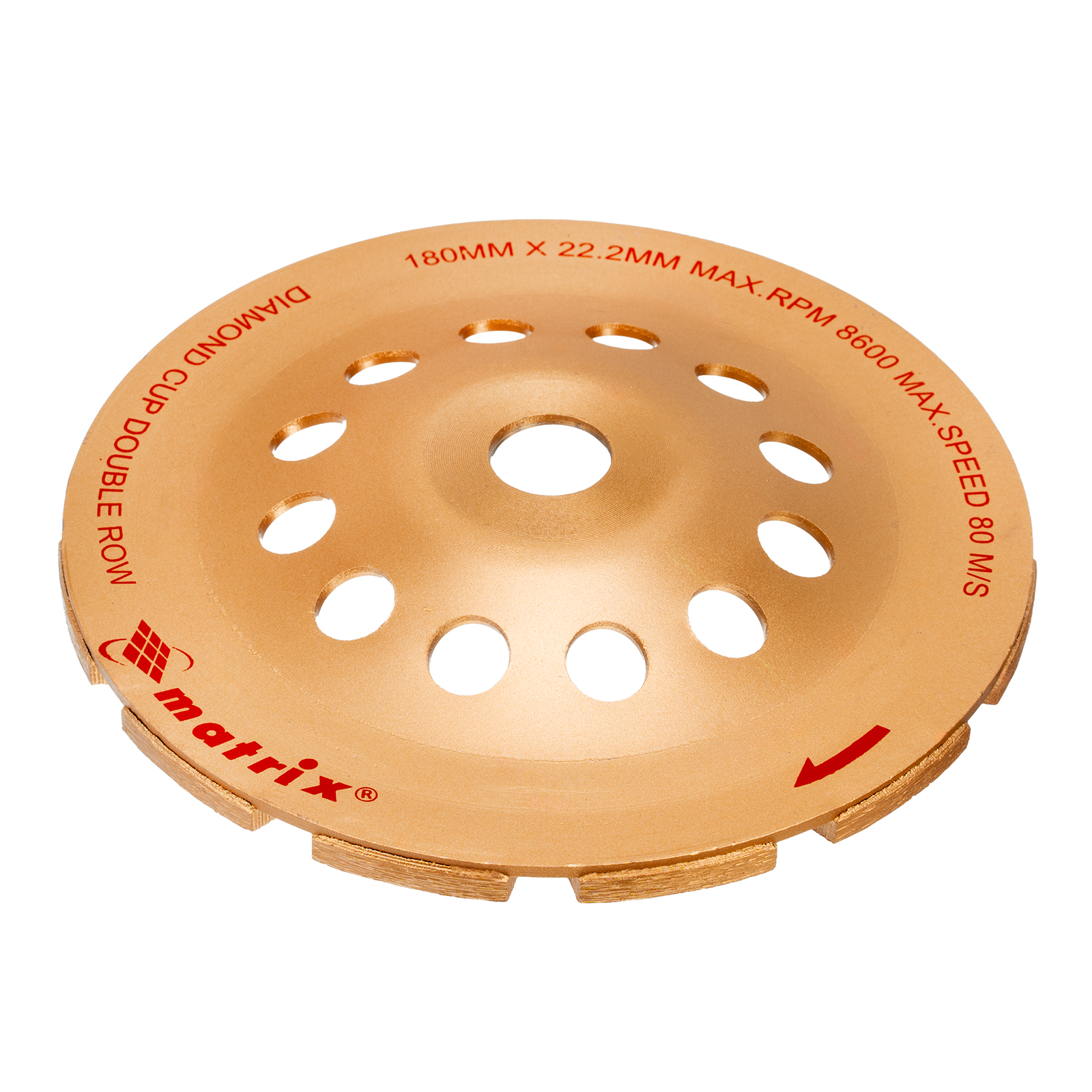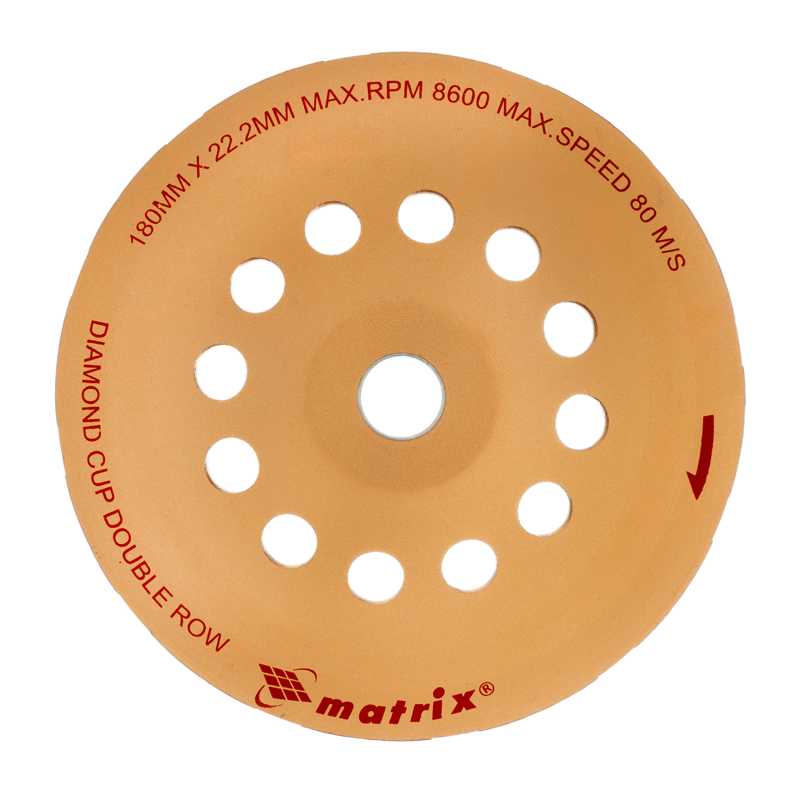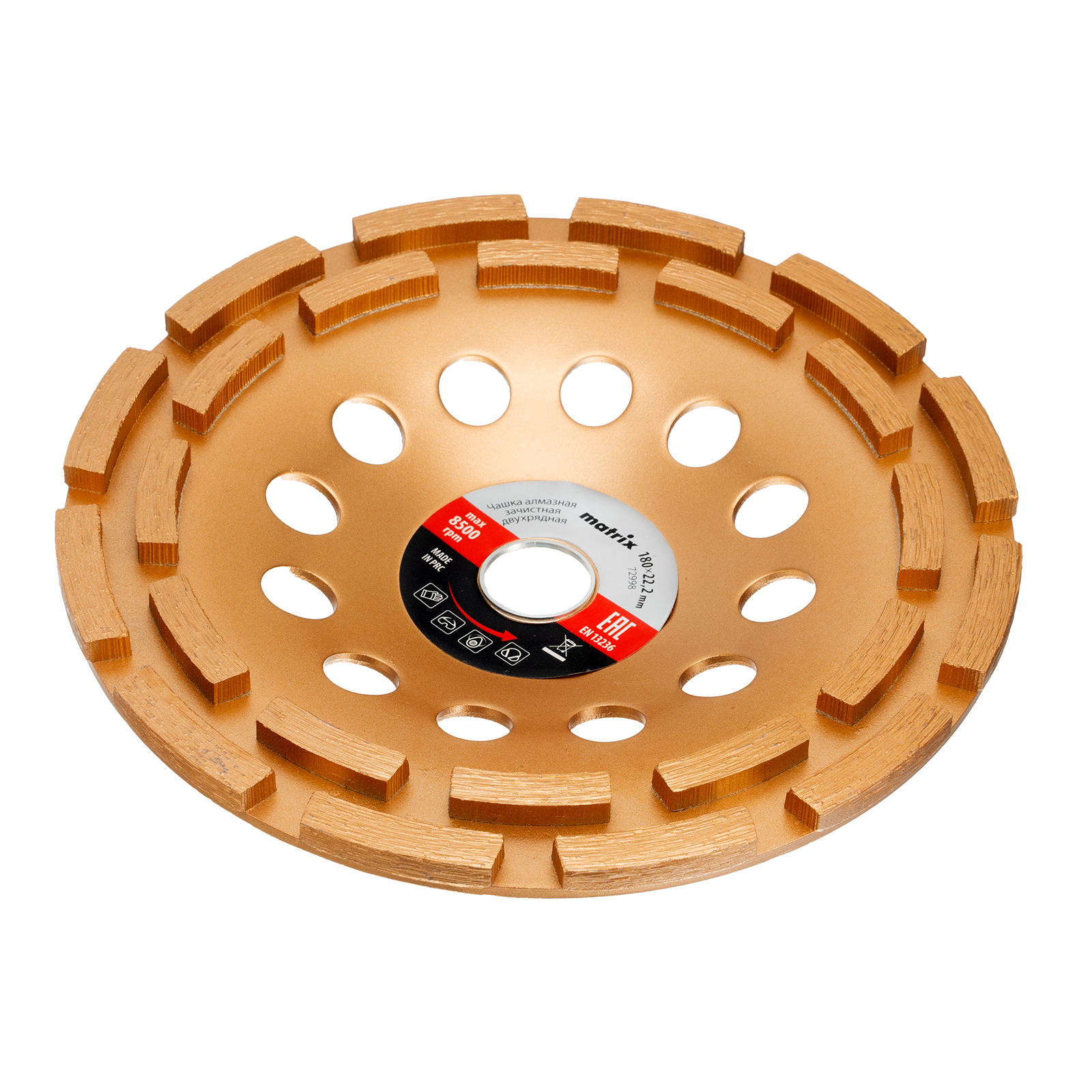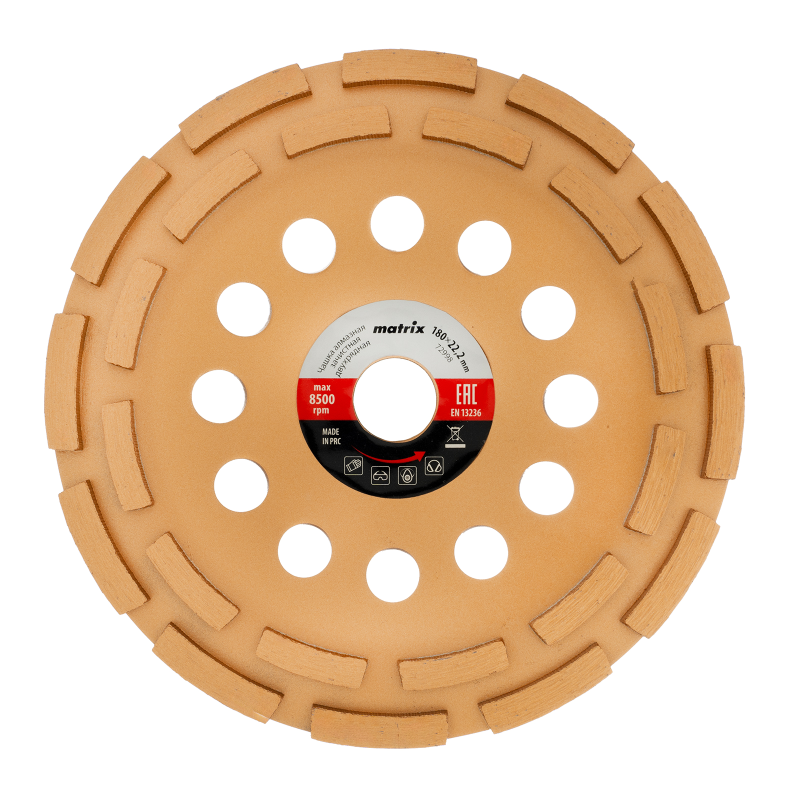 Чашка алмазная зачистная, 180 мм, двухрядная matrix. Бренд: Matrix Материал обработки: бетон, гранит, камень, кирпич, мрамор Основание: штампованное Посадочный диаметр: 22,20 мм Страна производства: Китай Тип упаковки: картонная коробка Длина в упаковке, мм: 225 Ширина в упаковке, мм: 185 Вес (брутто), кг: 0.91 Чашка алмазная: 1 шт Двухрядная алмазная зачистная чашка Matrix 72998 диаметром 180 мм, с посадочным отверстием 22,2 мм, — оснастка для углошлифовальных машин, предназначенная для грубой обработки бетонных, каменных, кирпичных, мраморных и гранитных поверхностей. Позволяет проводить зачистку швов, стыков, неровностей, удаление наплывов. Придает поверхности шероховатость для улучшения ее адгезивной способности перед нанесением строительных растворов. Чашка предназначена для профессионального применения. Преимущества Высокий ресурс — рабочий слой толщиной 5 мм характеризуется увеличенной плотностью алмазов и сбалансированной связкой. Производительность — сегменты рабочей части расположены в 2 ряда, поэтому насадка снимает толстый слой материала. Эффективность и долгий срок службы — в корпусе предусмотрены отверстия для отвода шлама и тепла. Устойчивость к воздействию влаги — стальной корпус покрыт эмалью для защиты от коррозии. Гарантированное качество — чашка произведена на специализированном заводе с соблюдением всех технологический требований.  развернуть описание ▼