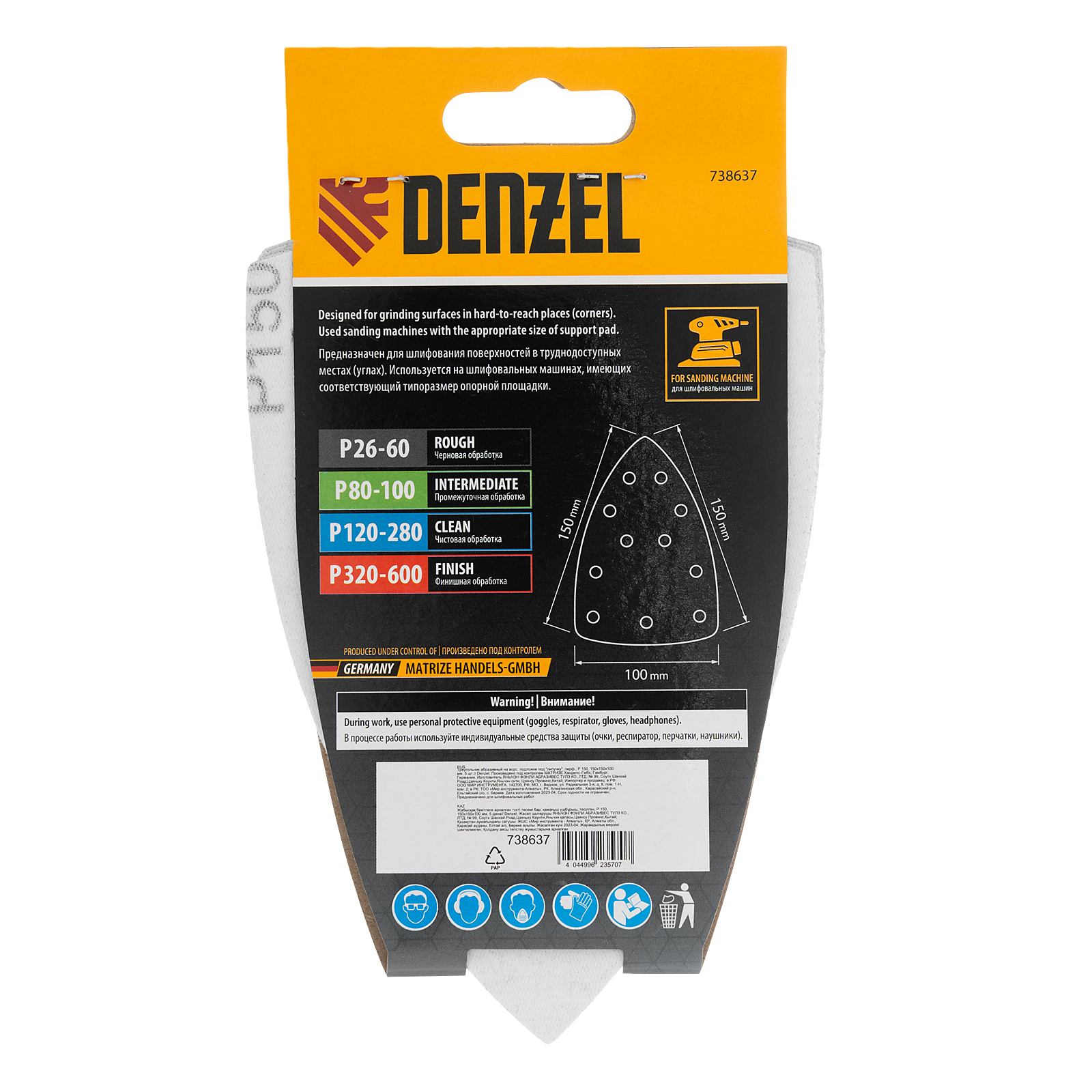 Треугольник абразивный на ворc. подложке под липучку, перф., P 150, 150х150х100 мм, 5 шт. Denzel