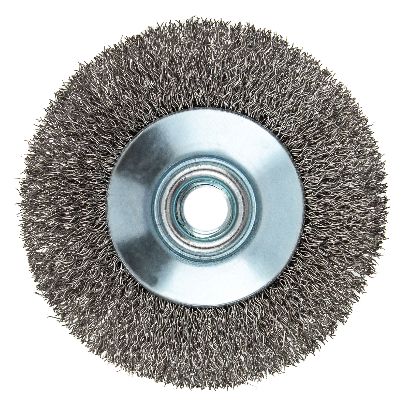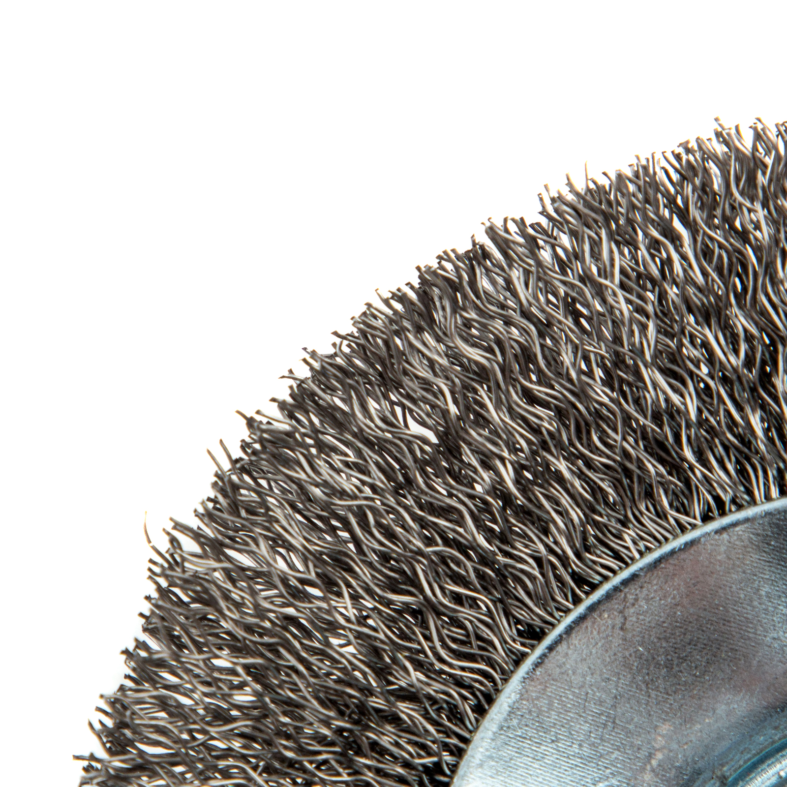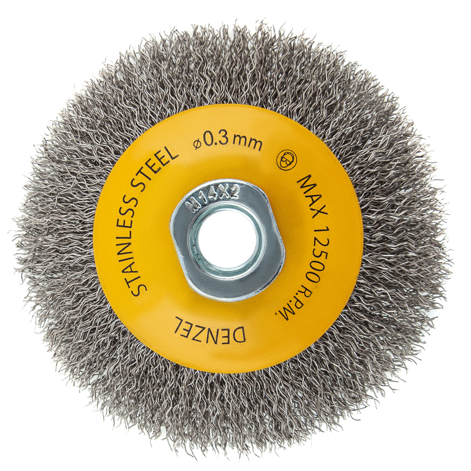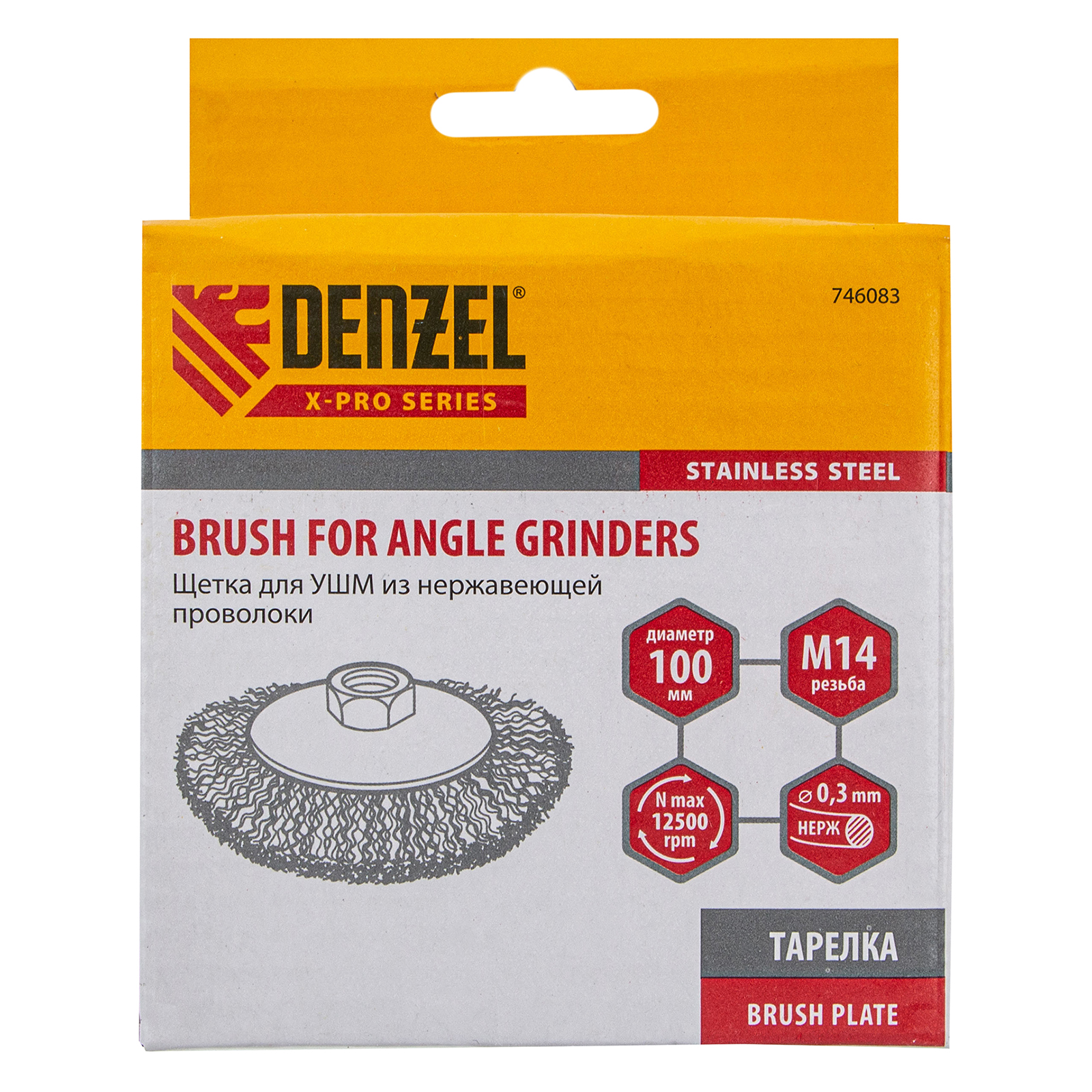 Щетка для ушм, 100 мм, тарелка, витая нержавеющая проволока 0.3 мм, м14 Denzel