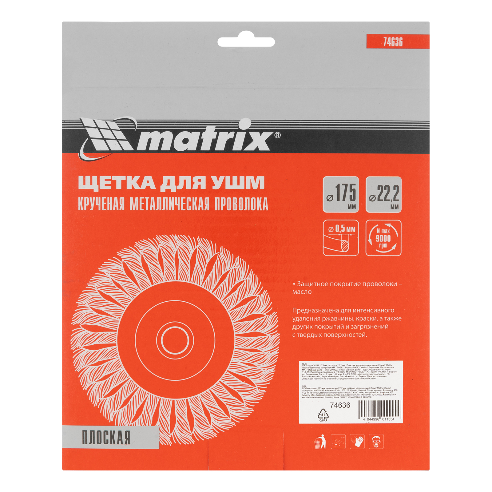 Щетка для ушм 175 мм, посадка 22.2 мм, плоская, крученая проволока 0.5 мм Matrix