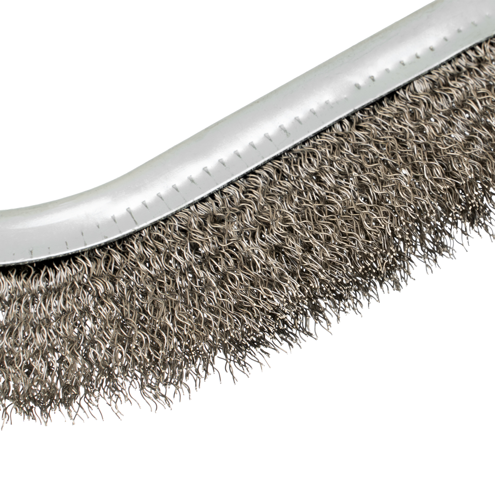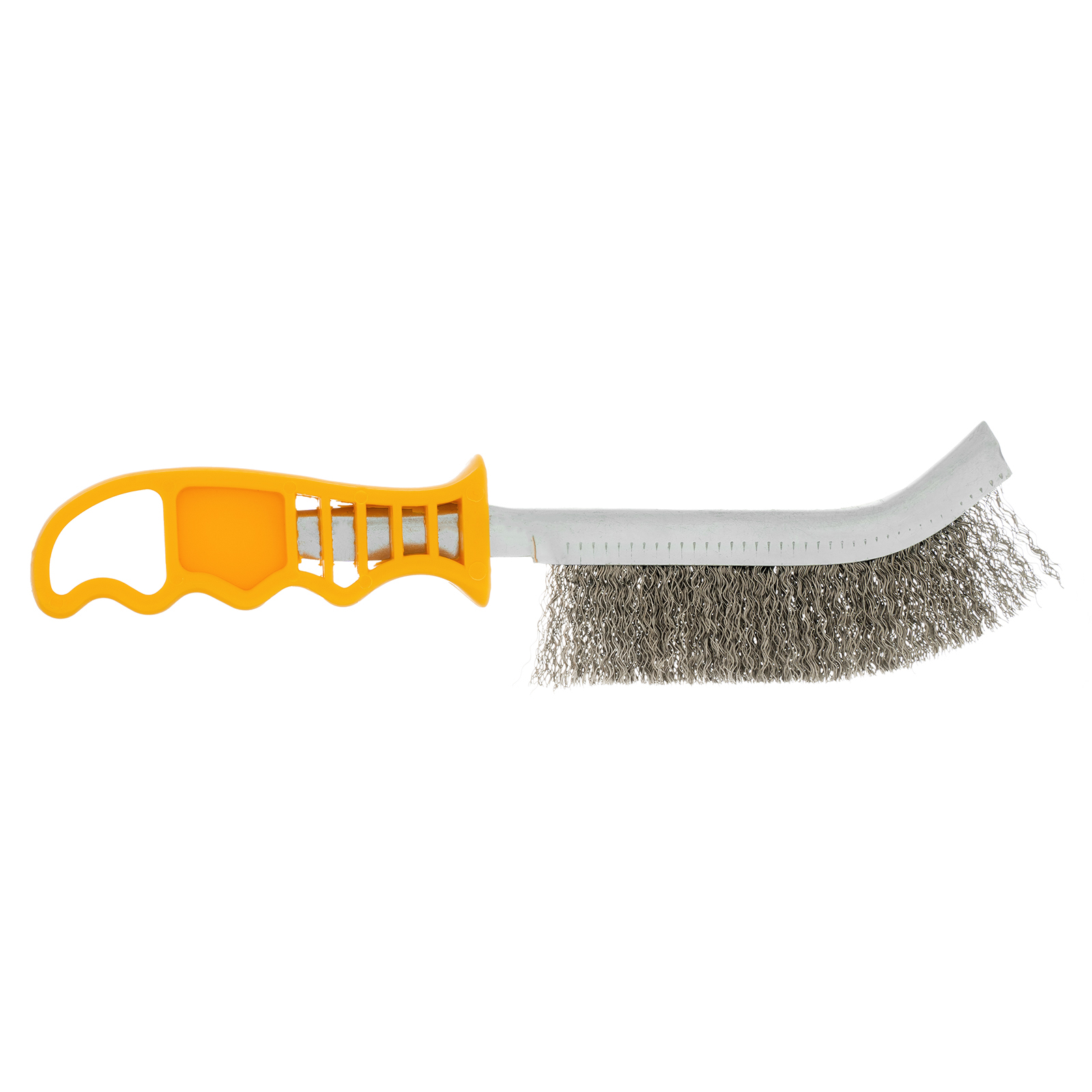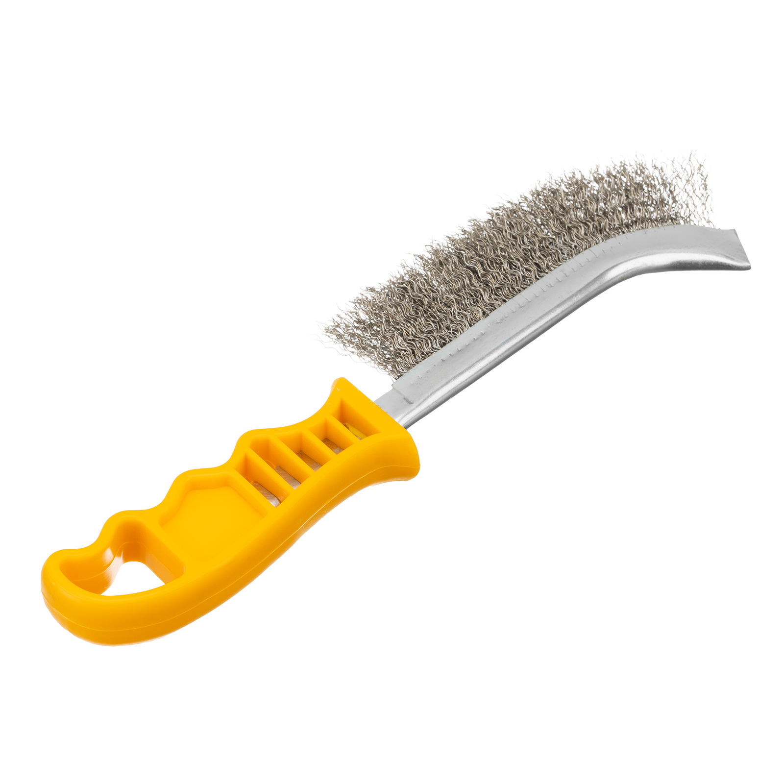 Щетка металлическая с пластмассовой ручкой, нержавеющая проволока denzel. Бренд: DENZEL Материал: металл, пластик Страна производства: Китай Длина в упаковке, мм: 250 Вес (брутто), кг: 0.122 Щетка металлическая: 1 шт Металлическая зачистная щетка Denzel 748287 с пластмассовой рукояткой и щетиной из нержавеющей проволоки, используется для очищения металлических, деревянных и других поверхностей от ржавчины, загрязнений, остатков лакокрасочных покрытий. Щетина из нержавейки с высокой абразивной способностью обеспечивает эффективность щетки. Благодаря изогнутому корпусу щетка удобна для обработки поверхностей со сложным рельефом. Инструмент пригодится во время строительства, кузовного ремонта, а также на производстве и в быту. Преимущества Высокое качество выполняемых работ — частицы щетины из нержавеющей стали, остающиеся в порах обрабатываемого материала, не вызывают коррозии его поверхности. Износостойкость — благодаря увеличенной плотности пучков щетина устойчива к истиранию, надежно закрепленная проволока не выпадает во время работы. Комфортное использование — пластиковая рукоятка с выемками для пальцев удобно ложится в руку.  развернуть описание ▼