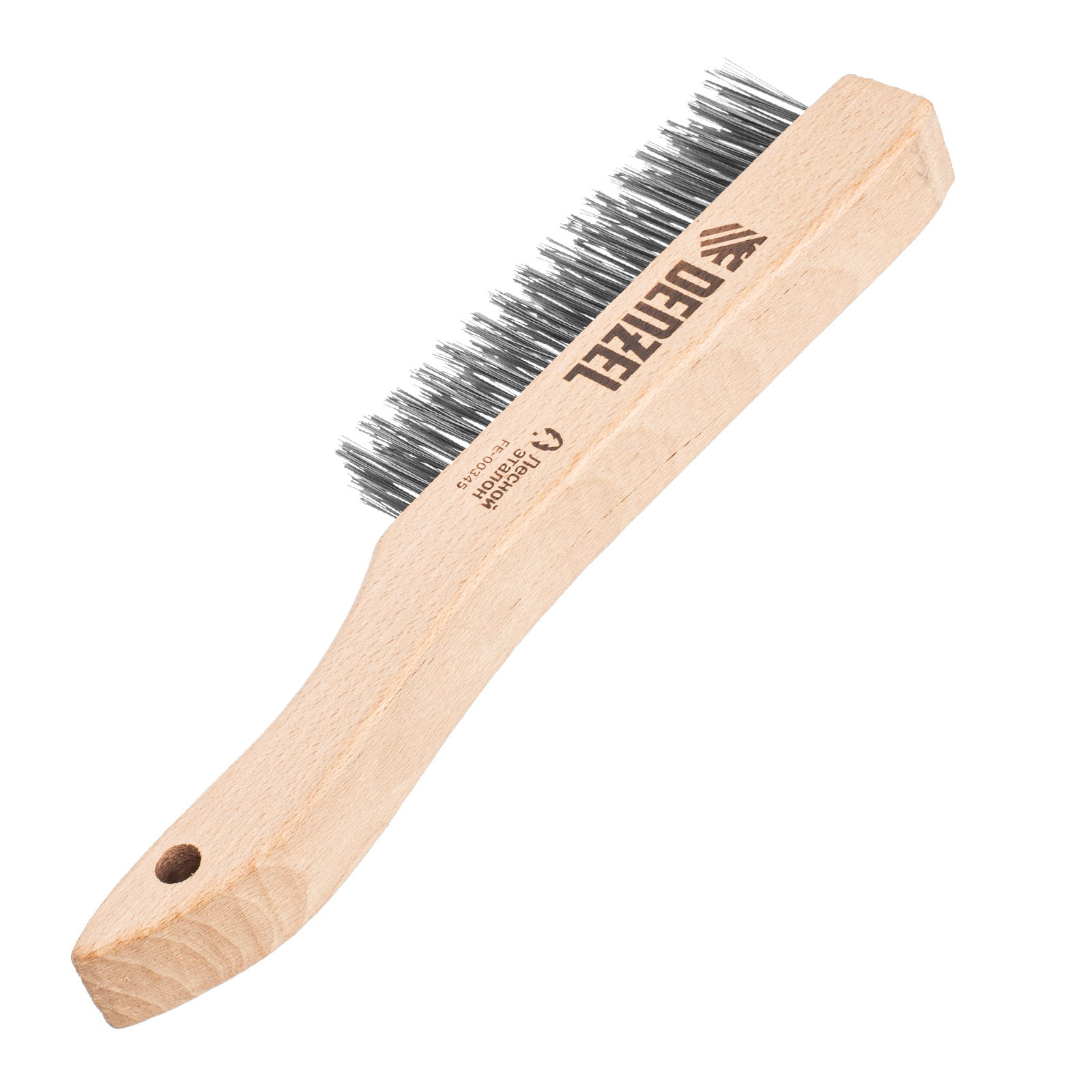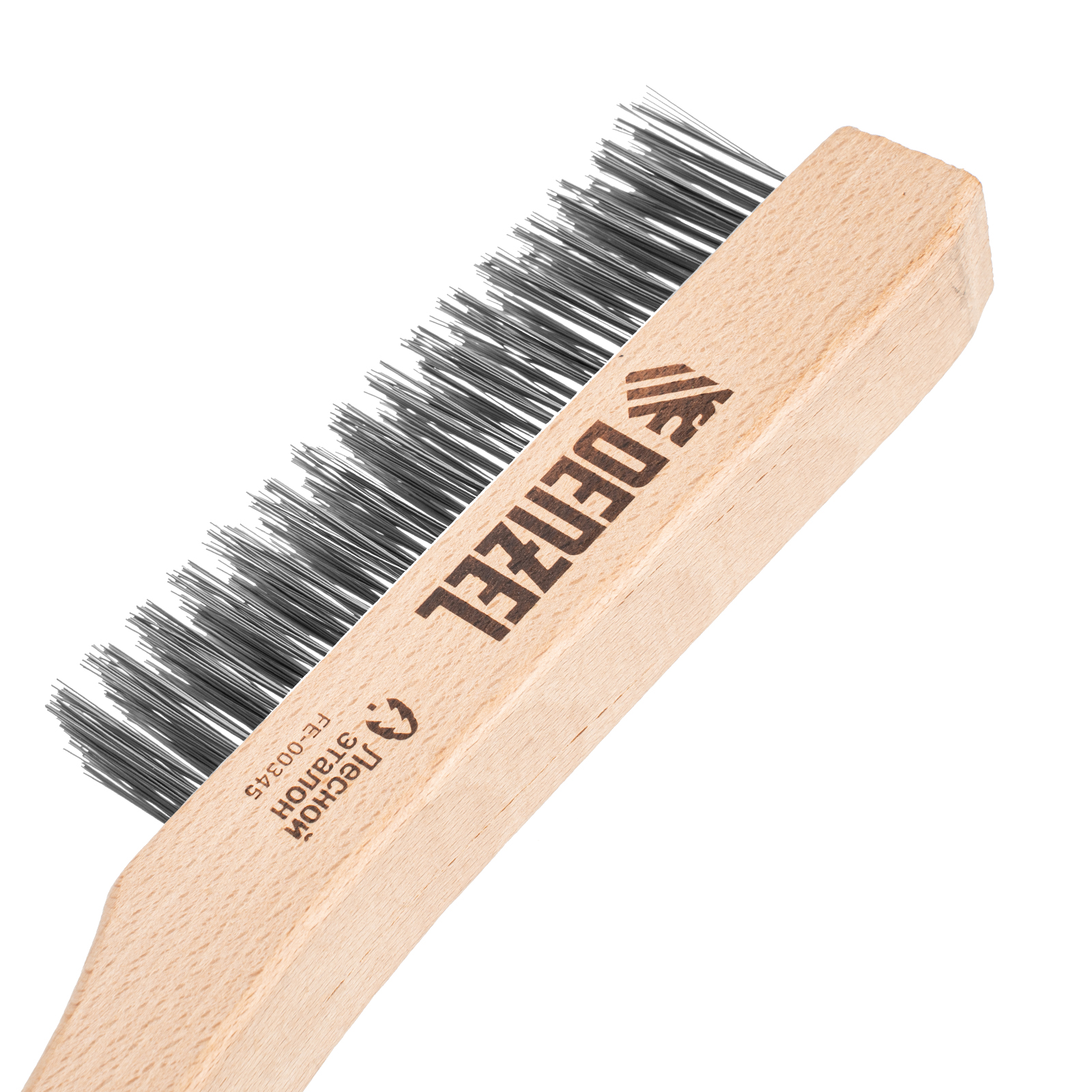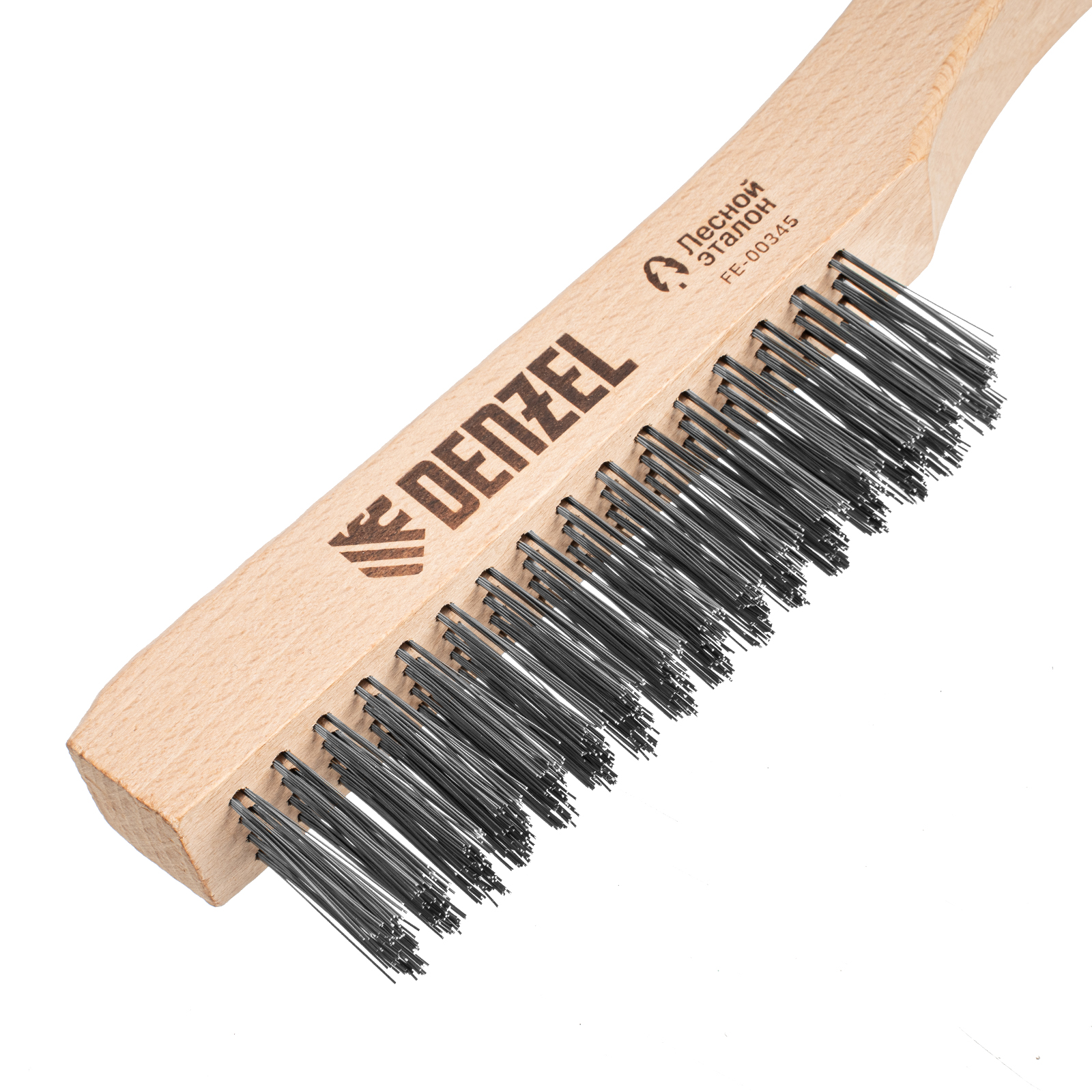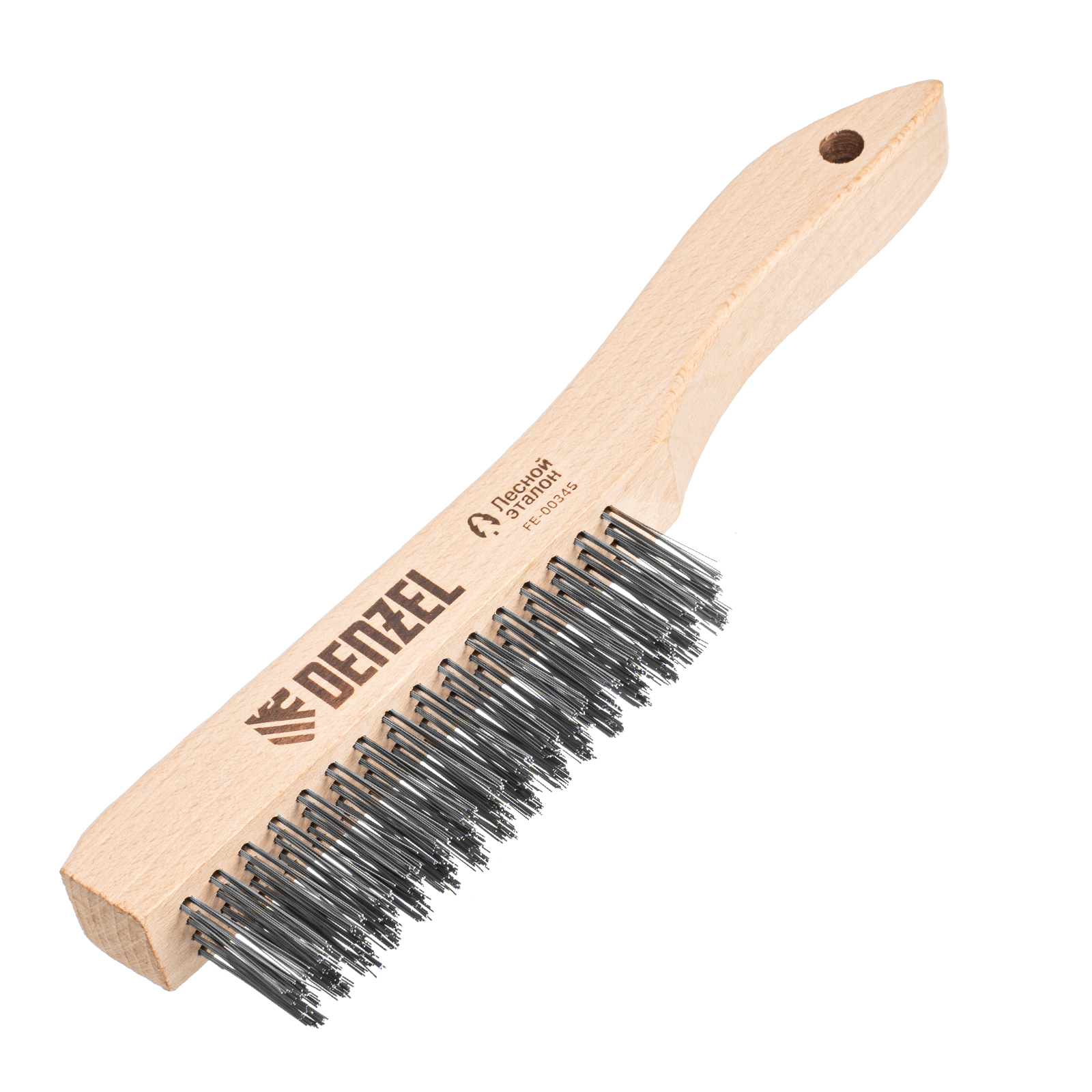 Щетка зачистная 4-х рядная, прямая проволока из нержавеющей стали с деревянной ручкой, efp// denzel. Бренд: DENZEL Материал: древесина Материал рукояти: дерево Материал щетины: прямая проволока из нержавеющей стали Страна производства: Китай Длина, мм: 261.5 Длина рабочей части, мм: 151 Длина щетки, мм: 120 Тип упаковки: карта картонная подвесная Длина в упаковке, мм: 260 Вес (брутто), кг: 0.16 Зачистная 4-рядная щетка Denzel 74844 с прямой проволокой из нержавеющей стали и деревянной рукояткой — ручной инструмент для обработки деревянных, металлических и других поверхностей. Позволяет удалять загрязнения, ржавчину, остатки отделочных покрытий и т.д. Стальная щетина толщиной 0,3 мм с высокой абразивной способностью, расположенная в 4 ряда, обеспечивает эффективное выполнение работ. Преимущества Высокое качество обработки — щетина изготовлена из нержавеющей стали, ее частицы не вызывают микрокоррозии зачищаемого материала. Долговечность — стальная проволока устойчива к воздействию влаги. Комфортная работа — деревянная рукоятка удобно ложится в руку, что снижает усталость во время длительной работы. Экологичность — инструмент соответствует стандартам системы «Лесной эталон», при изготовлении использована древесина из сертифицированных лесов, полностью соблюдены требования, направленные на сохранение экологически ценных лесов.  развернуть описание ▼