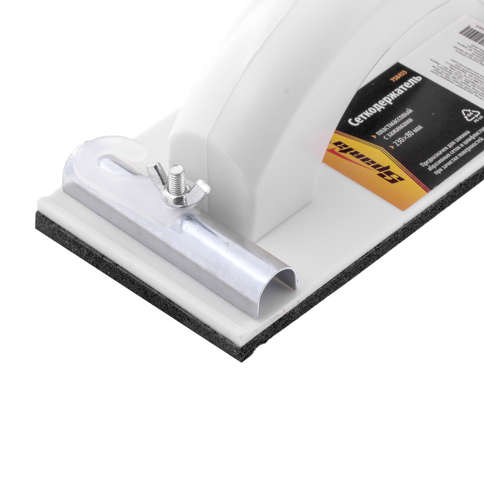 Сеткодержатель, 230 х 80 мм, пластиковый с зажимами sparta. Описание: Сеткодержатель ТМ Sparta предназначен для шлифования и зачистки различных поверхностей, с помощью абразивных материалов (шлифлист, сетка) надежно фиксируя их с помощью металлических зажимов. Применяется для выравнивания поверхностей после штукатурки или шпатлевки, удаление неровностей, снятие различных покрытий или загрязнений с твердых поверхностей. Особенности: Утолщенная пластиковая рукоятка. Износостойкая подошва из EVA. Вес (кг): 0,197 Бренд: SPARTA Тип упаковки: полиэтиленовый пакет Тип: сеткодержатель Материал корпуса: полипропилен Ширина подошвы (мм): 80 Длина подошвы (мм): 230 Материал подошвы: EVA Зажим: сталь Длина в упаковке (мм): 230 Ширина в упаковке (мм): 80 Высота в упаковке (мм): 50 Группа 1: 7-Режущий инструмент Группа: Бруски для шлифования Группа 3: 758-Бруски для шлифования, терки Тип скидки: Импорт