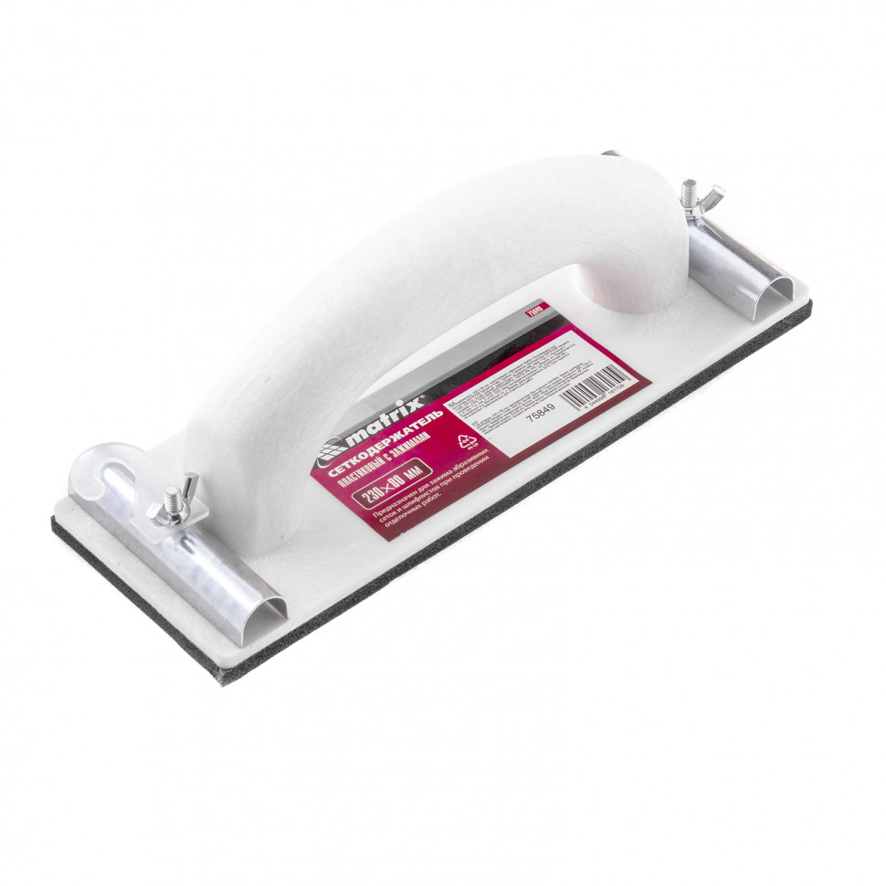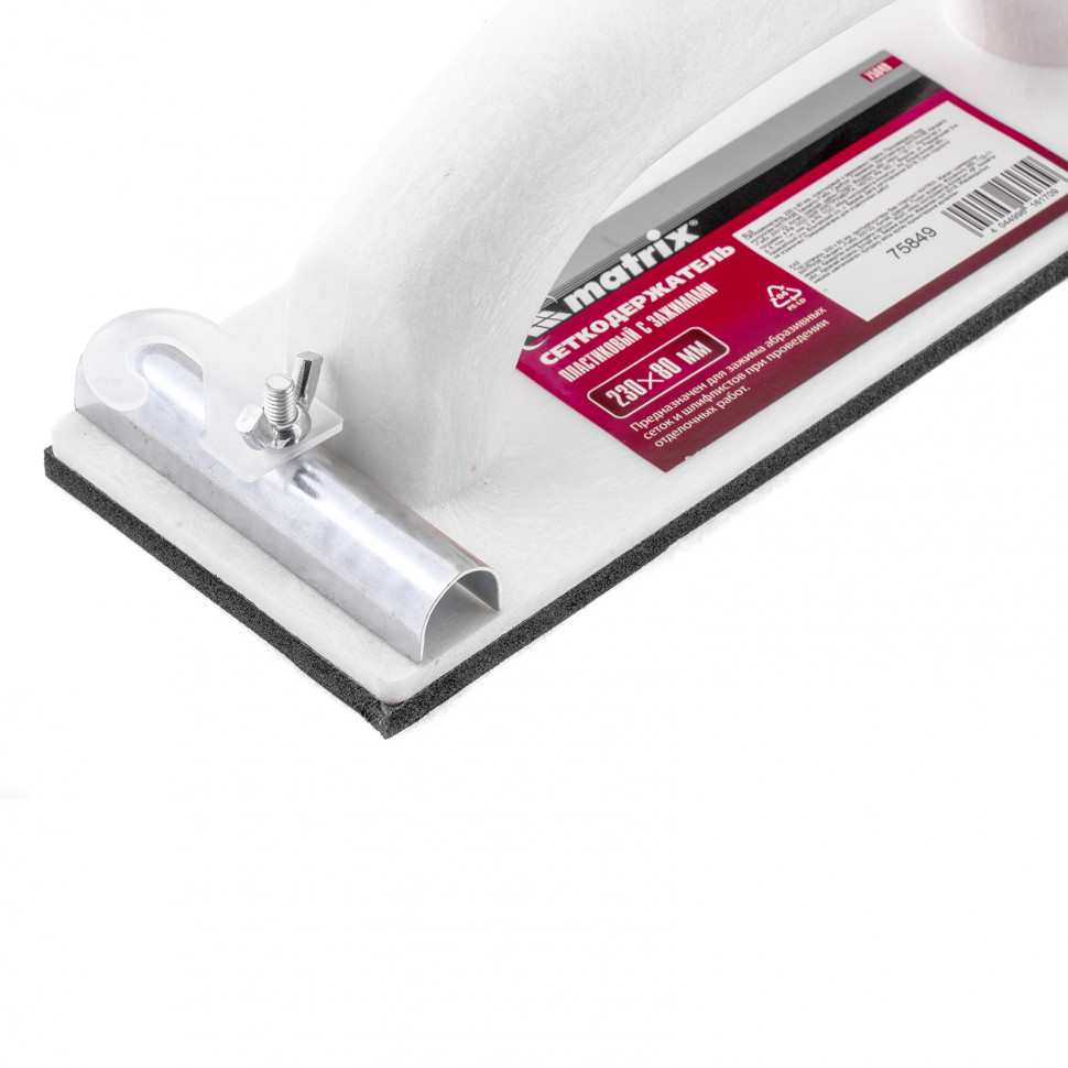 Сеткодержатель, 230 х 80 мм, пластиковый с зажимами matrix. Бренд: Matrix Зажим: сталь Крепление шлифлиста: зажим Материал корпуса: полипропилен Материал обработки: универсальный Материал подошвы: ЭВА Материал ручки: пластик Страна производства: Китай Тип упаковки: пакет с подвесом Высота в упаковке, мм: 50 Вес (брутто), кг: 0.23 Сеткодержатель: 1 шт Пластиковый сеткодержатель Matrix 75849 с подошвой 230 х 80 мм, с зажимами, используется для ручного шлифования деревянных, шпатлеванных, металлических, пластмассовых и прочих твердых поверхностей. Сеткодержатель фиксирует абразивную стеклосетку или шлифлист и позволяет удалять старые отделочные покрытия, подготавливать поверхность под покраску, а также выполнять чистовую обработку. Преимуществ Прочность — корпус из полипропилена устойчив к повреждениям в случае небольших ударов и случайных падений. Износостойкость — подошва из вспененного каучука EVA отлично держит форму и не боится перепадов температуры. Надежная фиксация абразивного материала — благодаря винтовым зажимам сетка или шлифлист не смещается во время работы. Комфортная работа — удобная ручка обеспечивает надежный хват.  развернуть описание ▼