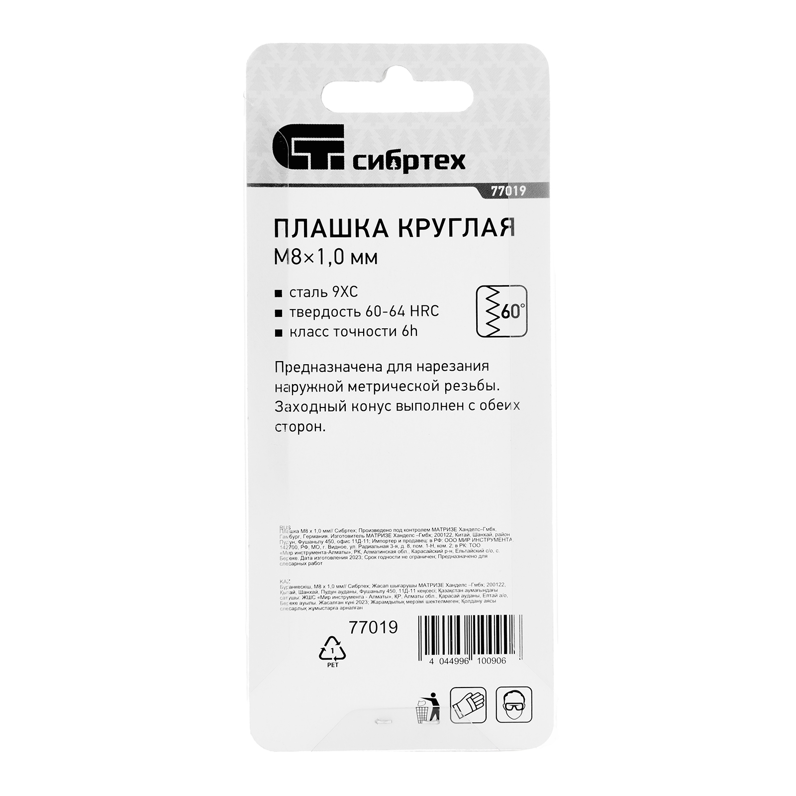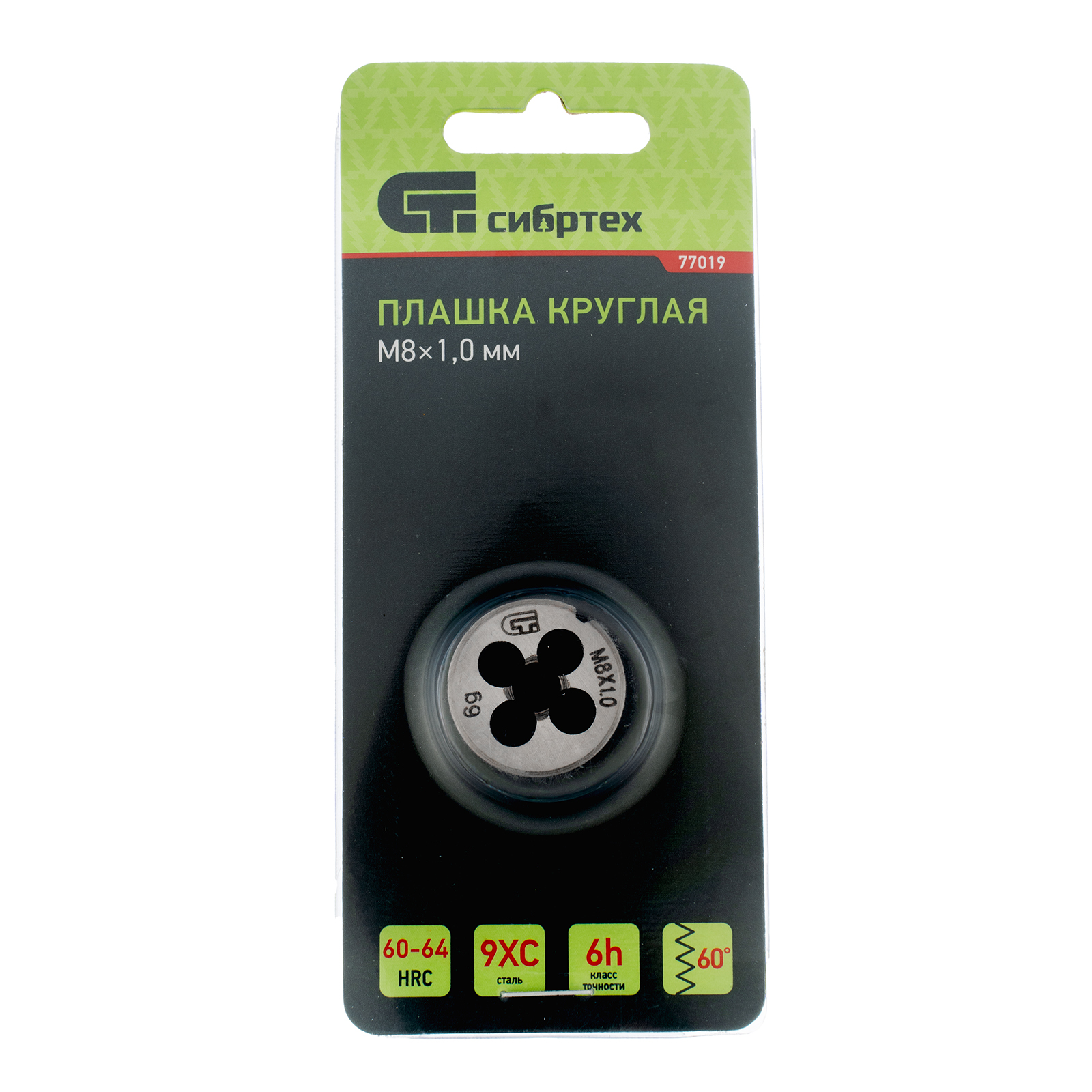 Плашка м8 х 1 мм сибртех. Бренд: Сибртех Гарантия: нет Класс точности: 6H Марка стали: 9ХС Направление резьбы: правая Страна производства: Китай Тип упаковки: сэндвич-блистер Вес (брутто), кг: 0.02 Плашка: 1 шт Плашка Сибртех 77019 типоразмера М8 х 1,0 мм предназначена для нарезания внешней метрической резьбы. Проста в использовании, поэтому пригодится даже начинающему мастеру для проведения слесарных и монтажных работ в быту. Цельная конструкция плашки позволяет полностью захватить деталь и нарезать высокоточную резьбу за один проход. Преимущества Надежность и долговечность — плашка изготовлена из инструментальной стали 9XC, режущие кромки закалены до твердости 60 HRC в соответствии с ГОСТом. Эффективная работа — плашка имеет 4 рабочие зоны, ей присвоен класс точности 6H, что соответствует европейским стандартам качества. Высокая скорость нарезки — глубокие зоны обеспечивают эффективный отвод стружки. Быстрый поиск нужной плашки — на корпусе имеется крупная маркировка с обозначением размера.  развернуть описание ▼