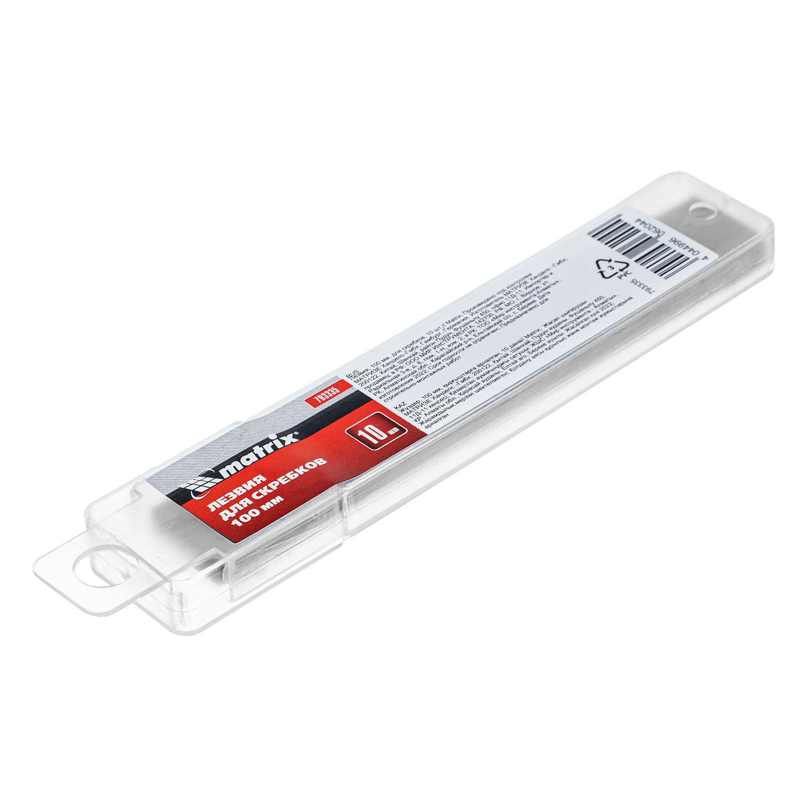 Лезвие, 100 мм, для скребков, 10 шт matrix. Бренд: Matrix Страна производства: Китай Толщина, мм: 0.4 Длина в упаковке, мм: 120 Вес (брутто), кг: 0.05 Лезвия: 10 шт Лезвия для скребков Matrix 793335, 10 шт., позволяют эффективно удалять загрязнения с различных гладких поверхностей: стекла, кафеля, керамики и т.д., а также счищать старое лакокрасочное покрытие. Рассчитаны на установку на скребки арт. 79545 и 79550. Длина кромки лезвия составляет 100 мм, поэтому ими удобно чистить большие площади. Преимущества Износостойкость остро заточенных лезвий достигается за счет углеродистой стали 60, закаленной до твердости 55-60 HRC. Десяти лезвий в комплекте достаточно для длительной эксплуатации. Удобный пластиковый бокс позволяет компактно и безопасно хранить и транспортировать лезвия.  развернуть описание ▼