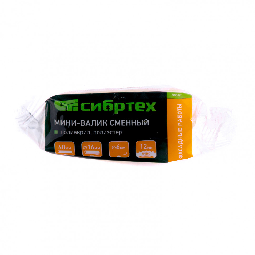 Мини-валик сменный фасадные работы, 60 мм, ворс 12 мм, D 16 мм, D ручки 6 мм, полиакрил, полиэстер сибртех