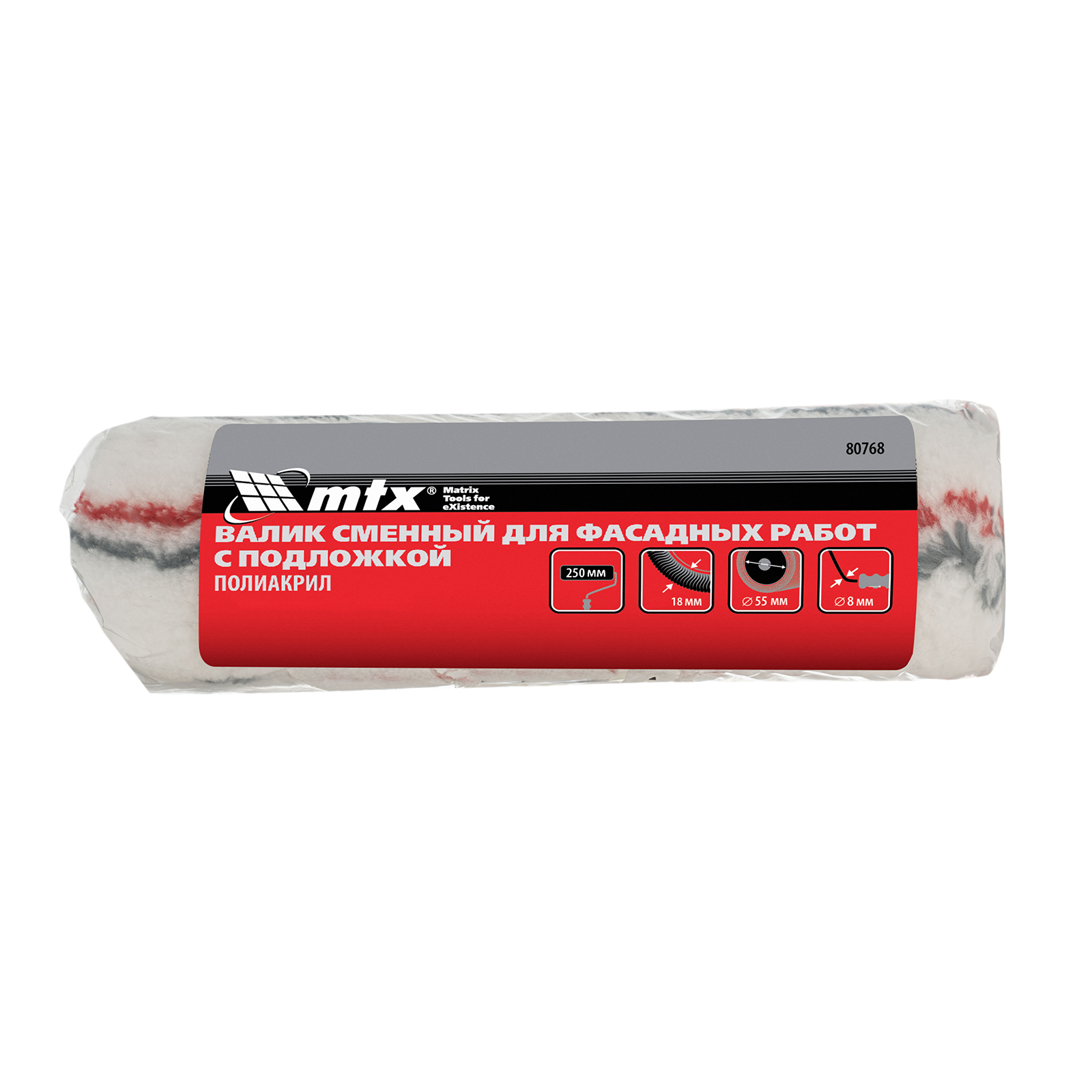 Валик сменный политекс, фасадный, 250 мм, ворс 18 мм, D 55 мм, D ручки 8 мм, полиакрил Mtx