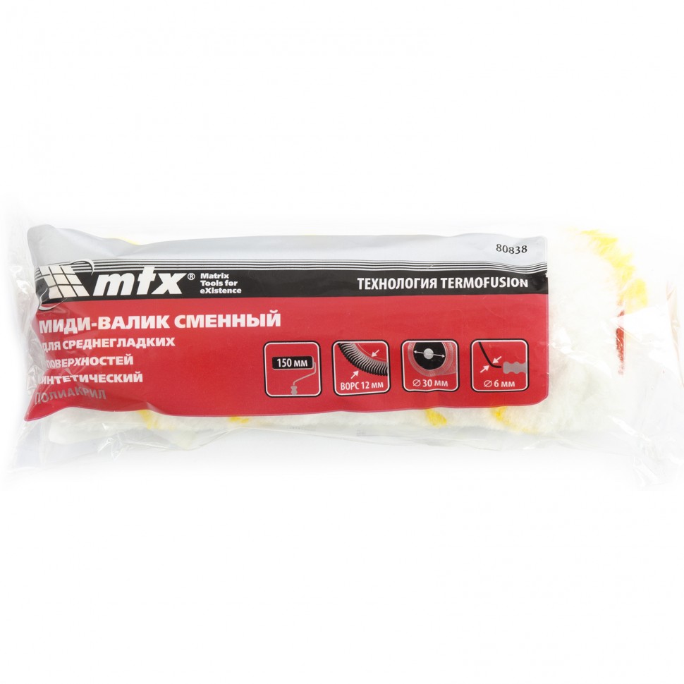 Миди-валик сменный для среднегладких поверхностей синтетический, 150 мм, ворс 12 мм, D 30 мм, D ручки 6 мм, полиакрил Mtx