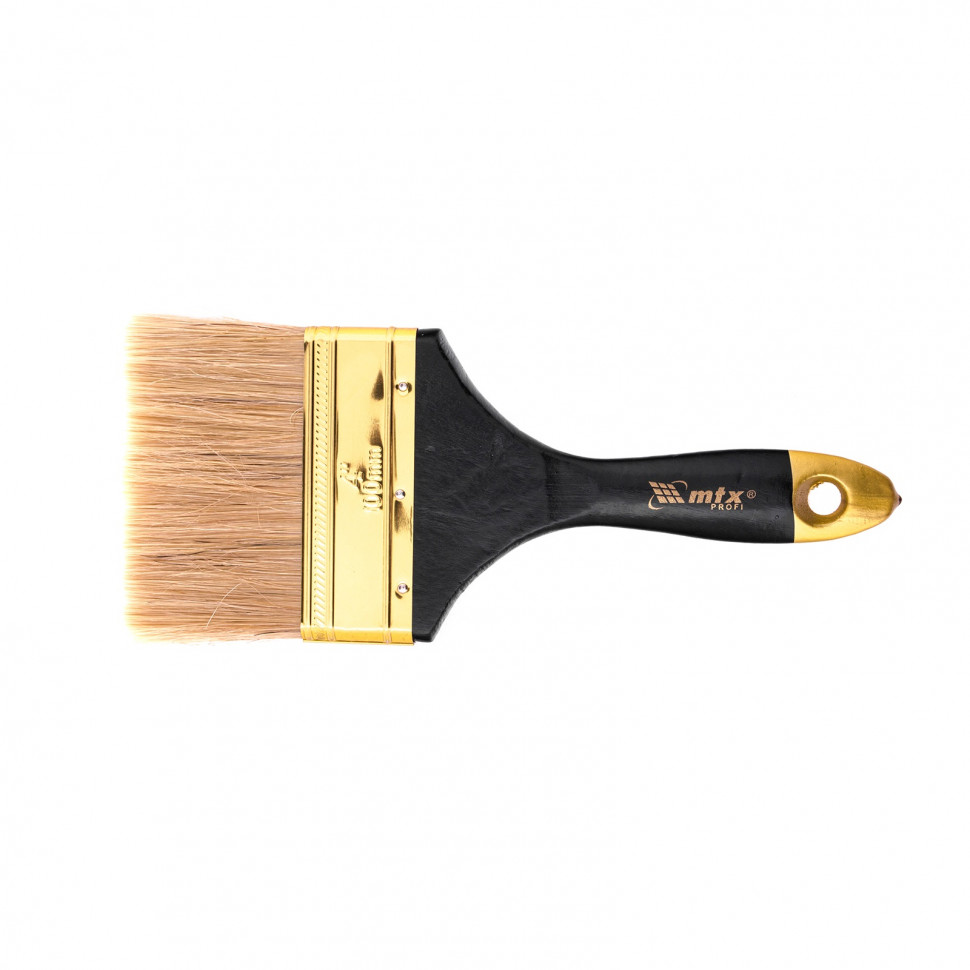 Плоская кисть «Профи» MTX 83155 шириной 4 дюйма, с натуральной щетиной и деревянной ручкой, рассчитана на профессиональное выполнение малярных работ. Натуральная щетина с увеличенной плотностью набивки подходит для нанесения различных типов ЛКМ, в том числе содержащих растворители.