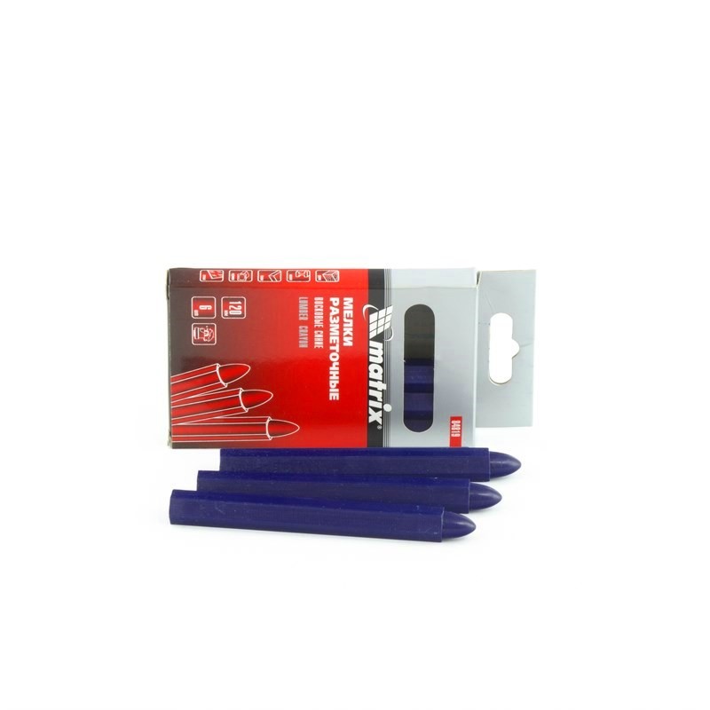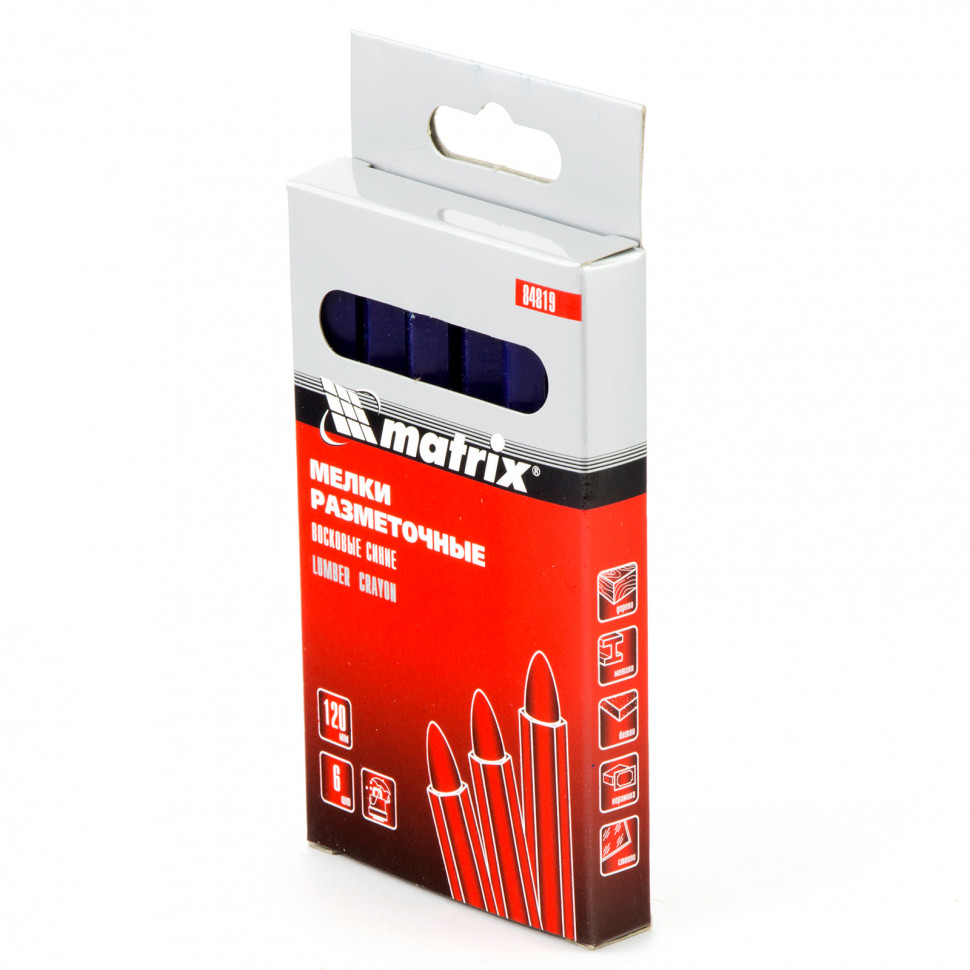 Мелки разметочные восковые синие, 120 мм, коробка 6 шт matrix. Бренд: Matrix Цвет: синий Страна производства: Китай Длина, мм: 120 Тип упаковки: цветная коробка Длина в упаковке, мм: 150 Ширина в упаковке, мм: 78 Вес (брутто), кг: 0.09 Мелки: 6 шт Синие разметочные восковые мелки Matrix 84819 длиной 120 мм, 6 шт. в коробке, предназначены для нанесения линий и различных обозначений. Универсальные мелки можно использовать на гладких и шероховатых поверхностях: бетоне, металле, пластике, керамике, стекле. Преимущества Водостойкость — мелки можно использовать на сухих и влажных поверхностях. Шестигранный корпус — мелки удобно лежат в руке и не скатываются с рабочей поверхности. Продуманная комплектация — шести мелков длиной по 120 мм хватит на долгое использование. Удобная упаковка — мелки поставляются в картонной коробке с европодвесом.  развернуть описание ▼