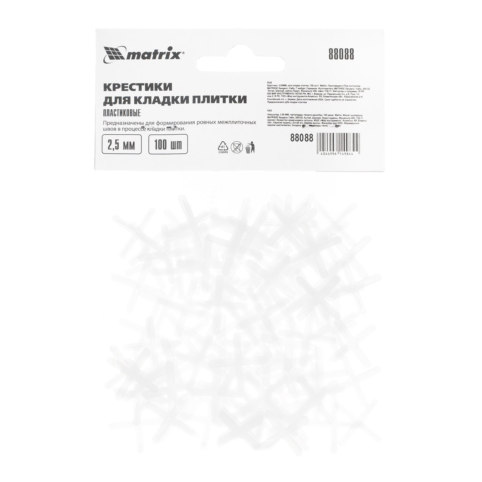 Крестики, 2.5 мм, для кладки плитки, 100 шт matrix. Бренд: Matrix Страна производства: Китай Тип упаковки: пакет с европодвесом Длина в упаковке, мм: 130 Вес (брутто), кг: 0.03 Крестики для плитки: 100 шт Крестики для кладки плитки Matrix 88088 толщиной 2,5 мм, 100 шт. в упаковке, используются для облицовки стен или пола и позволяют создать идеально ровные межплиточные швы. При помощи крестиков можно получить облицовочное покрытие высокой эстетической привлекательности. Преимущества Износостойкость — крестики изготовлены из пластмассы, устойчивой к химическим и механическим воздействиям. Удобная эксплуатация — крестики не прилипают к плитке и легко извлекаются из швов. Возможность многократного использования — изделия легко отмываются от клея простой водой.  развернуть описание ▼