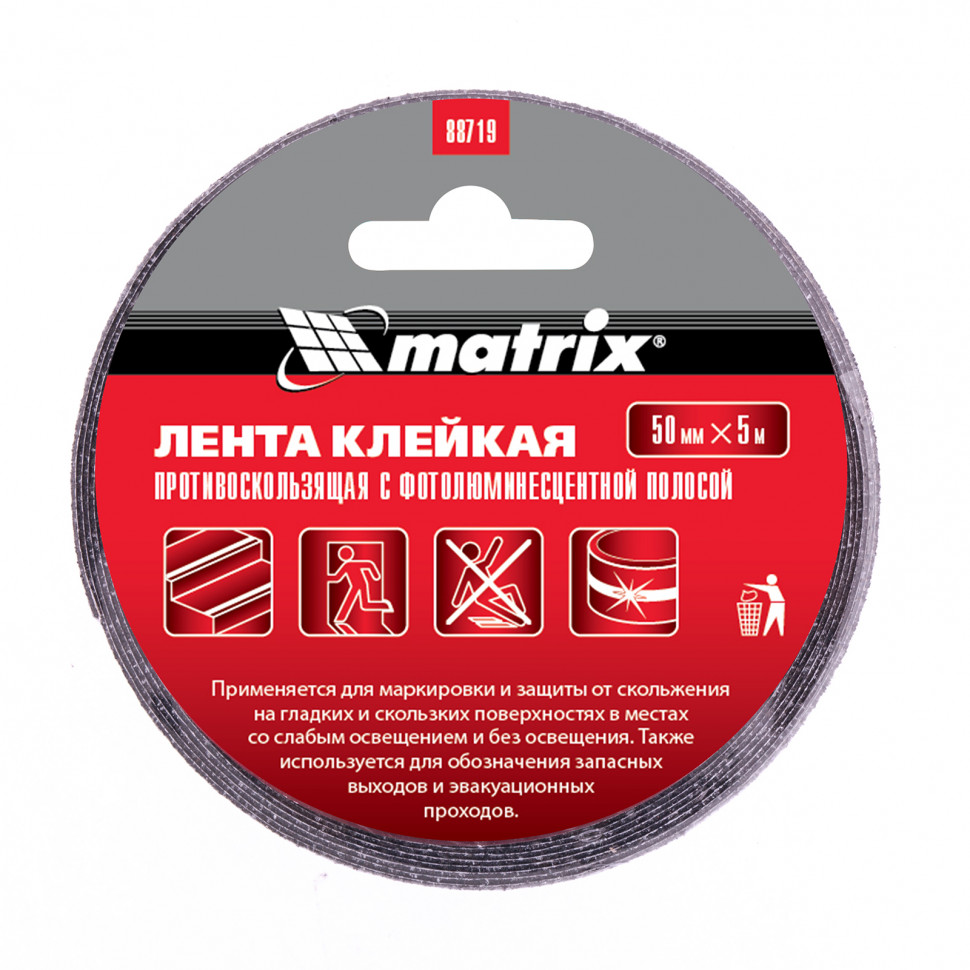 Клейкая противоскользящая лента Matrix 88719 c фотолюминесцентной полосой, размером 50 мм х 5 м, позволяет безопасно передвигаться по скользким поверхностям: лестницам, кафелю и т.д. Она снижает риск получения травм, поэтому пригодится в местах с большой проходимостью, например, в магазине или многоквартирном доме. Чтобы лента долго сохраняла высокие адгезионные свойства, следует производить монтаж при температуре выше +12 °C на сухую и очищенную поверхность.