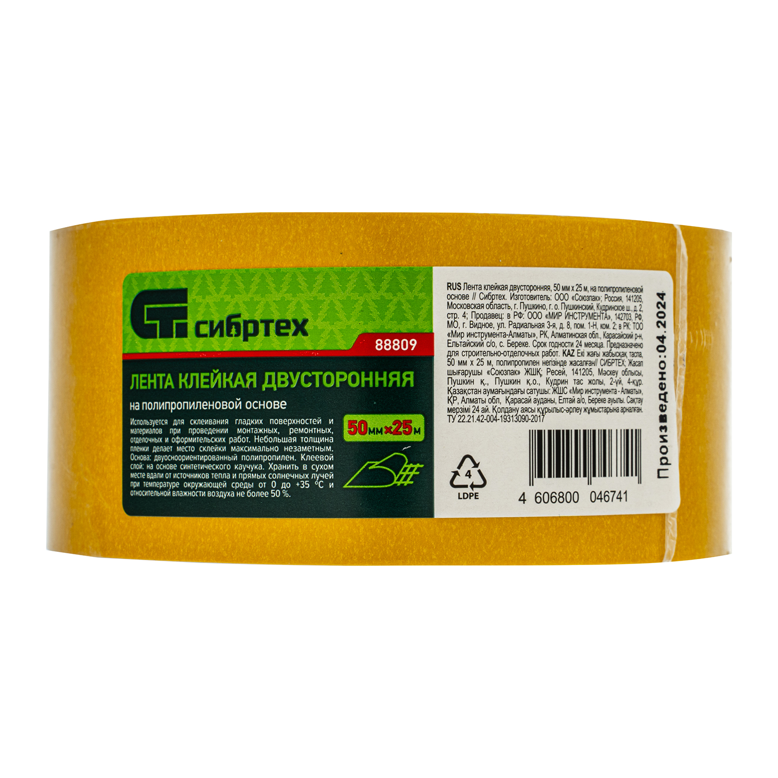 Лента клейкая двусторонняя, 50 мм х 25 м, на полипропиленовой основе сибртех