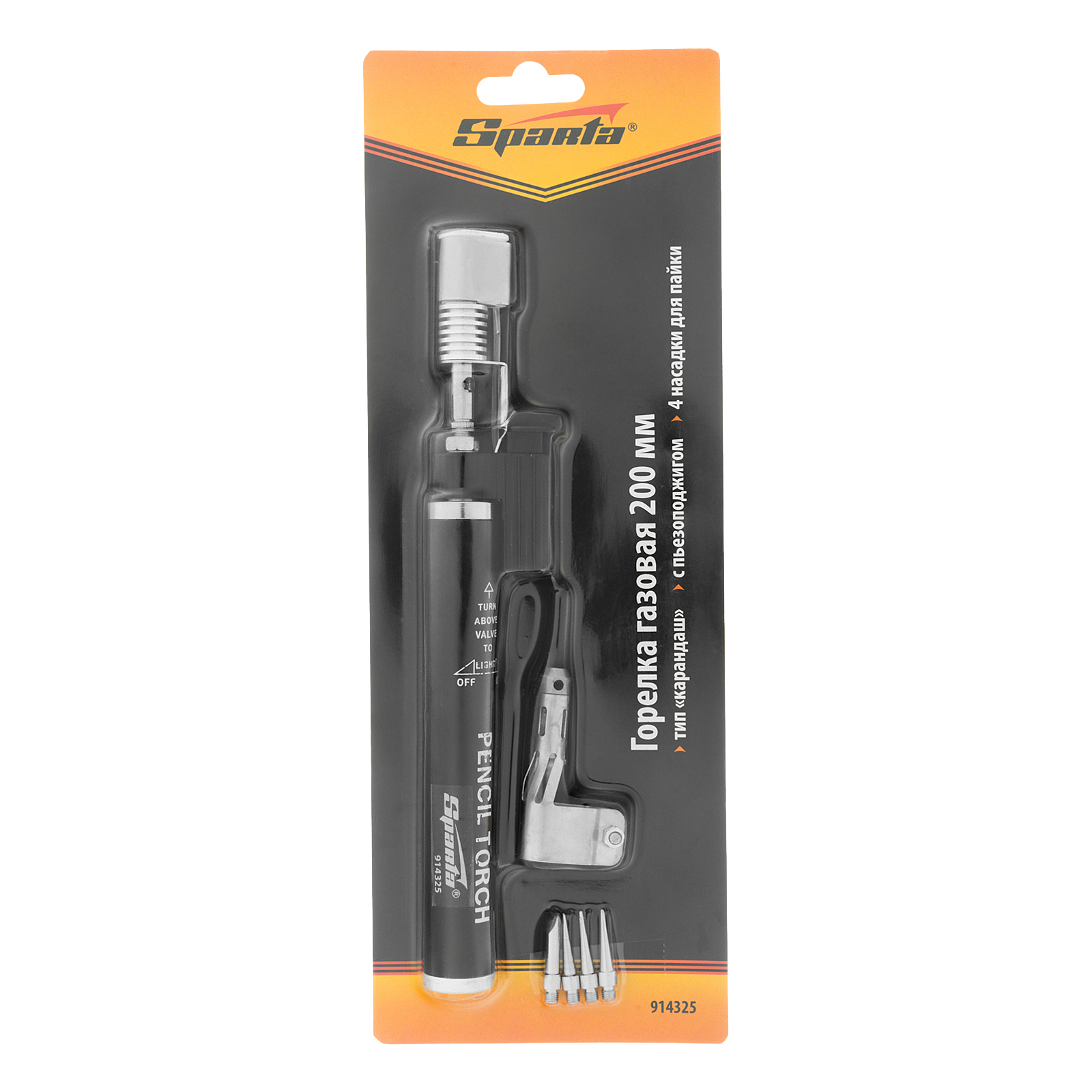 Горелка газовая, тип карандаш C пьезоподжигом + 4 насадки для пайки, 200 мм Sparta