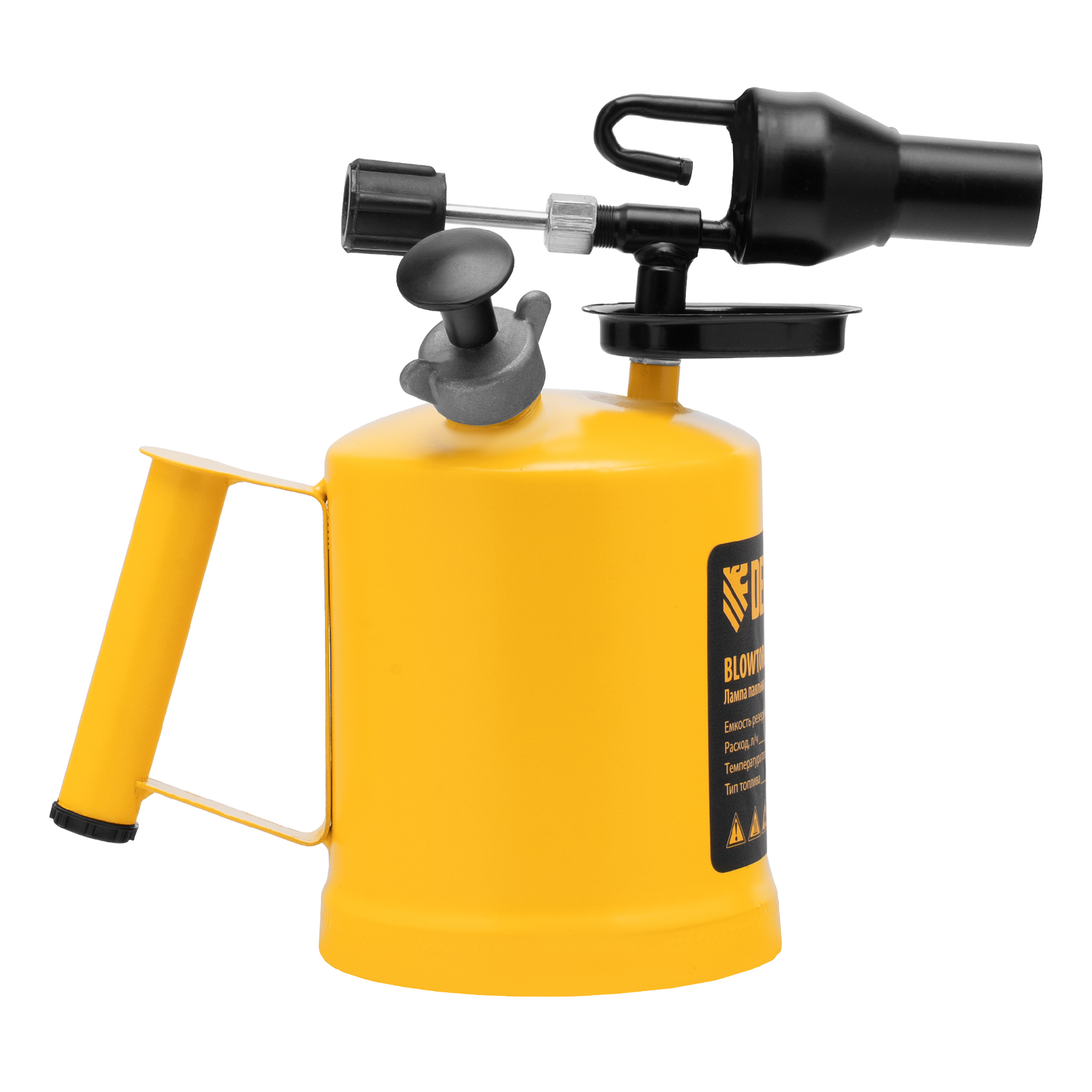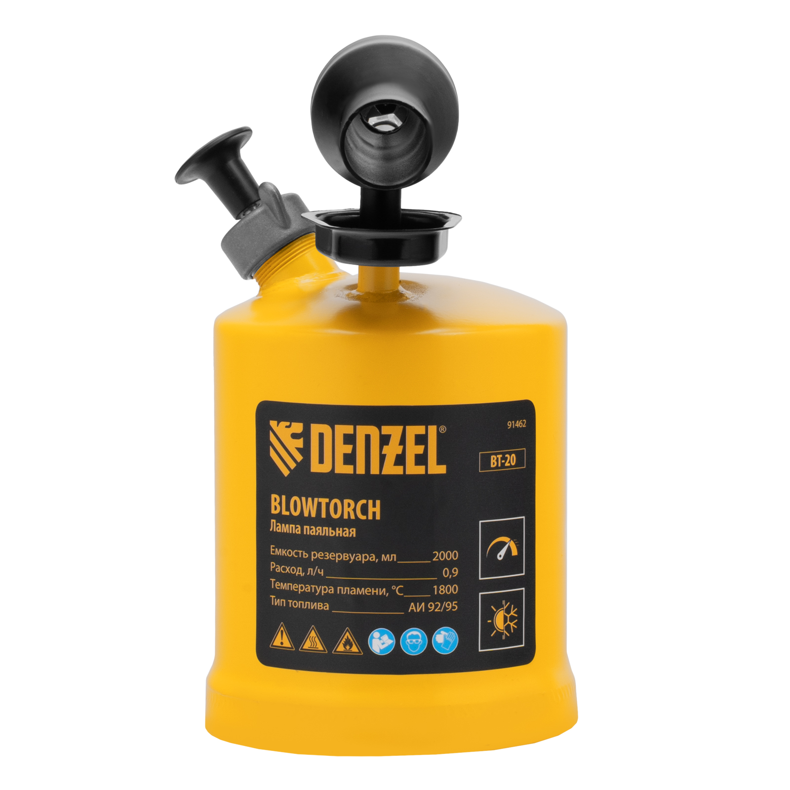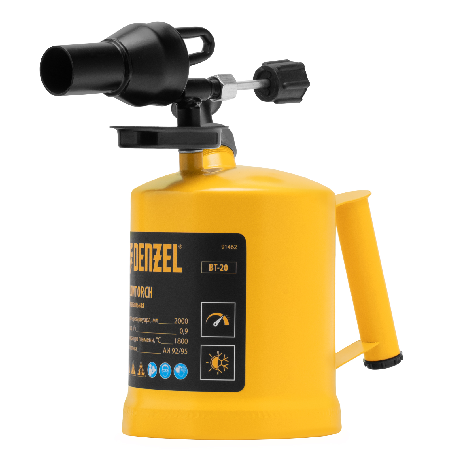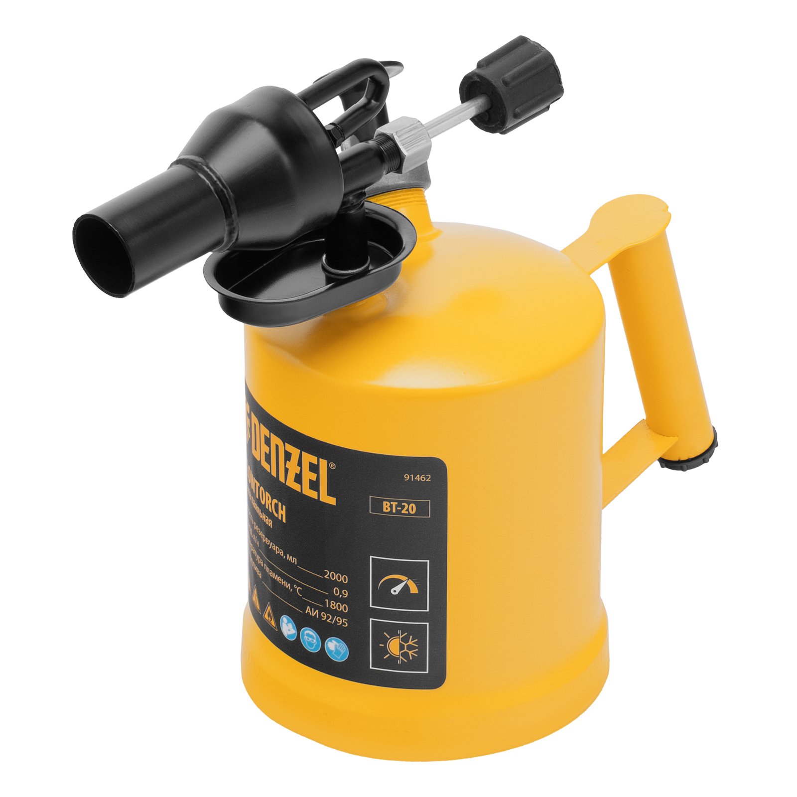 Паяльная лампа denzel, вт-20, 2 л. Бренд: DENZEL Тип пламени: открытое Страна бренда: Германия Страна производства: Китай Максимальная температура пламени, °C: 1800 Тип упаковки: картонная коробка Длина в упаковке, мм: 290 Ширина в упаковке, мм: 169 Высота в упаковке, мм: 280 Вес (брутто), кг: 1.73 Манжета насоса: 1 шт Паяльная лампа Denzel BT-20 91462 с баком объемом 2 л предназначена для нагрева поверхностей при помощи открытого направленного пламени. Полной заправки (1,5 л топлива) хватает больше чем на час работы при расходе 0,9 л/ч. Лампа используется при выполнении ремонтных и демонтажных работ: пайки, сварки, ослаблении заклинивших резьбовых соединений, опаливании древесины, снятии лакокрасочных покрытий и других термических работ. Также будет полезна в сельском хозяйстве и в быту. Преимущества Надежность и долговечность — корпус и рукоятка изготовлены из прочной стали ST-12. Легкая настройка — специальный винт позволяет регулировать подачу топлива и интенсивность пламени. Быстрый выход в рабочий режим и устойчивое пламя — лампа оснащена камерой предварительного нагрева сопла. Эргономичность — в рукоятке предусмотрен отсек для хранения ремкомплекта. Удобная заправка — в качестве топлива используется бензин АИ 92/95, имеющийся на любой АЗС.  развернуть описание ▼