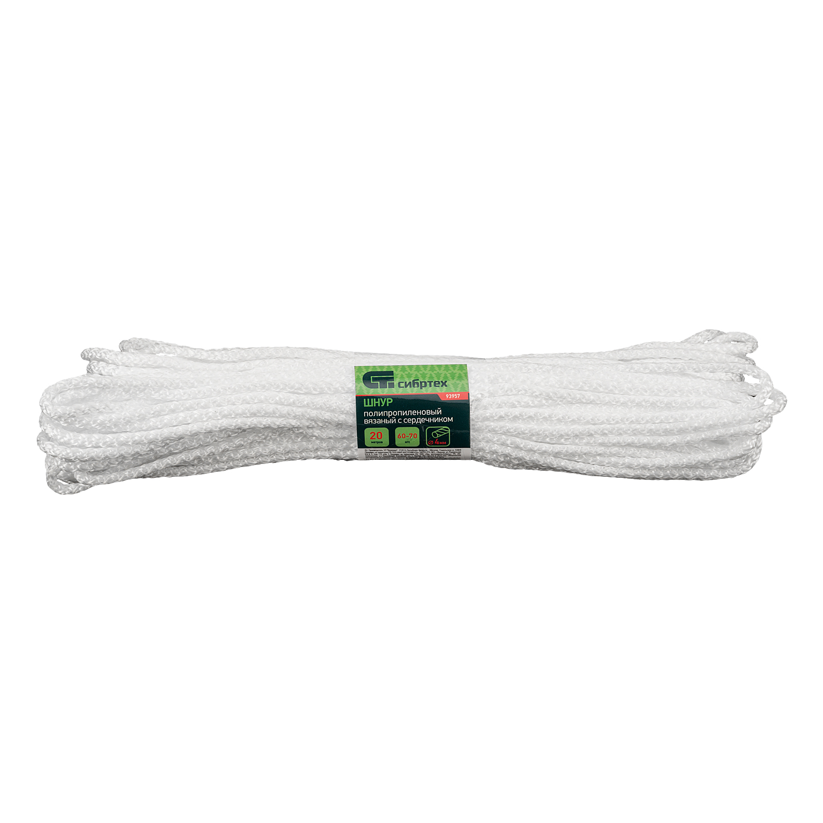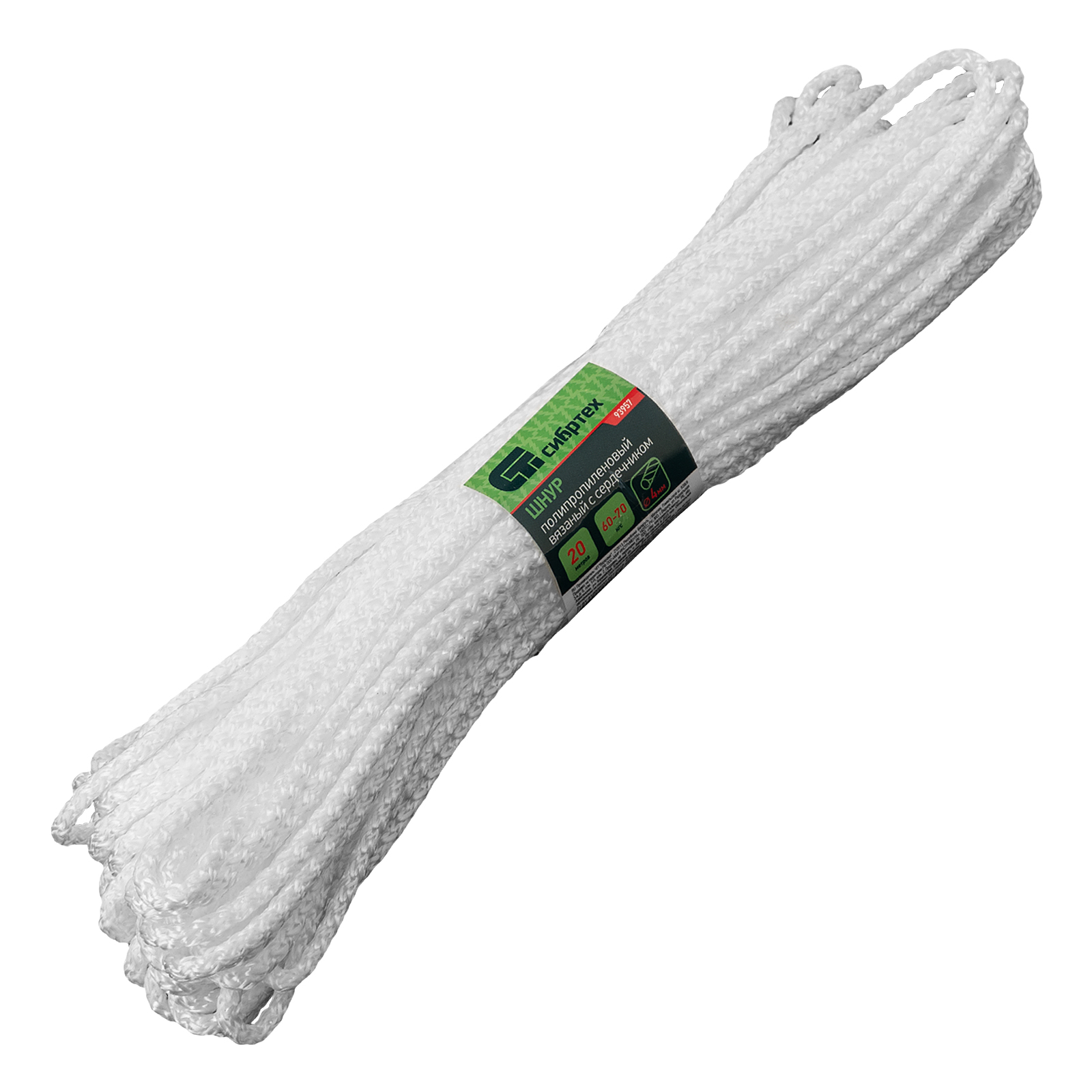 Шнур вязаный полипропиленовый с серд. белый, 4 мм, L 20 м, сибртех
