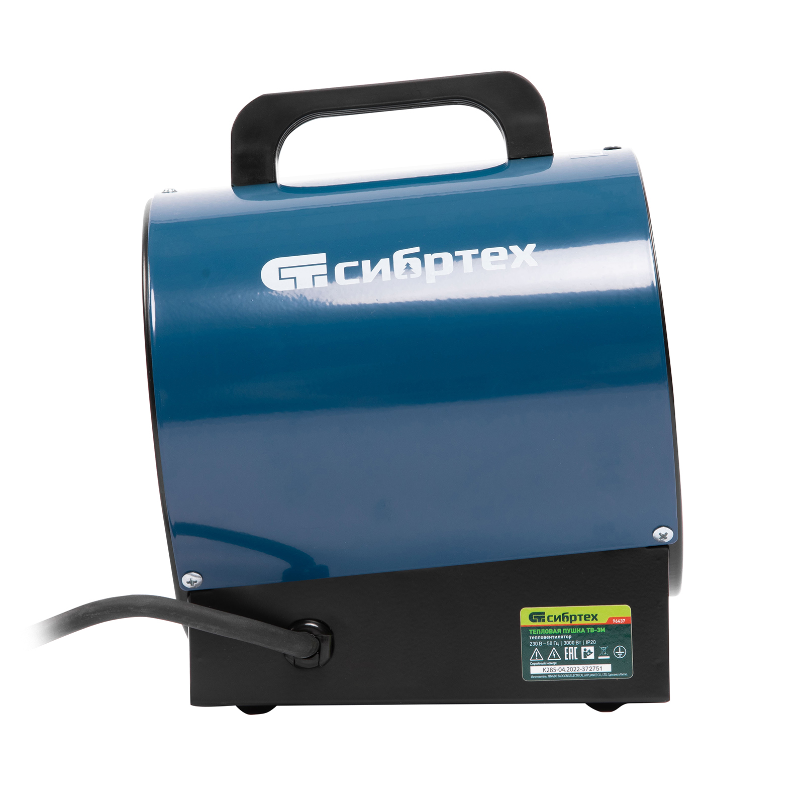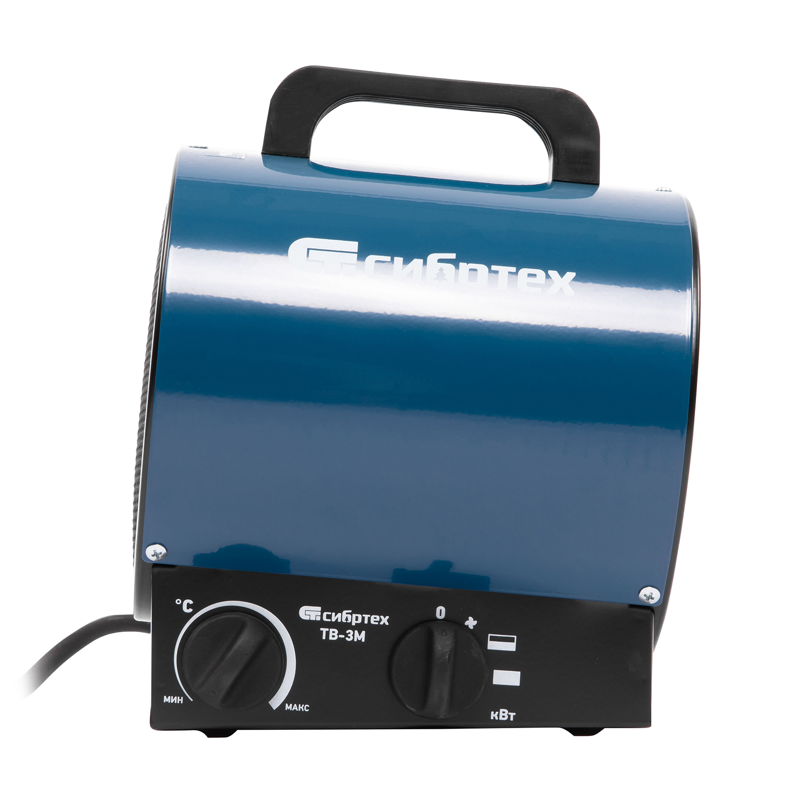 Тепловая пушка тв-3м (тепловентилятор) 230 в, 3 режима: вентилятор/1500 вт /3000 вт сибртех. Бренд: Сибртех Габариты: 240x210x255 мм Гарантия: 1 год Напряжение питающей сети: 230 В Особенности: защита от перегрева, наличие сетевой вилки Тип нагревательного элемента: ТЭН Страна бренда: Россия Страна производства: Китай Вес (нетто), кг: 3.1 Максимальный ток, А: 13.6 Производительность, м?u002Fч: 280 Тип упаковки: картонная коробка Длина в упаковке, мм: 240 Ширина в упаковке, мм: 210 Высота в упаковке, мм: 260 Вес (брутто), кг: 3.5 Тепловая пушка (тепловентилятор) Сибртех ТВ-3М 96437 питается от сети 230 В и работает в 3 режимах: вентилятор, нагрев на мощности 1500 и 3000 Вт. Предназначена для обогрева и вентиляции закрытых помещений площадью до 30 кв. м, а также дистанционной просушки предметов и поверхностей. В качестве нагревателя используется надежный круглый ТЭН из нержавеющей стали. Тепловентилятор можно использовать в производственном цехе, амбаре и на строительной площадке, а также в быту. Преимущества Защита от перегрева — если пушку по ошибке накроют тканью и корпус нагреется сверх допустимого предела, питание отключится для предотвращения поломки ТЭНа, а после остывания автоматически включится. Автономная работа — температура поддерживается на заданном уровне при помощи термостата. Эффективность — цилиндрическая форма обеспечивает эффективный теплообмен и способствует созданию направленного воздушного потока, что ускоряет просушивание поверхностей и предметов. Надежная конструкция — корпус изготовлен из прочной листовой стали, боковые решетки предотвращают попадание крупных частиц к вентилятору и ТЭНу (класс защиты IP20). Устойчивость — благодаря широкой опоре тепловая пушка не опрокидывается во время эксплуатации. Удобная транспортировка — благодаря небольшому весу 3,5 кг и эргономичной рукоятке пушку легко перемещать и устанавливать.  развернуть описание ▼