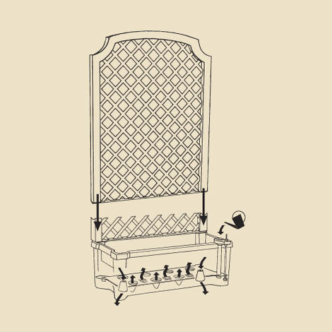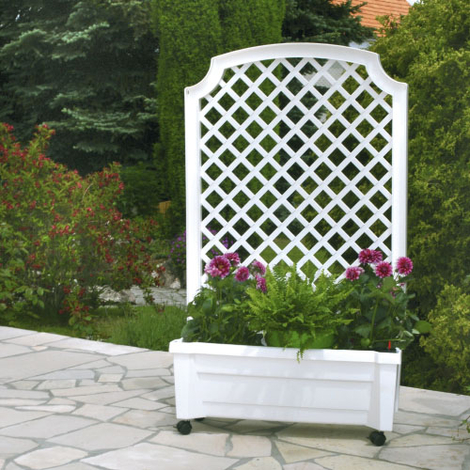 Ящик для растений с шпалерой на колесах калипсо, белый. Садовое декоративное ограждение KHW Калипсо с клумбой станет замечательным украшением вашего садового участка. В специальный ящик-клумбу можно посадить ваши любимые цветы и растения. Шпалера будет поддерживать растения и направлять их рост. А специальная система орошения позаботиться о растениях, когда вас не будет рядом.. Также данную конструкцию можно использовать с целью зонирования пространства на вашем загородном участке. Среди преимуществ данной модели можно отметить высокую прочность и легкую сборку. А благодаря наличию колес ящик можно легко перемещать с одного места на другое. • Вес нетто: 5,05 кг • Размер изделия (ДхШхВ): 79х35х134 см • Размер ящика (ДхШхВ): 79х35х33 см • Объем ящика: 42 л • Материал: полипропилен • Цвет: белый • Вес брутто: 7,65 кг • Количество коробок: 2 штуки • Размеры коробок: 1 - 122х81х6,6 см; 2 - 82х35х28 см • Производство: KHW Kunststoff-und Holzverarbeitungswerk GmbH • Страна: Германия