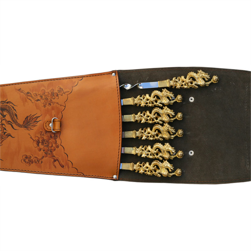 Колчан с шампурами. 1. Колчан для шампуров из натуральной кожи с росписью ручной работы (730×230×45 мм) 1 шт. 2. Шампур из нержавеющей стали с цельнолитой рукоятью из латуни в виде дракона (общая длина шампура — 68 см: длина полотна — 56 см, длина рукояти — 12 см) 6 шт. 3. Чехол из спанбонда (мягкий нетканый материал) 1шт.