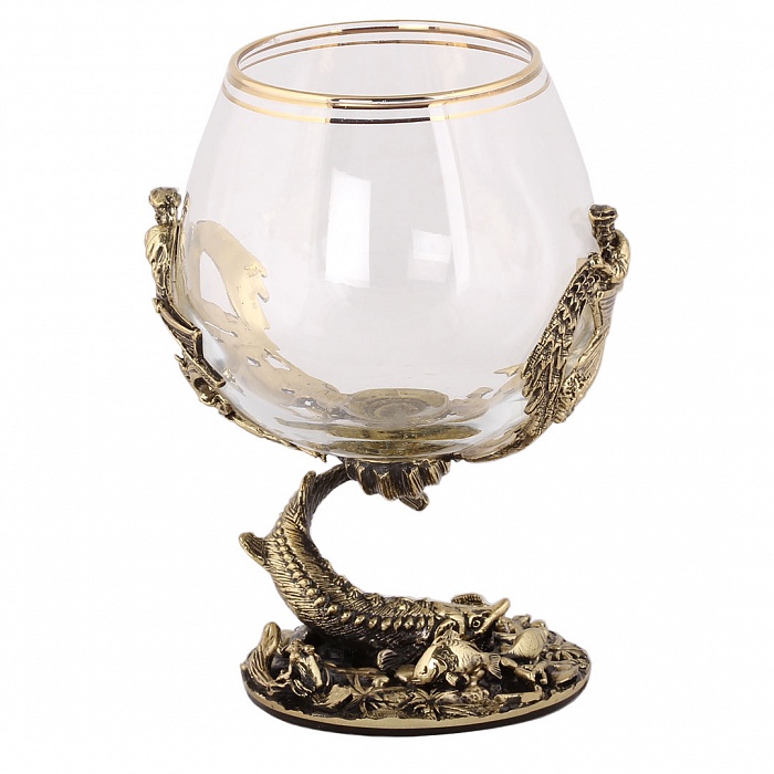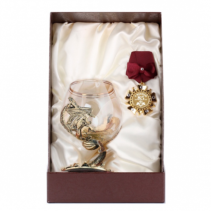 Бокал для коньяка осетр +орден с юбилеем 85 лет, к/к с накладкой. Код товара: 220226 Основной материал: Бокал: латунь,стекло, Орден, Упаковка: картонный футляр Размер: Высота бокала 13 см Диаметр бокала 6 см Объем 310 мл Упаковка:17х14х10см