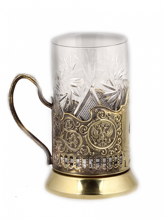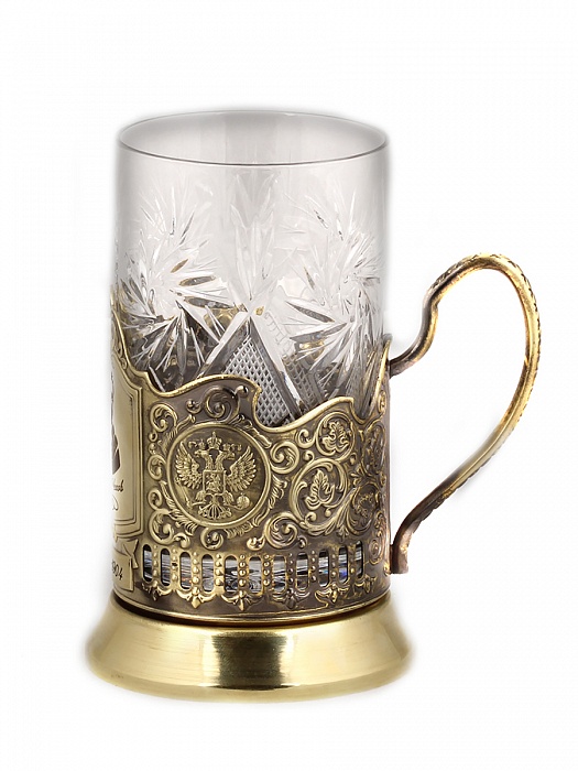 Детали: В наборе:латунированный подстаканник, хрустальный стакан, ложка. Подарочный футляр с накладкой